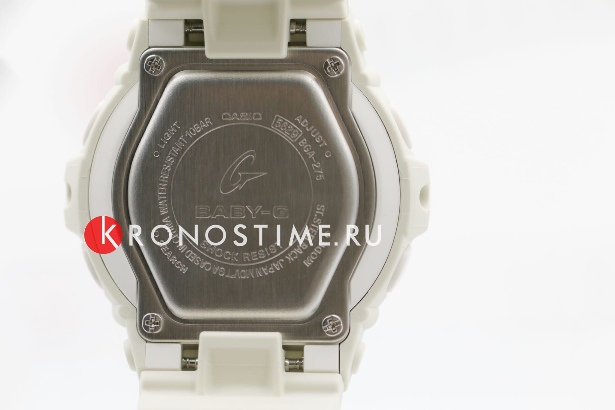 Женские японские наручные часы с противоударнымУдаропрочный корпусМеханизм заключён в корпус, выполненный из современных материалов, устойчивых к ударам, механическим повреждениям и падению с высоты: инновационный пластик, карбон, нержавеющая сталь, титан. корпусом Casio Baby-G BGA-275-7A. Функциональность данной модели: формат времени 12/24, мировое времяМировое время Полезное часовое усложнение, отображающее время в основных городах и известных областях по всему миру, оно связано с часовыми поясами, удобно для путешественников и бизнесменов. 48 городов (29 часовых поясов), вечный календарьВечный календарьКлассическое часовое усложнение, представляющее собой календарь, рассчитанный на несколько лет вперёд (стандартно – до 2099 года). Определяет текущую дату, день недели, месяц. до 2099 года, функция летнего времени, 5 независимых будильниковБудильникБуди́льник — часы, в заданный момент времени подающие звуковой, световой и/или в редких случаях другой сигнал., сигнал начала часа, секундомерСекундомерСекундоме́р — прибор, способный измерять интервалы времени с точностью до долей секунды. с точностью 1/100 секунды и измерением до 23 часов 59 минут 59,99 cек., таймер обратного отсчета (диапазон времени 24 часа), светодиодная подсветкаСветодиодная подсветкаСветодиодная или LED-подсветка обеспечивает появление яркого холодного свечения за счёт LED-элементов - маленьких лампочек. Они потребляют минимальное количество энергии, чаще всего можно встретить 1 светодиод, в нижней части циферблата. циферблата с функцией послесвечения, функция выключения звука нажатия кнопок. Стрелки покрыты необритовым (NeobriteПодсветка NeobriteИспользование светонакопительных составов на основе сульфида цинка или алюмината стронция, яркий свет можно наблюдать на протяжении 6-10 часов после «зарядки» часов около источника света.) люминесцентнымЛюминесцентное покрытиеПозволяет считывать показания времени в темноте. Производители наносят на стрелки, часовые индексы, безель или поверхность циферблата светонакопительный состав, дающий холодное свечение. напылением (светятся в темноте).
