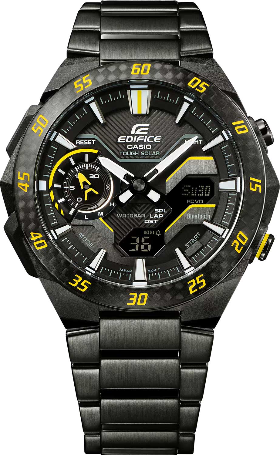 Модель Casio Edifice ECB-2200RC-1A9 из коллекции Edifice сочетает передовые технологии и динамичный спортивный стиль. Корпус выполнен из углеродного волокнаCarbon Core Guard Новейшая структура корпуса, разработанная Casio. Полиуретановая пластина дополнительно усилена карбоновыми вставками, что придаёт специальную защиту от механических повреждений. Карбон отличается лёгкостью и прочностью., усиленного смолой, что обеспечивает прочность и легкость и стальной безельБезельВнешний ободок, закрепляющий стекло. В спортивных часах так называется поворотное кольцо с делениями на циферблате, выполняет роль таймера – замеряет отрезки времени на шкале. Неподвижный безель – элемент декора. Однонаправленно вращающийся безель на дайверских часах позволяет фиксировать моменты погружения и выныривания на поверхность. с PVD-покрытиемPVDУльтратонкое покрытие наносится в технике вакуумного напыления, сочетает в себе нитрид титана особой прочности со слоем золота или оксида хрома. Несёт в себе декоративную или защитную функцию.. Циферблат с металлическими метками и объемными элементами подчеркивает автоспортивный характер модели. Часы оснащены Bluetooth®-синхронизациейBluetoothСовременная технология, позволяющая синхронизировать часы с телефоном и переносить данные. Часы с Bluetooth расширяют возможности вашего смартфона и делают его использование ещё более удобным., позволяющей автоматически корректировать время, управлять мировым временемМировое время Полезное часовое усложнение, отображающее время в основных городах и известных областях по всему миру, оно связано с часовыми поясами, удобно для путешественников и бизнесменов. и передавать данные секундомера через приложение CASIO WATCHES. Солнечная батарея Tough SolarTough SolarТехнология основана на подзарядке аккумулятора от источника солнечного света, специальная панель улавливает солнечные лучи и преобразует их в энергию для работы часов. Достаточно пары минут нахождения на солнце для функционирования часов в течении суток. преобразует свет в энергию, обеспечивая бесперебойную работу. Дополнительные функции включают таймер обратного отсчетаТаймерОтсчитывает секунды в обратном направлении в заданном интервале времени. с индикатором на отметке 9 часов, будильникБудильникБуди́льник — часы, в заданный момент времени подающие звуковой, световой и/или в редких случаях другой сигнал., секундомерСекундомерСекундоме́р — прибор, способный измерять интервалы времени с точностью до долей секунды. и двойную светодиодную подсветку Super IlluminatorСветодиодная подсветкаСветодиодная или LED-подсветка обеспечивает появление яркого холодного свечения за счёт LED-элементов - маленьких лампочек. Они потребляют минимальное количество энергии, чаще всего можно встретить 1 светодиод, в нижней части циферблата. для удобного чтения показаний в темноте. Стальной браслет с IP-покрытиемIP-покрытиеМетод ионного напыления. Демонстрирует повышенную устойчивость к истиранию, окислению и химическим веществам. Под воздействием высокого давления и температуры около 1500°C молекулы металла надёжно соединяются с частицами корпуса часов. на раскладной застёжкеРаскладная застёжкаТакой тип застёжки используется только на браслетах из металла. Она никогда не раскрывается полностью, происходит разделение на 2 и более частей. Раскладывающая зас