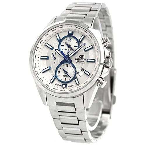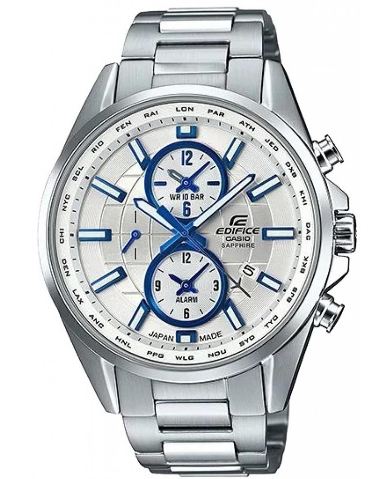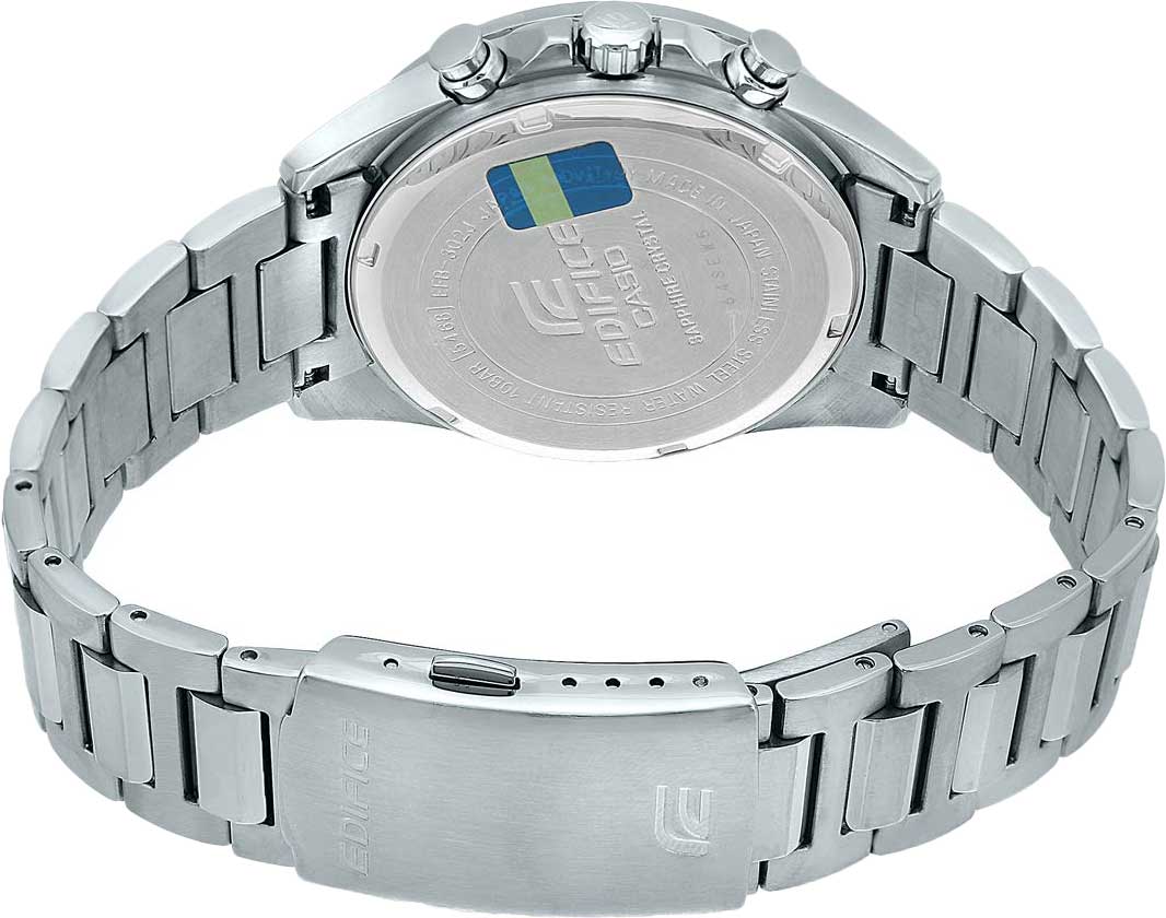 Японские мужские наручные часы на солнечной батарее Casio Edifice EFB-302JD-7A, кварцевый механизм с высокой точностью. Сапфировое стеклоСапфировое стеклоПрочный и надёжный материал из кристалла сапфира синтетического происхождения, характеризующийся особой твёрдостью и устойчивостью к царапинам и повреждениям. устойчивое к появлению царапин, обладающее высокой прозрачностью. Класс водозащиты: 100 метров, позволит плавать, нырять и заниматься другими водными видами спорта. Корпус часов изготовлен из стали. Стальной браслет на раскладной застёжкеРаскладная застёжкаТакой тип застёжки используется только на браслетах из металла. Она никогда не раскрывается полностью, происходит разделение на 2 и более частей. Раскладывающая застёжка снизит вероятность потери часов к минимуму.. Стрелки и метки с люминесцентным покрытиемЛюминесцентное покрытиеПозволяет считывать показания времени в темноте. Производители наносят на стрелки, часовые индексы, безель или поверхность циферблата светонакопительный состав, дающий холодное свечение..