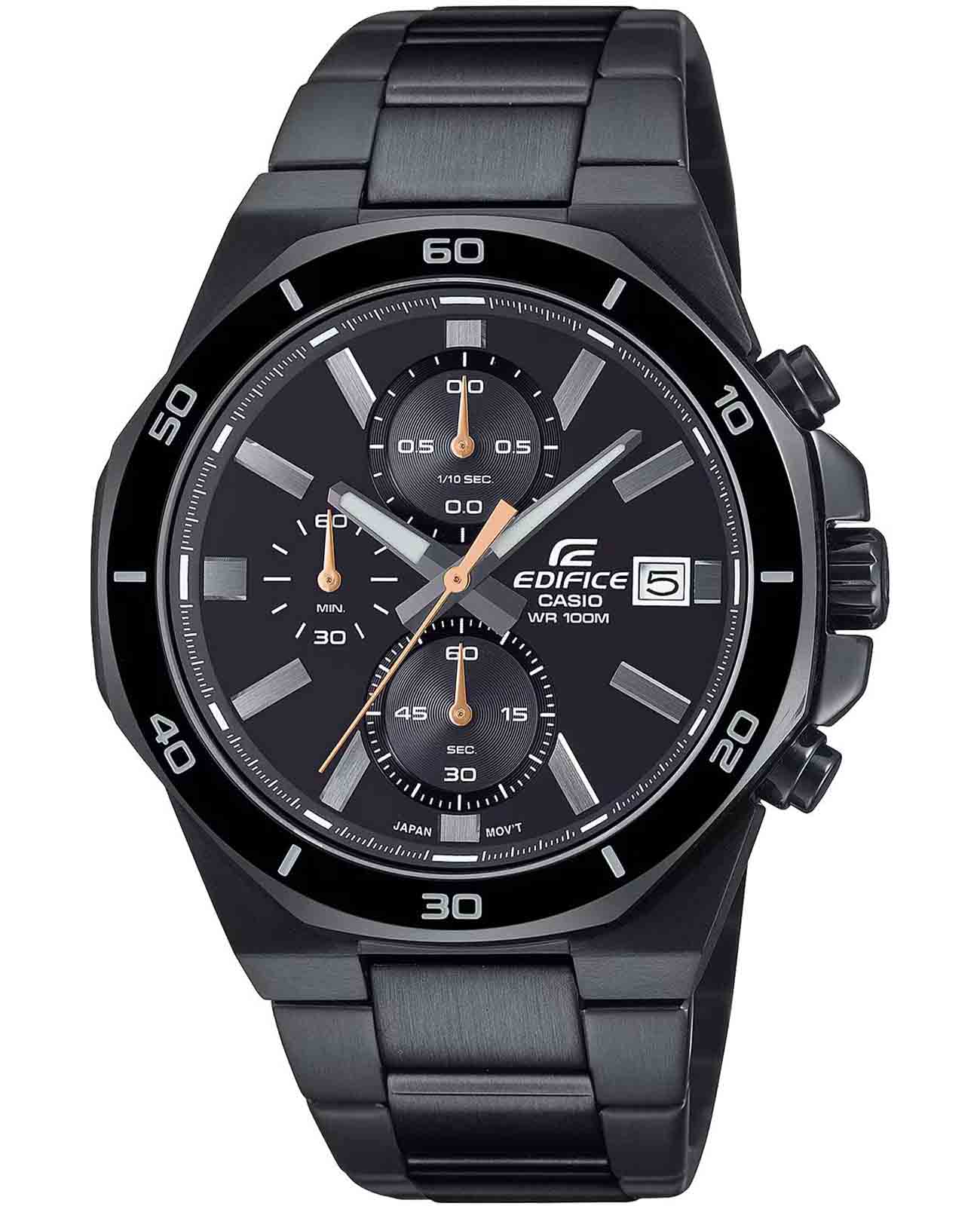 Мужские часы-хронографХронографФункция позволяет измерять отрезки времени с особой точностью: часы, минуты, секунды. Верным признаком хронографа является наличие на циферблате 3 дополнительных окошек-счётчиков. Casio Edifice EFV-640DC-1A, кварцевый механизм с высокой точностью. Минеральное стеклоМинеральное стеклоМинеральное стекло представляет собой искусственно выращенный минерал кварца. Такое стекло отличается особой устойчивостью к повреждениям и царапинам. Уступает по некоторым качествам сапфировому стеклу. устойчивое к появлению царапин, обладающее высокой прозрачностью. СекундомерСекундомерСекундоме́р — прибор, способный измерять интервалы времени с точностью до долей секунды. с точностью показаний 1/10с и временем измерения 1ч. Корпус и браслет изготовлены из нержавеющей стали с IP-покрытиемIP-покрытиеМетод ионного напыления. Демонстрирует повышенную устойчивость к истиранию, окислению и химическим веществам. Под воздействием высокого давления и температуры около 1500°C молекулы металла надёжно соединяются с частицами корпуса часов.. Циферблат выполнен по технологии Sunray (солнечные лучи). Метки в виде штрихов. На циферблате три дополнительных индикатора, окошко даты в положении 3 часов. Стрелки с люминесцентным покрытиемЛюминесцентное покрытиеПозволяет считывать показания времени в темноте. Производители наносят на стрелки, часовые индексы, безель или поверхность циферблата светонакопительный состав, дающий холодное свечение.. Класс водозащиты: 100 метров, позволит плавать, нырять и заниматься другими водными видами спорта. Заводная головка с защитой. Батарея рассчитана на 2 года. Стальной браслет на раскладной застёжкеРаскладная застёжкаТакой тип застёжки используется только на браслетах из металла. Она никогда не раскрывается полностью, происходит разделение на 2 и более частей. Раскладывающая застёжка снизит вероятность потери часов к минимуму..