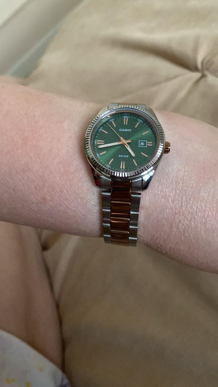 Японские женские часы Casio Collection LTP-1302PRG-3AVEF с минеральным стекломМинеральное стеклоМинеральное стекло представляет собой искусственно выращенный минерал кварца. Такое стекло отличается особой устойчивостью к повреждениям и царапинам. Уступает по некоторым качествам сапфировому стеклу.. Светящееся покрытие обеспечивает длительную подсветку в темное время суток после короткого воздействия света. Корпус выполнен из гипоаллергенной латуни. Модель комплектуется надёжным механизмом, точность хода которого составляет +/- 20 сек/мес. Стрелки с люминесцентным покрытиемЛюминесцентное покрытиеПозволяет считывать показания времени в темноте. Производители наносят на стрелки, часовые индексы, безель или поверхность циферблата светонакопительный состав, дающий холодное свечение.. Стальной браслет на раскладной застёжкеРаскладная застёжкаТакой тип застёжки используется только на браслетах из металла. Она никогда не раскрывается полностью, происходит разделение на 2 и более частей. Раскладывающая застёжка снизит вероятность потери часов к минимуму. с IP-покрытиемIP-покрытиеМетод ионного напыления. Демонстрирует повышенную устойчивость к истиранию, окислению и химическим веществам. Под воздействием высокого давления и температуры около 1500°C молекулы металла надёжно соединяются с частицами корпуса часов.. Окошко даты находится в положении 3 часа. Водонепроницаемость 50 метров, позволит защитить корпус от случайных брызг или капель дождя.