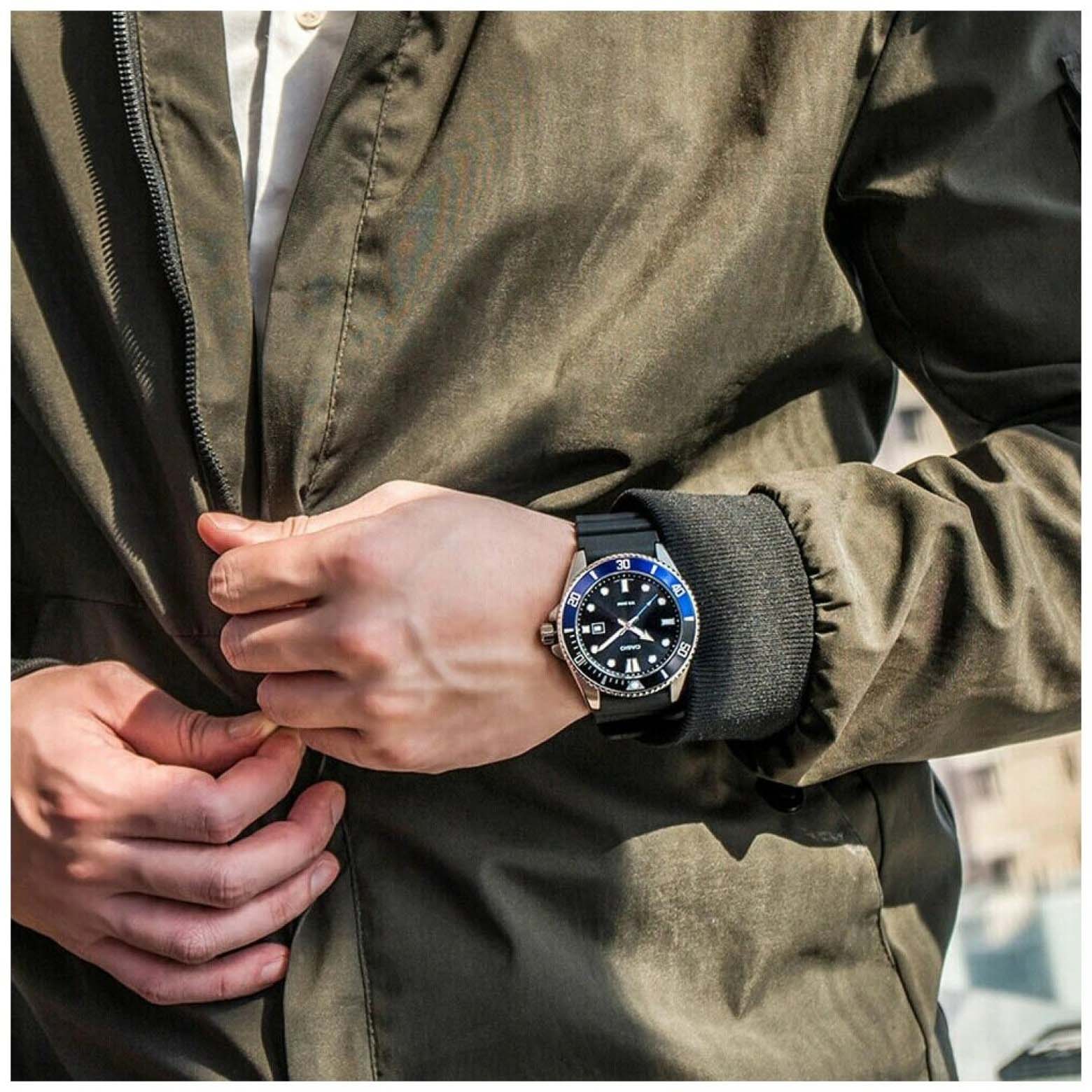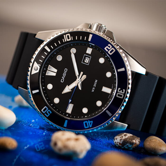 Японские мужские кварцевые часы с минеральным стекломМинеральное стеклоМинеральное стекло представляет собой искусственно выращенный минерал кварца. Такое стекло отличается особой устойчивостью к повреждениям и царапинам. Уступает по некоторым качествам сапфировому стеклу. Casio Collection MDV-107-1A2, кварцевый механизм с высокой точностью. Корпус часов изготовлен из нержавеющей стали. Вращающийся безельБезельВнешний ободок, закрепляющий стекло. В спортивных часах так называется поворотное кольцо с делениями на циферблате, выполняет роль таймера – замеряет отрезки времени на шкале. Неподвижный безель – элемент декора. Однонаправленно вращающийся безель на дайверских часах позволяет фиксировать моменты погружения и выныривания на поверхность. из нержавеющей стали с IP-покрытиемIP-покрытиеМетод ионного напыления. Демонстрирует повышенную устойчивость к истиранию, окислению и химическим веществам. Под воздействием высокого давления и температуры около 1500°C молекулы металла надёжно соединяются с частицами корпуса часов.. Стрелки  с люминесцентным покрытиемЛюминесцентное покрытиеПозволяет считывать показания времени в темноте. Производители наносят на стрелки, часовые индексы, безель или поверхность циферблата светонакопительный состав, дающий холодное свечение.. Окошко даты находится в положении 3 часа. Класс водозащиты: 200 метров, позволит плавать, нырять и заниматься другими водными видами спорта. Ремешок с классической застежкой.
