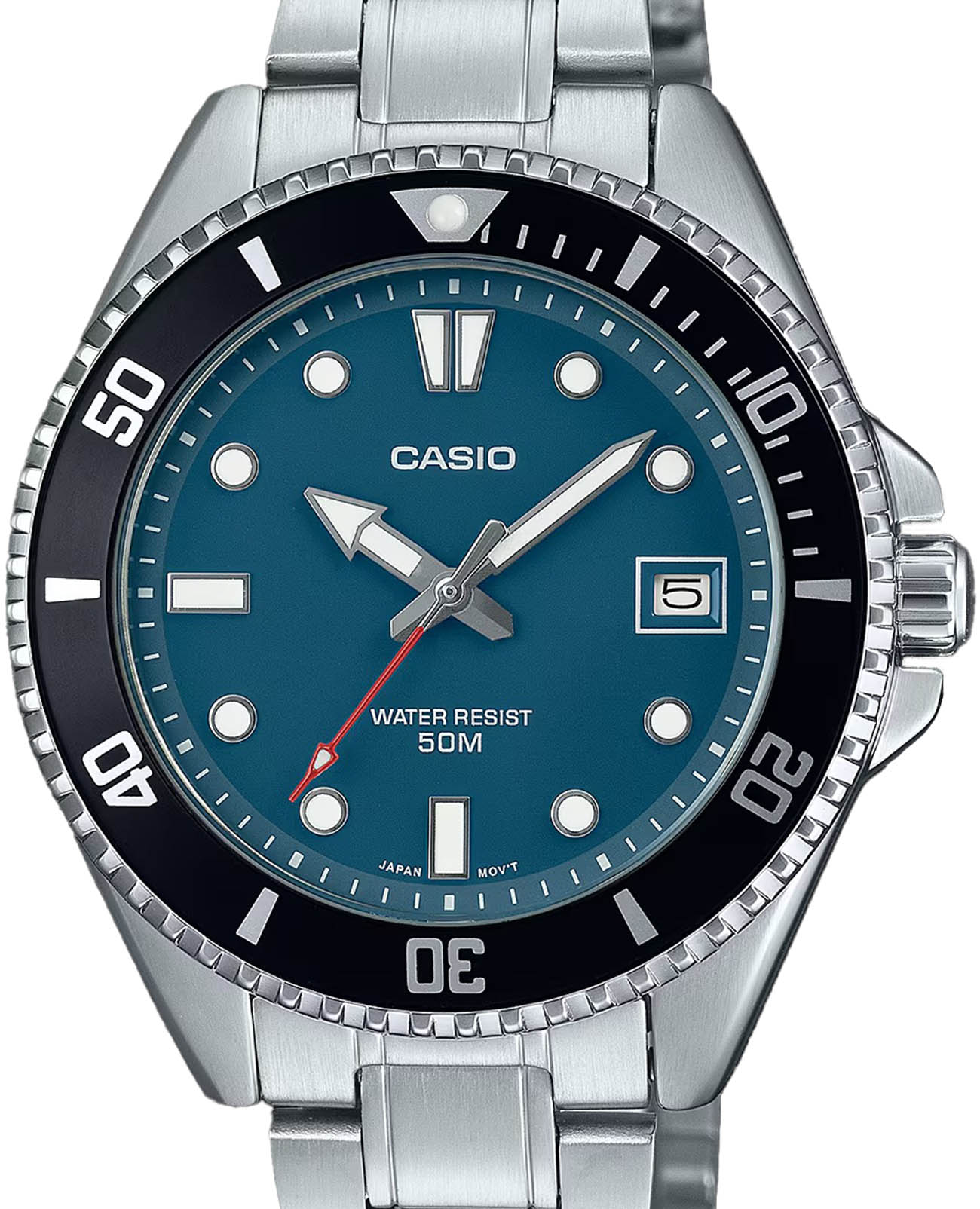 Японские мужские кварцевые часы с минеральным стекломМинеральное стеклоМинеральное стекло представляет собой искусственно выращенный минерал кварца. Такое стекло отличается особой устойчивостью к повреждениям и царапинам. Уступает по некоторым качествам сапфировому стеклу. Casio Collection MDV-10D-2A1V, кварцевый механизм с высокой точностью. Корпус и браслет часов изготовлены из нержавеющей стали. Вращающийся безельБезельВнешний ободок, закрепляющий стекло. В спортивных часах так называется поворотное кольцо с делениями на циферблате, выполняет роль таймера – замеряет отрезки времени на шкале. Неподвижный безель – элемент декора. Однонаправленно вращающийся безель на дайверских часах позволяет фиксировать моменты погружения и выныривания на поверхность. из нержавеющей стали с IP-покрытиемIP-покрытиеМетод ионного напыления. Демонстрирует повышенную устойчивость к истиранию, окислению и химическим веществам. Под воздействием высокого давления и температуры около 1500°C молекулы металла надёжно соединяются с частицами корпуса часов.. Стрелки и метки с люминесцентным покрытиемЛюминесцентное покрытиеПозволяет считывать показания времени в темноте. Производители наносят на стрелки, часовые индексы, безель или поверхность циферблата светонакопительный состав, дающий холодное свечение.. Окошко даты находится в положении 3 часа. Класс водозащиты: 50 метров, позволит защитить корпус от случайных брызг или капель дождя.