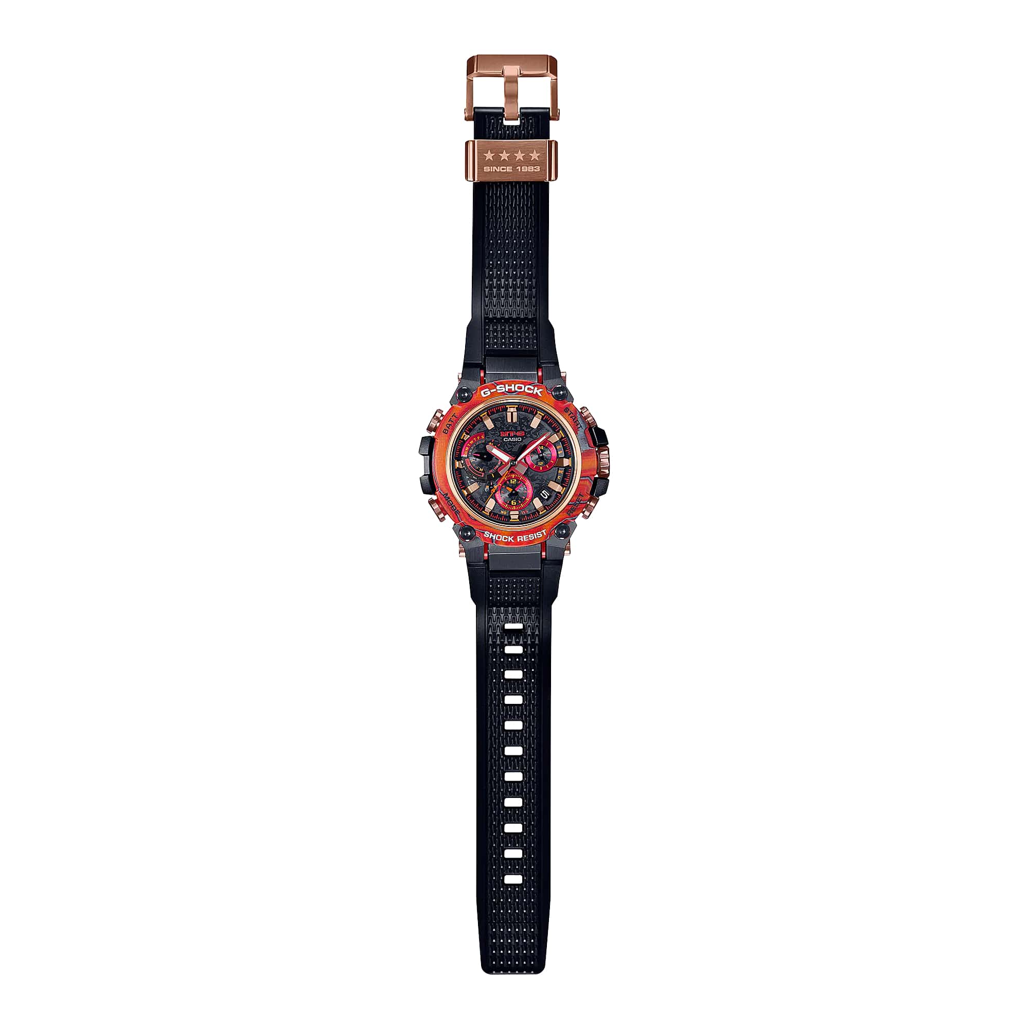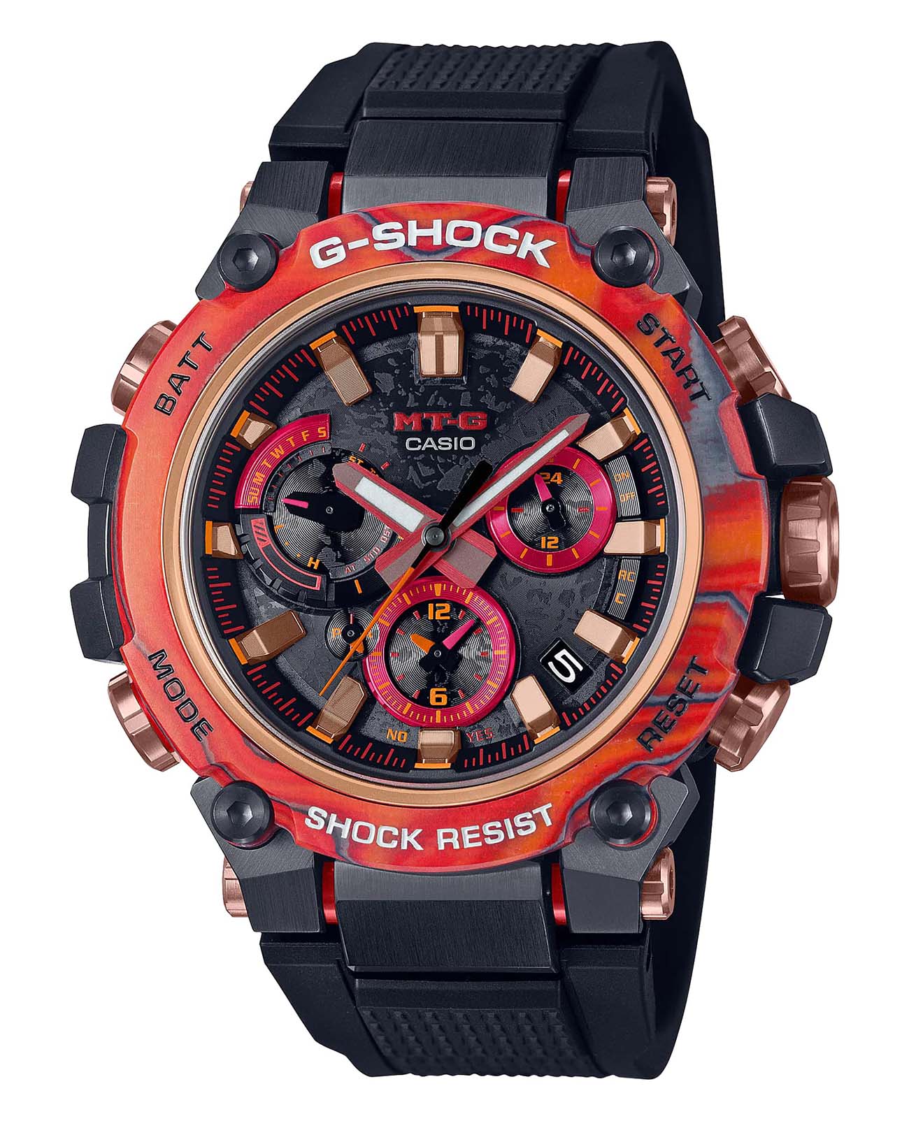 Лимитированные японские мужские мультифункциональные часы Casio G-Shock MTG-B3000FR-1A. Модель отличается ярким оформлением с ударением на солнечные вспышки, украшающие безель из углеродного сплава с вкраплениями фосфоресцирующих мелких частиц. Благодаря еще более совершенной конструкции Dual Core Guard часы MTG-B3000 защищают модуль в корпусе из армированной карбоном смолы. значительно тоньше своих предшественников. MTG-B3000FR-1A оснащены модулем «5672», самый тонкий из когда-либо существовавших хронографов G-Shock на солнечной батарее по технологии Tough SolarTough SolarТехнология основана на подзарядке аккумулятора от источника солнечного света, специальная панель улавливает солнечные лучи и преобразует их в энергию для работы часов. Достаточно пары минут нахождения на солнце для функционирования часов в течении суток..