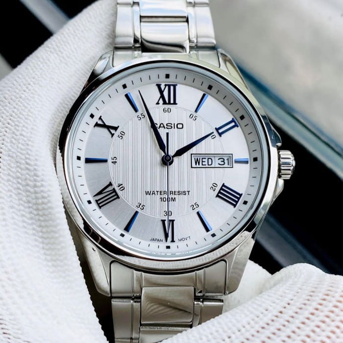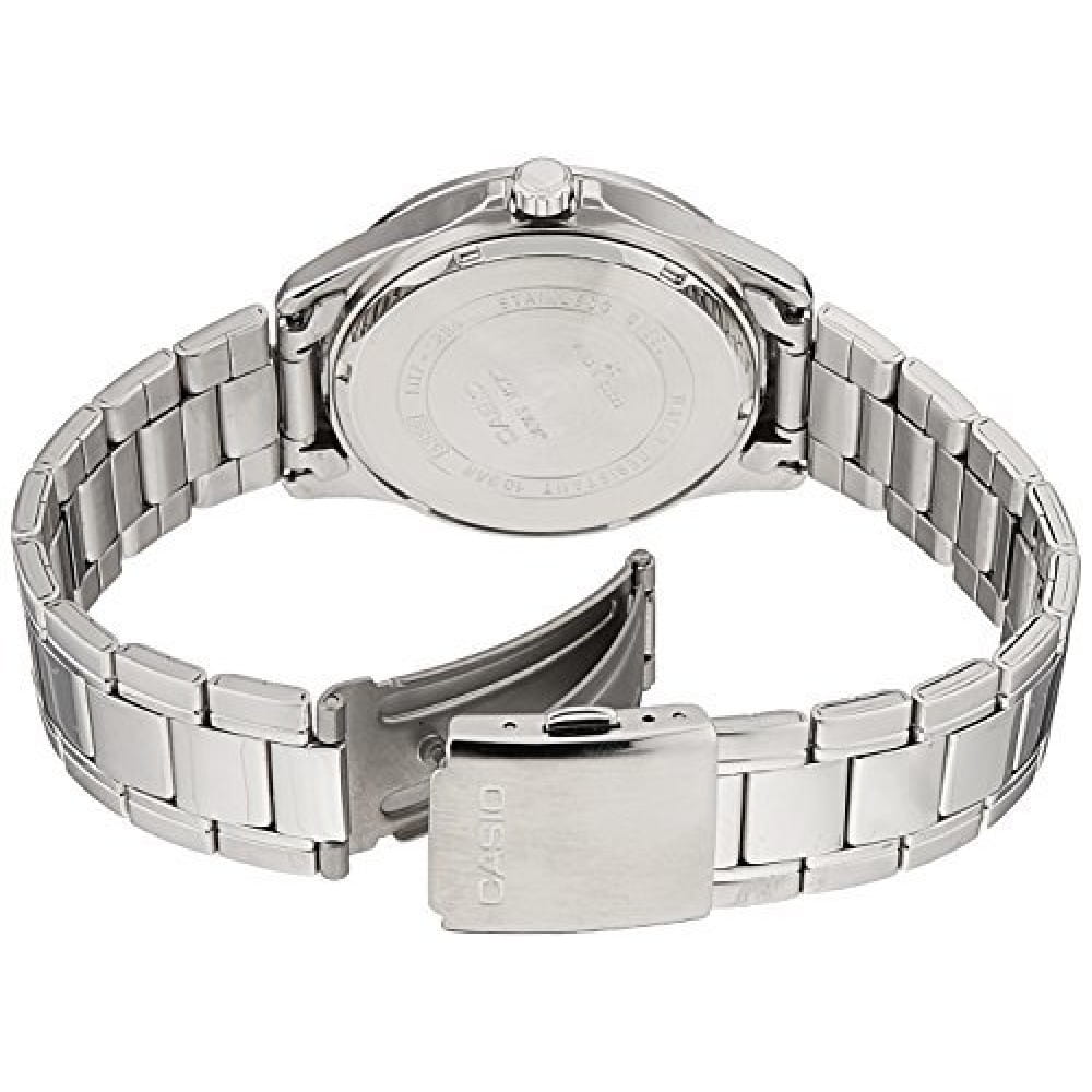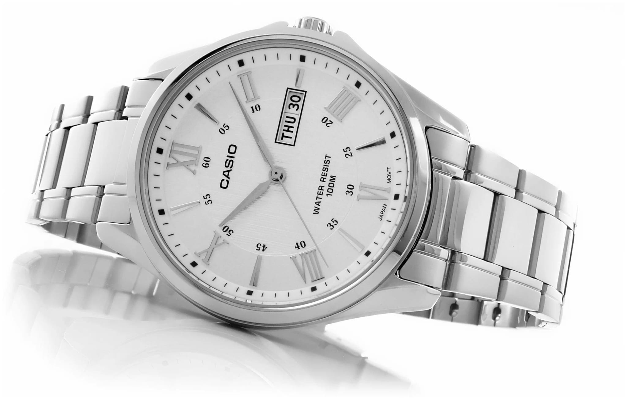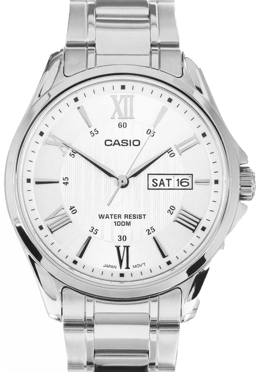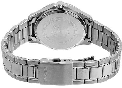 Японские мужские наручные часы с минеральным стекломМинеральное стеклоМинеральное стекло представляет собой искусственно выращенный минерал кварца. Такое стекло отличается особой устойчивостью к повреждениям и царапинам. Уступает по некоторым качествам сапфировому стеклу. Casio Collection MTP-1384D-7A, кварцевый механизм с высокой точностью. Класс водозащиты: 100 метров, позволит плавать, нырять и заниматься другими водными видами спорта. Корпус часов изготовлен из стали. Стальной браслет на раскладной застёжкеРаскладная застёжкаТакой тип застёжки используется только на браслетах из металла. Она никогда не раскрывается полностью, происходит разделение на 2 и более частей. Раскладывающая застёжка снизит вероятность потери часов к минимуму.. Окошки дня недели и даты находятся в положении 3 часа. Заводная головка с защитой. Задняя крышка с винтовым фиксатором.