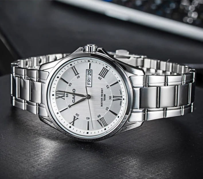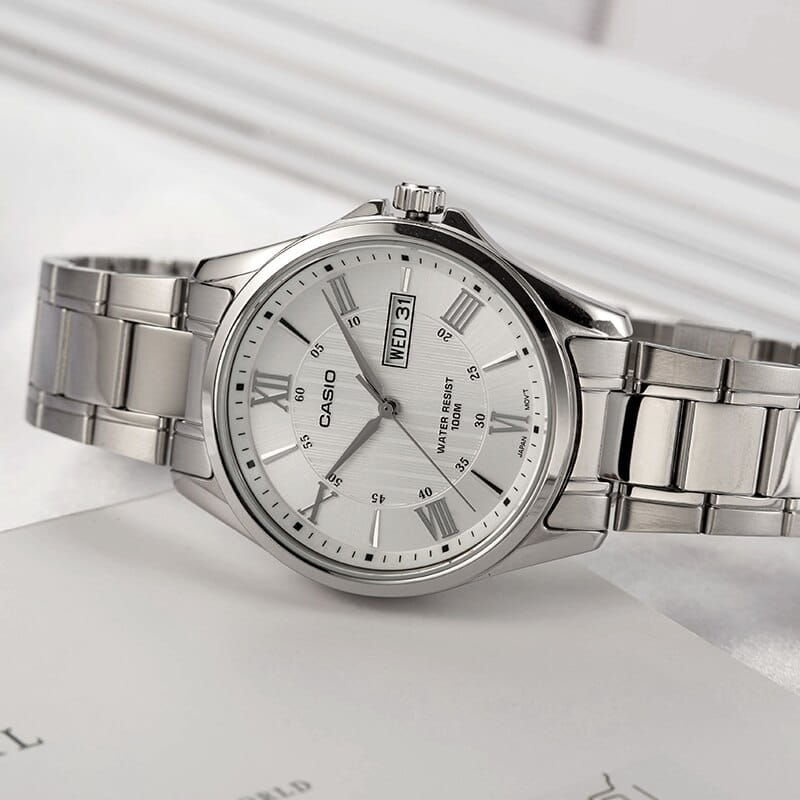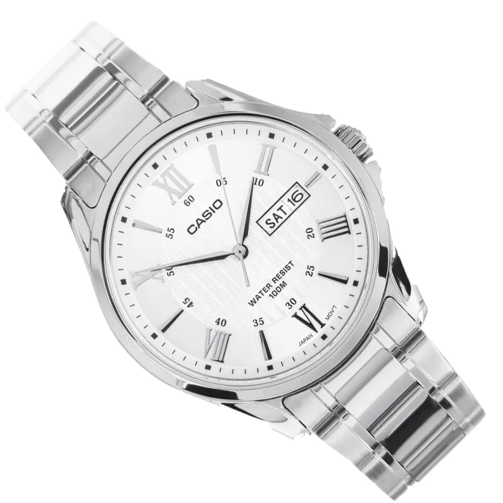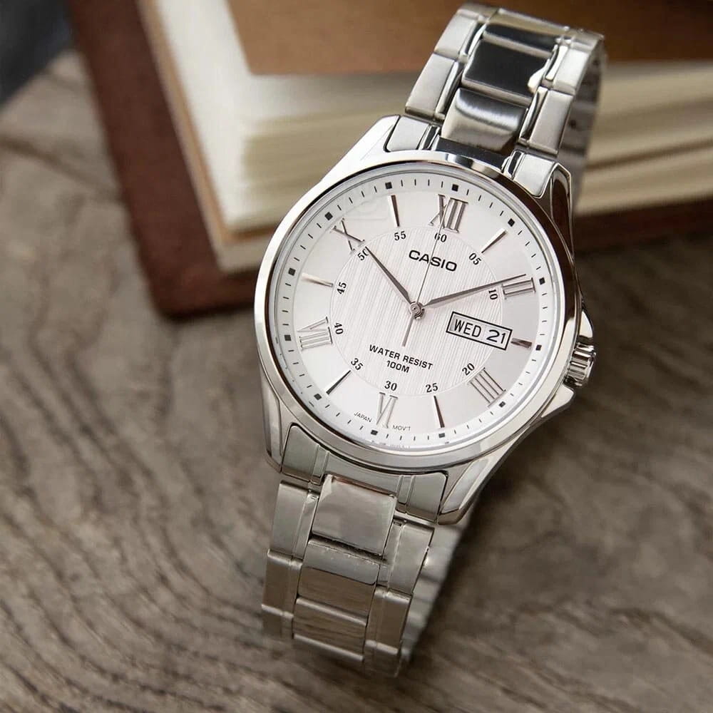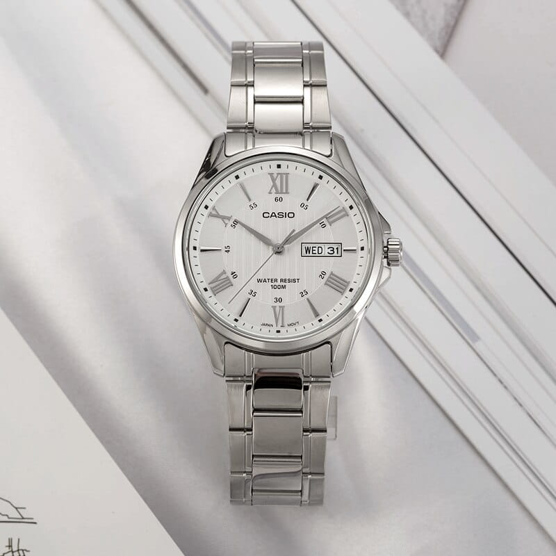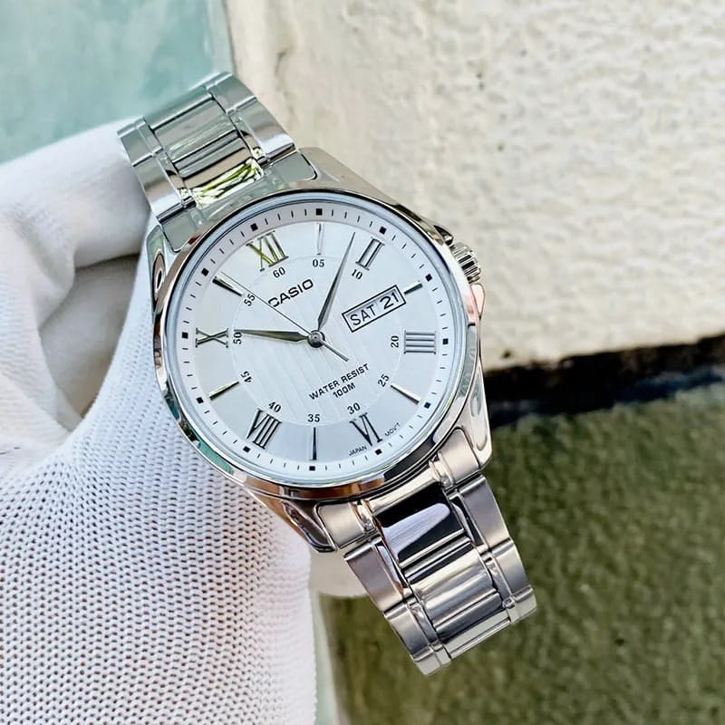 Японские мужские наручные часы с минеральным стекломМинеральное стеклоМинеральное стекло представляет собой искусственно выращенный минерал кварца. Такое стекло отличается особой устойчивостью к повреждениям и царапинам. Уступает по некоторым качествам сапфировому стеклу. Casio Collection MTP-1384D-7A, кварцевый механизм с высокой точностью. Класс водозащиты: 100 метров, позволит плавать, нырять и заниматься другими водными видами спорта. Корпус часов изготовлен из стали. Стальной браслет на раскладной застёжкеРаскладная застёжкаТакой тип застёжки используется только на браслетах из металла. Она никогда не раскрывается полностью, происходит разделение на 2 и более частей. Раскладывающая застёжка снизит вероятность потери часов к минимуму.. Окошки дня недели и даты находятся в положении 3 часа. Заводная головка с защитой. Задняя крышка с винтовым фиксатором.