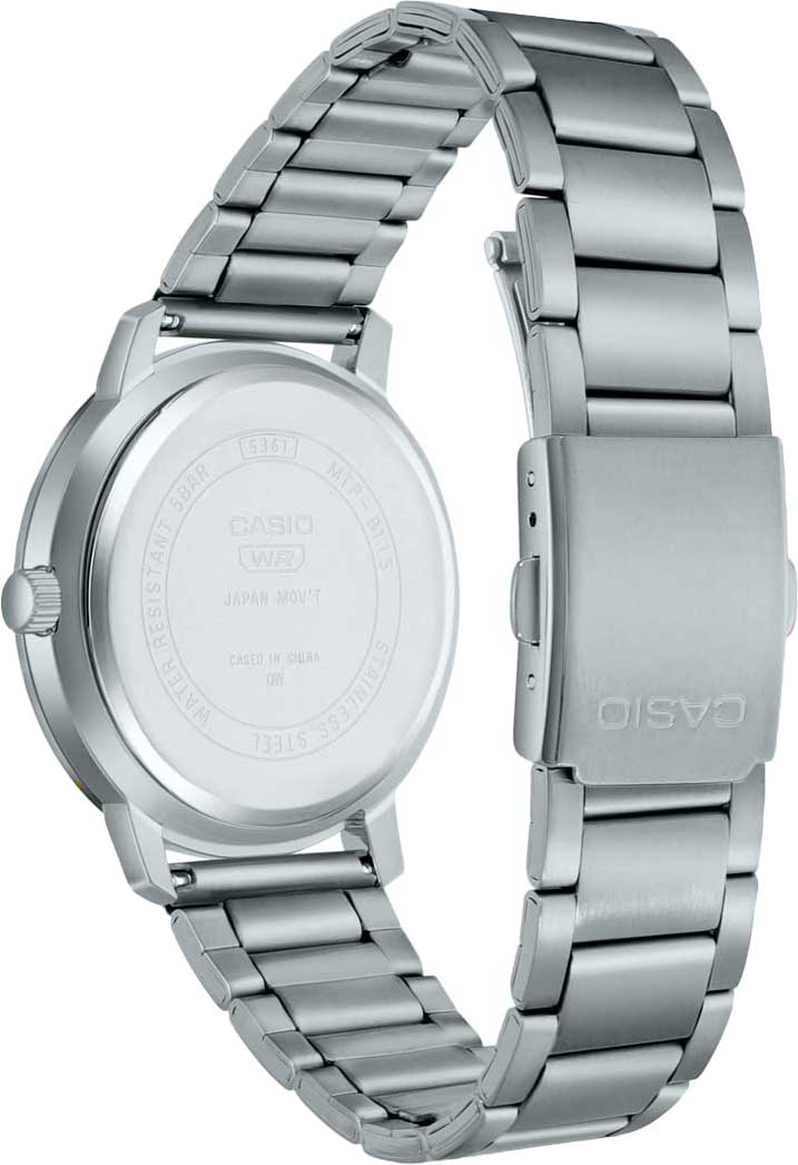 Японские наручные часы с минеральным стеклом Casio Collection MTP-B115D-1E, кварцевый механизм с высокой точностью. Корпус часов изготовлен из стали, серебристого цвета. Раскладная застёжкаРаскладная застёжкаТакой тип застёжки используется только на браслетах из металла. Она никогда не раскрывается полностью, происходит разделение на 2 и более частей. Раскладывающая застёжка снизит вероятность потери часов к минимуму..
