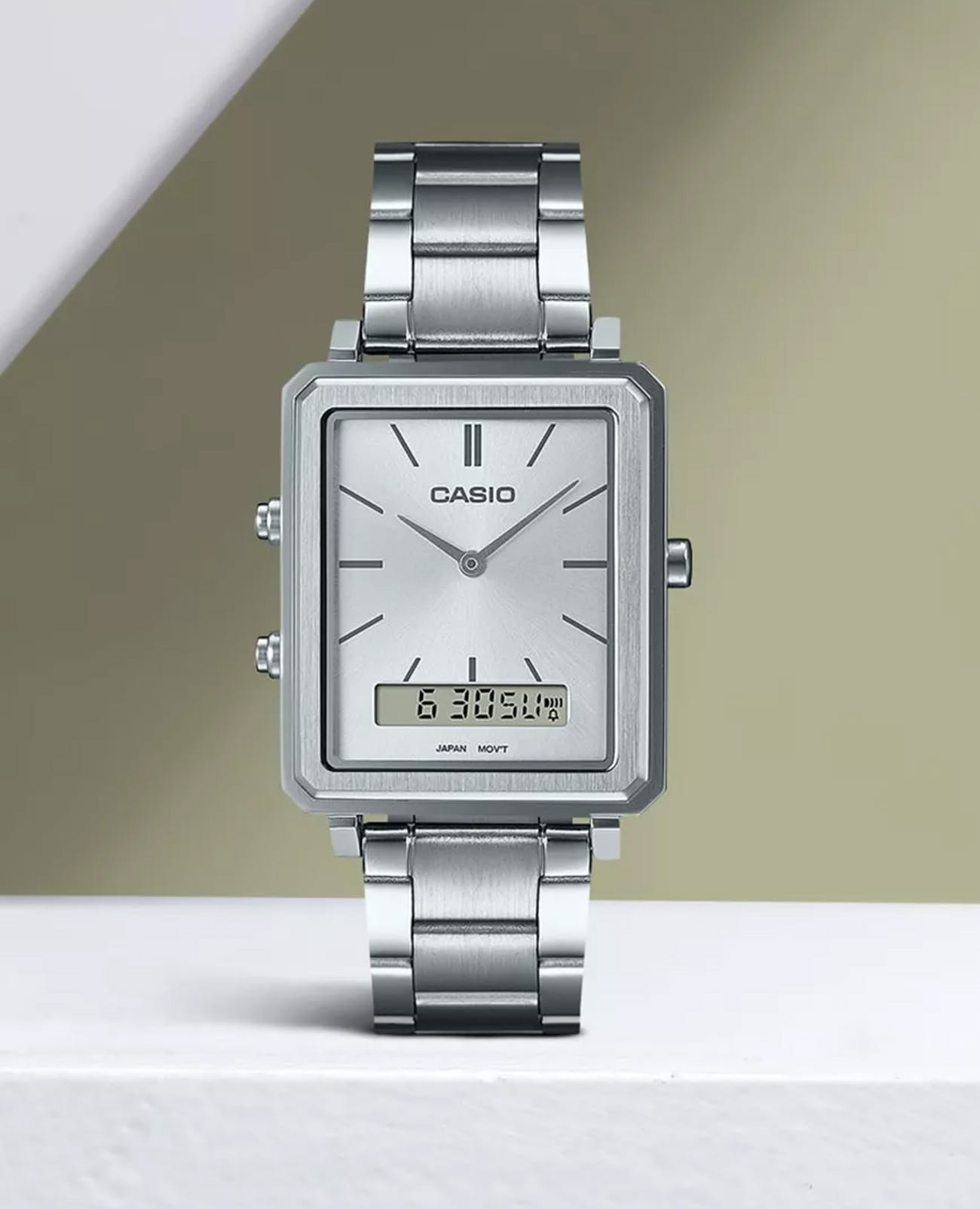 Японские мужские часы- хронографХронографФункция позволяет измерять отрезки времени с особой точностью: часы, минуты, секунды. Верным признаком хронографа является наличие на циферблате 3 дополнительных окошек-счётчиков. с минеральным стекломМинеральное стеклоМинеральное стекло представляет собой искусственно выращенный минерал кварца. Такое стекло отличается особой устойчивостью к повреждениям и царапинам. Уступает по некоторым качествам сапфировому стеклу. Casio Collection MTP-B205D-7EDF, кварцевый механизм с высокой точностью. Корпус часов изготовлен из стали. Мужские аналогово-цифровые часы. 12 и 24-часовой формат времени. СекундомерСекундомерСекундоме́р — прибор, способный измерять интервалы времени с точностью до долей секунды. с точностью показаний 1/100с и временем измерения 60мин. Второй часовой пояс. Циферблат с метками в виде штрихов выполнен по технологии Sunray (солнечные лучи). БудильникБудильникБуди́льник — часы, в заданный момент времени подающие звуковой, световой и/или в редких случаях другой сигнал., ежечасный сигнал. Батарея рассчитана на 3 года. Класс водозащиты: 50 метров, позволит защитить корпус от случайных брызг или капель дождя. Стальной браслет на раскладной застёжкеРаскладная застёжкаТакой тип застёжки используется только на браслетах из металла. Она никогда не раскрывается полностью, происходит разделение на 2 и более частей. Раскладывающая застёжка снизит вероятность потери часов к минимуму..