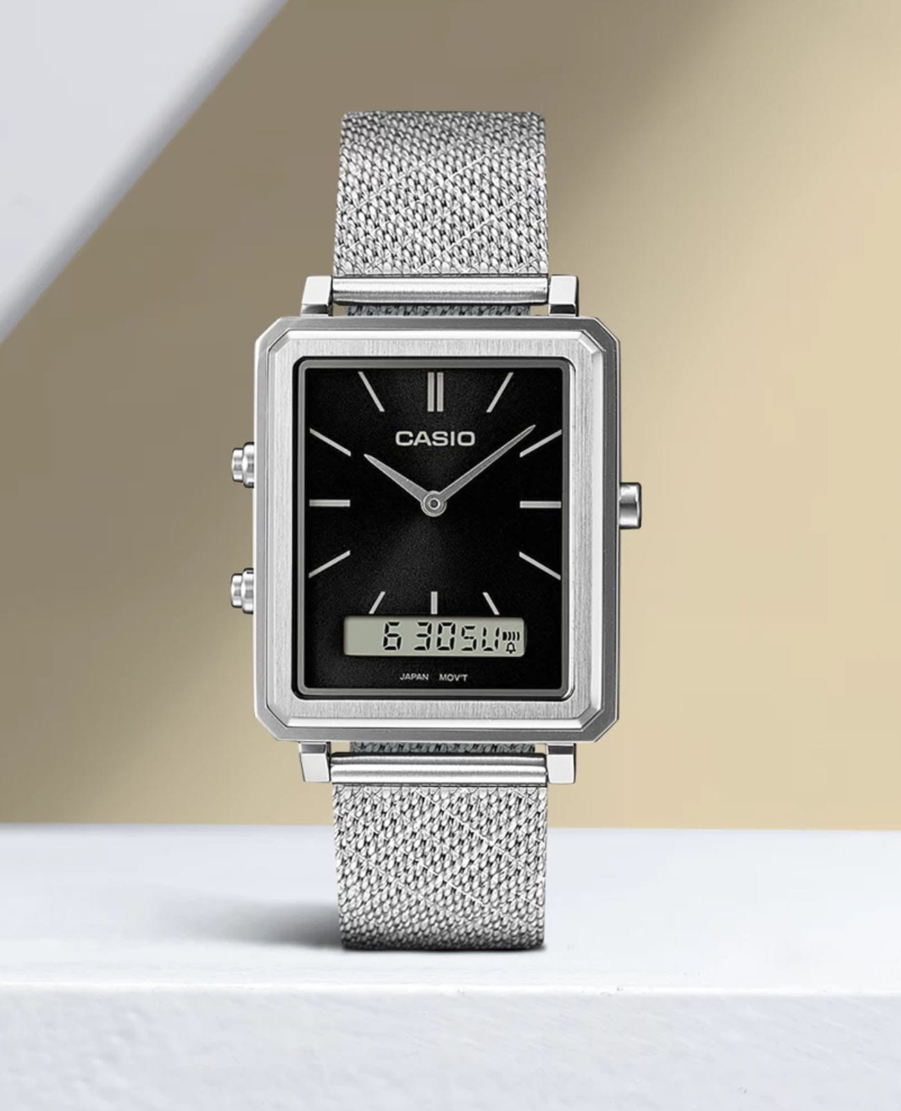 Японские мужские часы- хронографХронографФункция позволяет измерять отрезки времени с особой точностью: часы, минуты, секунды. Верным признаком хронографа является наличие на циферблате 3 дополнительных окошек-счётчиков. с минеральным стекломМинеральное стеклоМинеральное стекло представляет собой искусственно выращенный минерал кварца. Такое стекло отличается особой устойчивостью к повреждениям и царапинам. Уступает по некоторым качествам сапфировому стеклу. Casio Collection MTP-B205M-1EDF, кварцевый механизм с высокой точностью. Корпус часов изготовлен из стали. Мужские аналогово-цифровые часы. 12 и 24-часовой формат времени. СекундомерСекундомерСекундоме́р — прибор, способный измерять интервалы времени с точностью до долей секунды. с точностью показаний 1/100с и временем измерения 60мин. Второй часовой пояс. Циферблат с метками в виде штрихов. БудильникБудильникБуди́льник — часы, в заданный момент времени подающие звуковой, световой и/или в редких случаях другой сигнал., ежечасный сигнал. Батарея рассчитана на 3 года. Класс водозащиты: 50 метров, позволит защитить корпус от случайных брызг или капель дождя. Стальной браслет миланского плетения на раскладном замкеРаскладной замокДанный вариант застежки используется только на часах с металлическим браслетом. Отличительная особенность такого крепления в том, что длина браслета становится универсальной и вы можете самостоятельно отрегулировать нужный вам размер – застежка просто двигается по браслету часов..