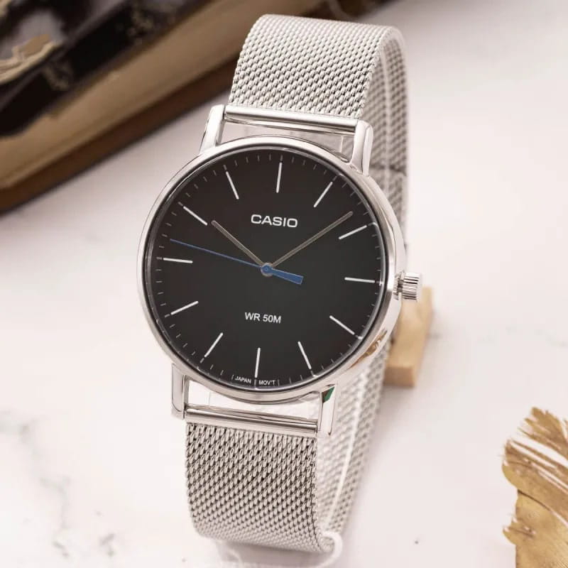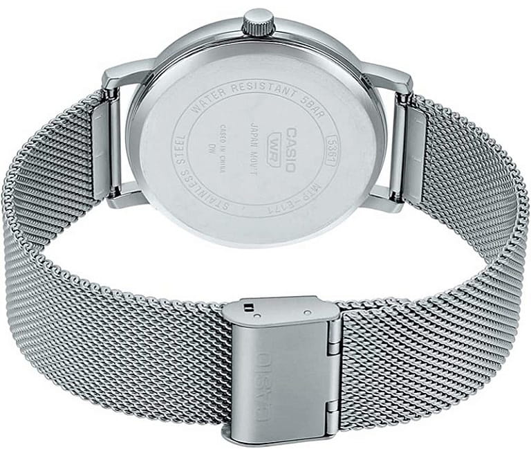 Японские мужские часы с минеральным стекломМинеральное стеклоМинеральное стекло представляет собой искусственно выращенный минерал кварца. Такое стекло отличается особой устойчивостью к повреждениям и царапинам. Уступает по некоторым качествам сапфировому стеклу. Casio Collection MTP-E171M-1E, кварцевый механизм с высокой точностью. Класс водозащиты: 50 метров, позволит защитить корпус от случайных брызг или капель дождя. Корпус часов изготовлен из стали. Стальной браслет на раскладной застёжкеРаскладная застёжкаТакой тип застёжки используется только на браслетах из металла. Она никогда не раскрывается полностью, происходит разделение на 2 и более частей. Раскладывающая застёжка снизит вероятность потери часов к минимуму..