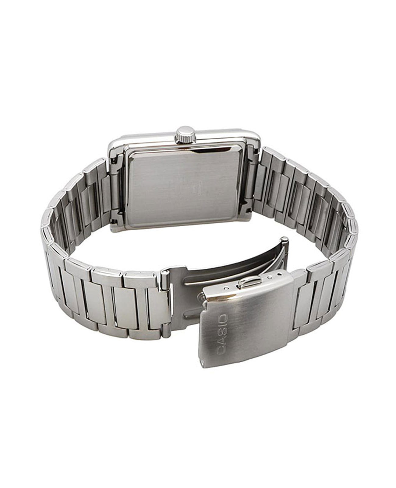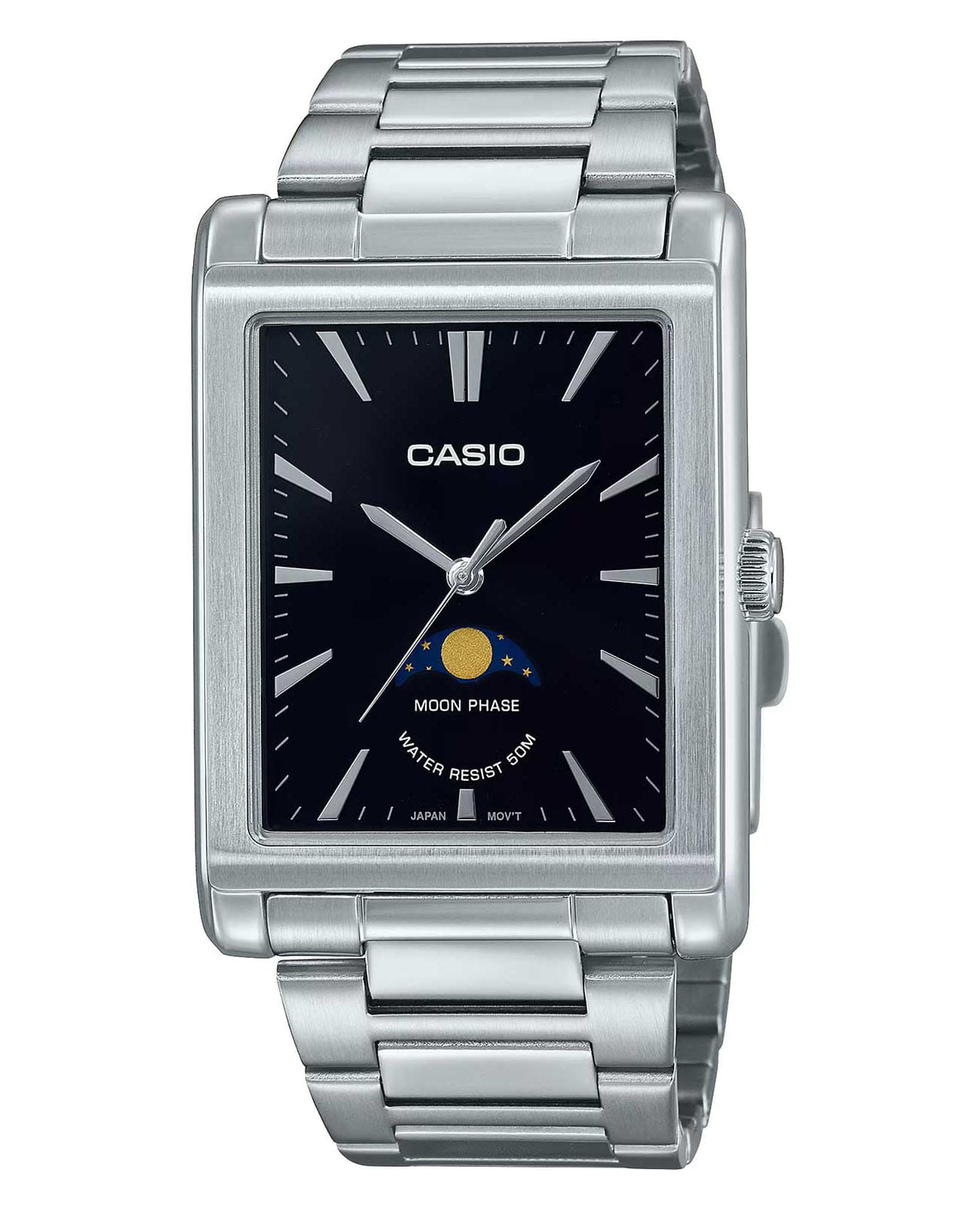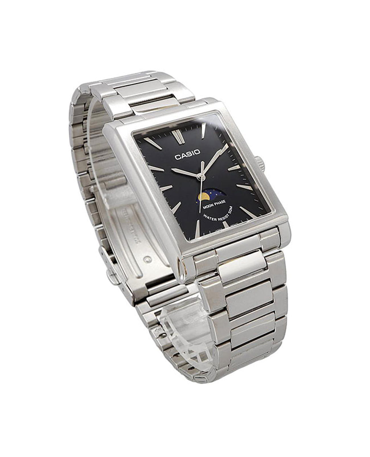 Японские мужские часы с минеральным стекломМинеральное стеклоМинеральное стекло представляет собой искусственно выращенный минерал кварца. Такое стекло отличается особой устойчивостью к повреждениям и царапинам. Уступает по некоторым качествам сапфировому стеклу. Casio Collection MTP-M105D-1A, кварцевый механизм с высокой точностью. Корпус часов изготовлен из стали. Циферблат с метками в виде штрихов выполнен по технологии Sunray (солнечные лучи). Отображение фаз Луны. Заводная головка с защитой. Батарейка рассчитана на 3 года. Задняя крышка с винтовым фиксатором. Класс водозащиты: 50 метров, позволит защитить корпус от случайных брызг или капель дождя. Стальной браслет на раскладной застёжкеРаскладная застёжкаТакой тип застёжки используется только на браслетах из металла. Она никогда не раскрывается полностью, происходит разделение на 2 и более частей. Раскладывающая застёжка снизит вероятность потери часов к минимуму..