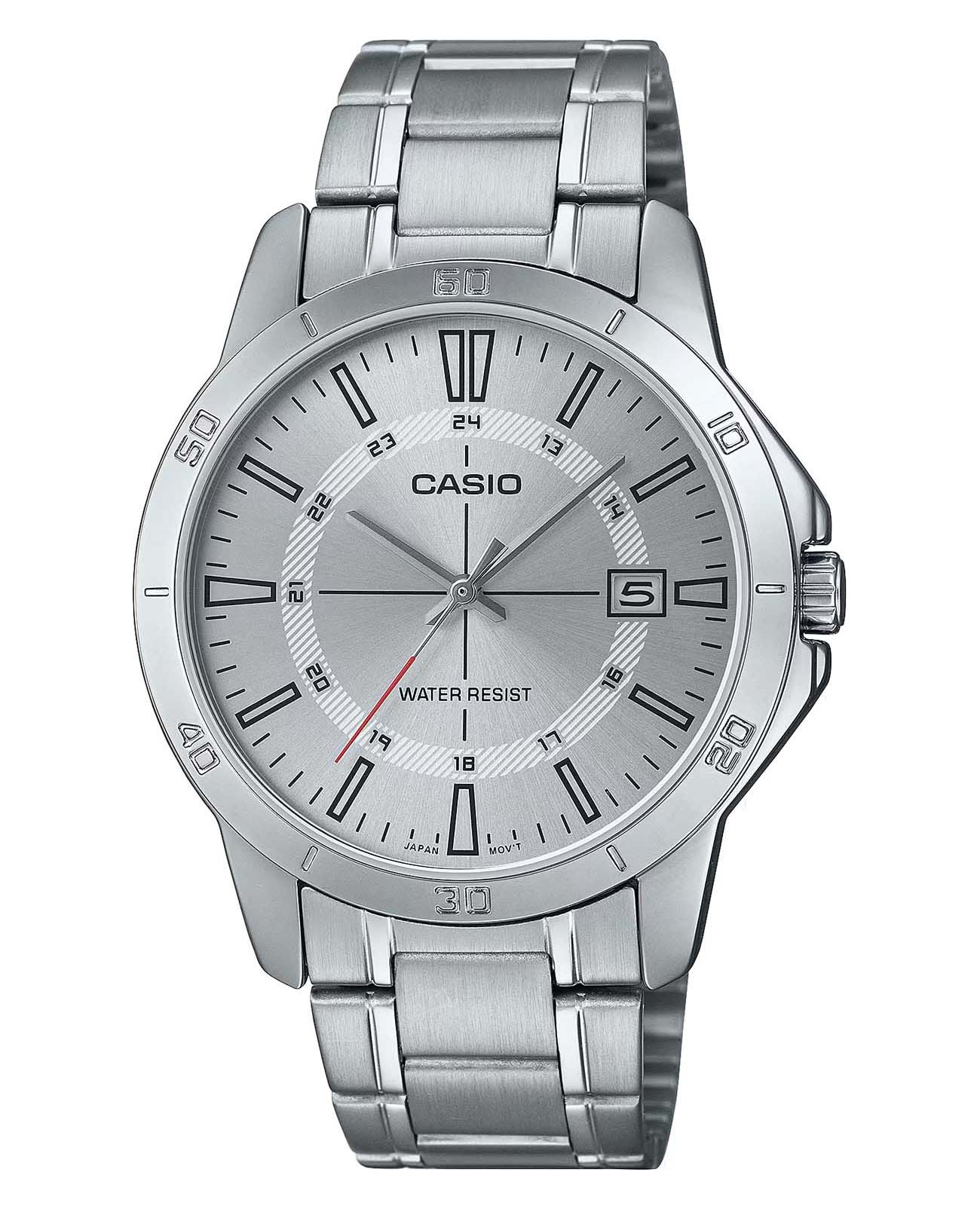 Японские мужские кварцевые часы с минеральным стекломМинеральное стеклоМинеральное стекло представляет собой искусственно выращенный минерал кварца. Такое стекло отличается особой устойчивостью к повреждениям и царапинам. Уступает по некоторым качествам сапфировому стеклу. Casio Collection MTP-V004D-7C, кварцевый механизм с высокой точностью. Корпус и браслет часов изготовлен из нержавеющей стали. Циферблат с метками в виде штрихов выполнен по технологии Sunray (солнечные лучи). Окошко даты находится в положении 3 часа. Класс водозащиты: 30 метров, позволит защитить корпус от случайных брызг или капель дождя. Стальной браслет на раскладной застёжкеРаскладная застёжкаТакой тип застёжки используется только на браслетах из металла. Она никогда не раскрывается полностью, происходит разделение на 2 и более частей. Раскладывающая застёжка снизит вероятность потери часов к минимуму..