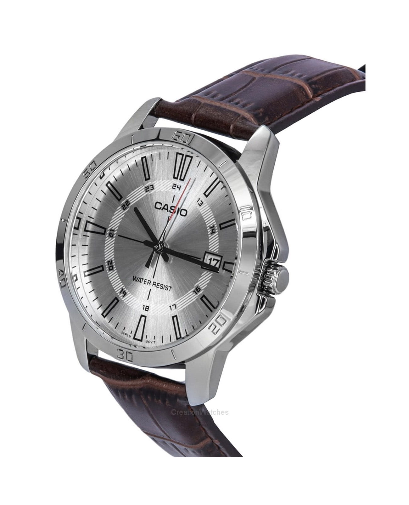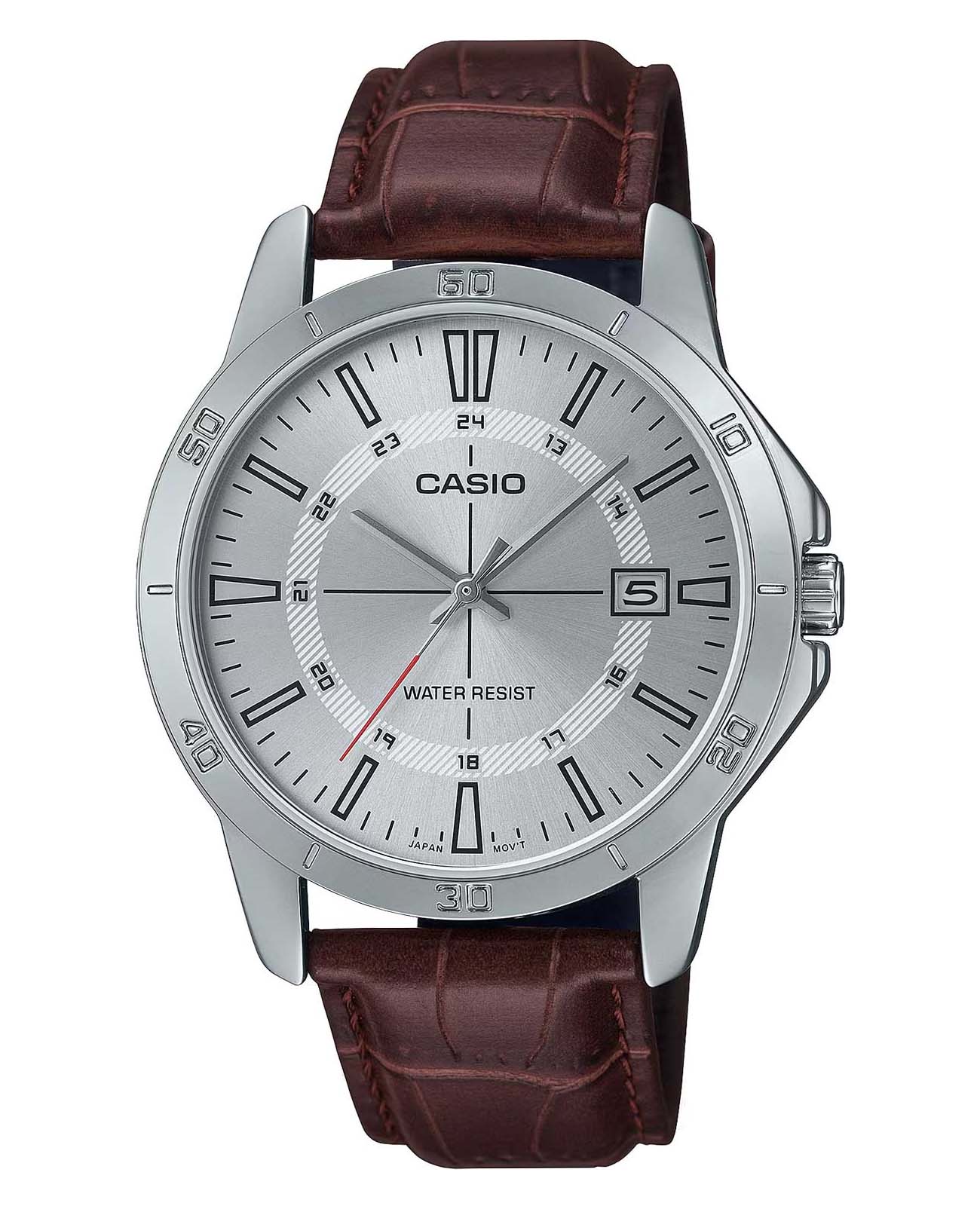Японские мужские кварцевые часы с минеральным стекломМинеральное стеклоМинеральное стекло представляет собой искусственно выращенный минерал кварца. Такое стекло отличается особой устойчивостью к повреждениям и царапинам. Уступает по некоторым качествам сапфировому стеклу. Casio Collection MTP-V004L-7C, кварцевый механизм с высокой точностью. Корпус и браслет часов изготовлен из нержавеющей стали. Циферблат с метками в виде штрихов выполнен по технологии Sunray (солнечные лучи). Окошко даты находится в положении 3 часа. Класс водозащиты: 50 метров, позволит защитить корпус от случайных брызг или капель дождя. Кожаный ремешок на стандартной застежке.