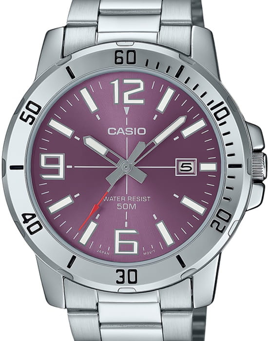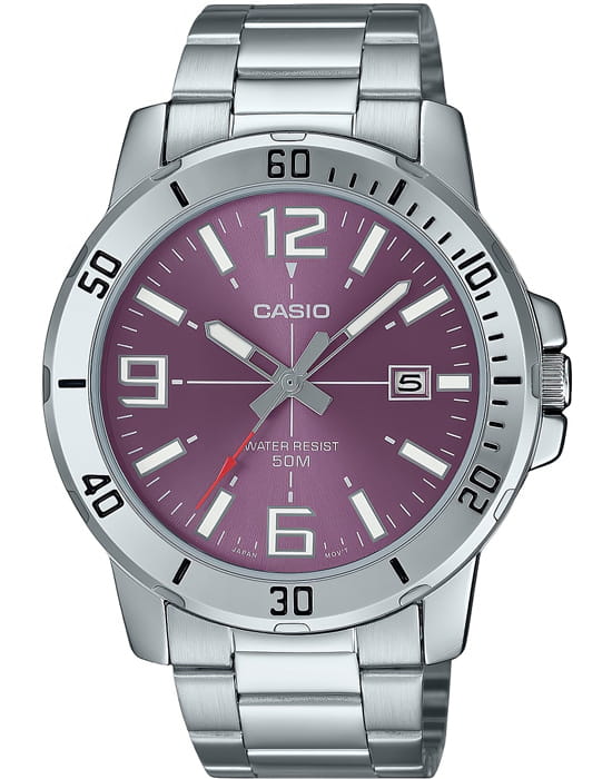 Отличная модель часов, которая станет идеальным вариантом на каждый день. Японские мужские часы с минеральным стекломМинеральное стеклоМинеральное стекло представляет собой искусственно выращенный минерал кварца. Такое стекло отличается особой устойчивостью к повреждениям и царапинам. Уступает по некоторым качествам сапфировому стеклу. Casio Collection MTP-VD01D-6BVUDF (MTP-VD01D-6B), кварцевый механизм с высокой точностью. Корпус часов изготовлен из стали. Люминесцентная подсветкаЛюминесцентное покрытиеПозволяет считывать показания времени в темноте. Производители наносят на стрелки, часовые индексы, безель или поверхность циферблата светонакопительный состав, дающий холодное свечение.. 12-ти и 24-х часовой формат времени, число и день недели вынесены на отдельные циферблаты. Метки в виде штрихов и точек. Заводная головка с защитой. Браслет с раскладной застёжкойРаскладная застёжкаТакой тип застёжки используется только на браслетах из металла. Она никогда не раскрывается полностью, происходит разделение на 2 и более частей. Раскладывающая застёжка снизит вероятность потери часов к минимуму..