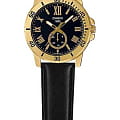 Кварцевый механизм с высокой точностью. Минеральное стеклоМинеральное стеклоМинеральное стекло представляет собой искусственно выращенный минерал кварца. Такое стекло отличается особой устойчивостью к повреждениям и царапинам. Уступает по некоторым качествам сапфировому стеклу. устойчивое к появлению царапин, обладающее высокой прозрачностью. Стрелки с люминесцентным покрытиемЛюминесцентное покрытиеПозволяет считывать показания времени в темноте. Производители наносят на стрелки, часовые индексы, безель или поверхность циферблата светонакопительный состав, дающий холодное свечение.. Класс водозащиты: 20 метров, позволит защитить корпус от случайных брызг или капель дождя. Корпус часов изготовлен из нержавеющей стали с PVD-покрытиемPVDУльтратонкое покрытие наносится в технике вакуумного напыления, сочетает в себе нитрид титана особой прочности со слоем золота или оксида хрома. Несёт в себе декоративную или защитную функцию.. Кожаный ремешок с классической застежкой.
