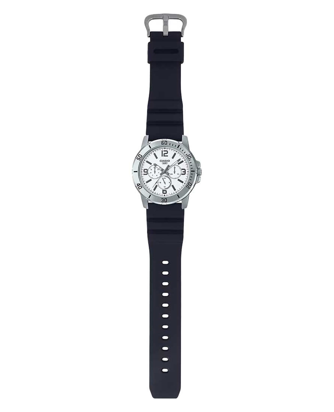 Японские мужские наручные часы с минеральным стекломМинеральное стеклоМинеральное стекло представляет собой искусственно выращенный минерал кварца. Такое стекло отличается особой устойчивостью к повреждениям и царапинам. Уступает по некоторым качествам сапфировому стеклу. Casio Collection MTP-VD300-7B, кварцевый механизм с высокой точностью. Аксессуар в классическом серебристом исполнении корпуса, с черным ремешком никогда не утратит актуальности, он будет прекрасным дополнением к классическому костюму, спортивной футболке, модных джинсах. Компактный циферблат выполнен в минималистичном стиле. Метки в виде штрихов и арабских цифр. 12-ти и 24-х часовой формат времени, число и день недели вынесены на отдельные циферблаты. Заводная головка с защитой. Батарея рассчитана на 3 года. Класс водозащиты: 50 метров, позволит защитить корпус от случайных брызг или капель дождя. Кожаный ремешок на стандартной застежке.