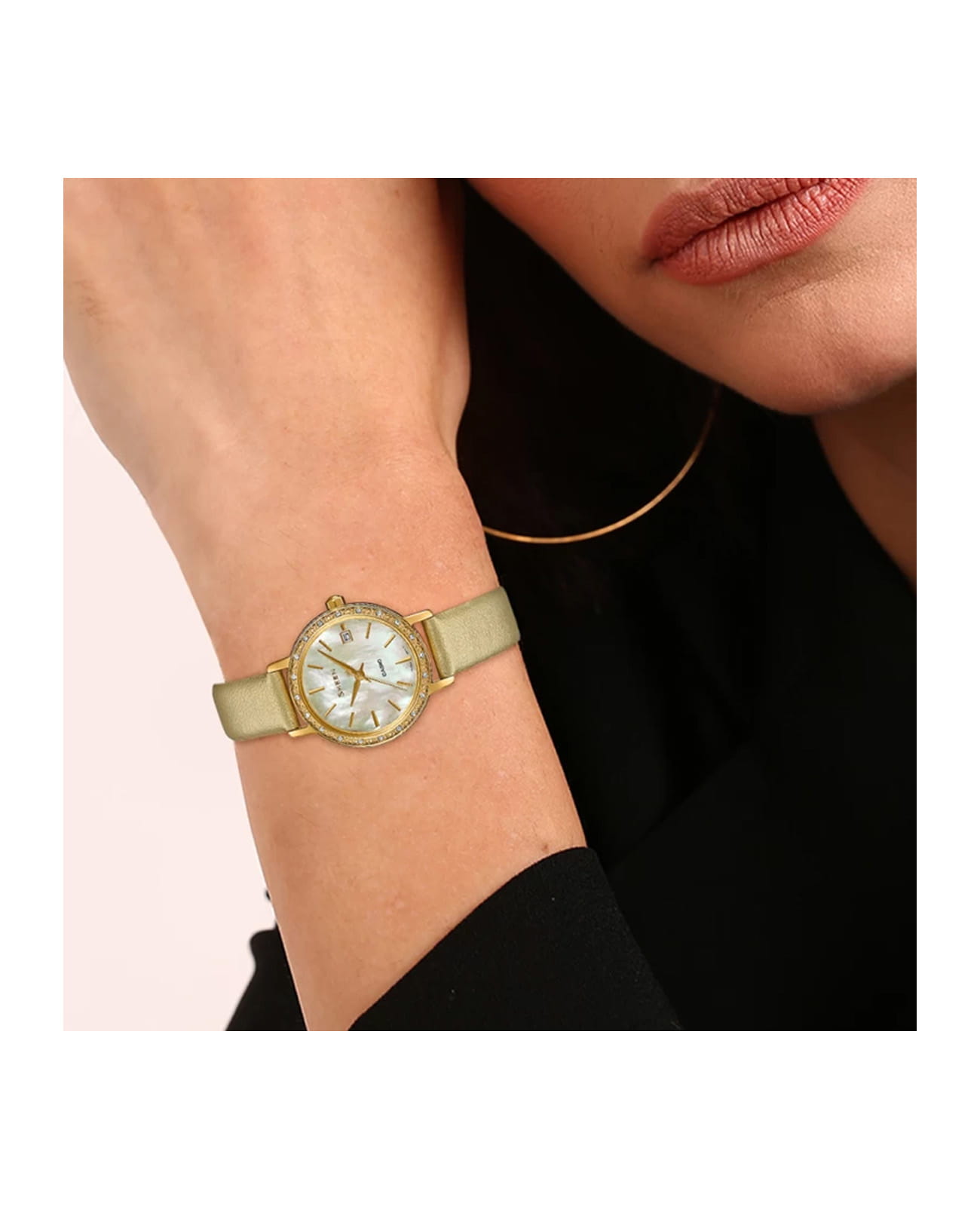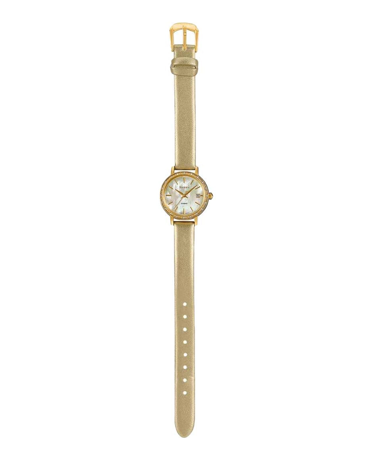 Японские женские часы с минеральным стекломМинеральное стеклоМинеральное стекло представляет собой искусственно выращенный минерал кварца. Такое стекло отличается особой устойчивостью к повреждениям и царапинам. Уступает по некоторым качествам сапфировому стеклу. Casio Sheen SHE-4060GL-9A, кварцевый механизм с высокой точностью. Завораживающие переливы перламутра покорят вас с первого взгляда. Корпус часов изготовлен из стали с IP-покрытиемIP-покрытиеМетод ионного напыления. Демонстрирует повышенную устойчивость к истиранию, окислению и химическим веществам. Под воздействием высокого давления и температуры около 1500°C молекулы металла надёжно соединяются с частицами корпуса часов.. БезельБезельВнешний ободок, закрепляющий стекло. В спортивных часах так называется поворотное кольцо с делениями на циферблате, выполняет роль таймера – замеряет отрезки времени на шкале. Неподвижный безель – элемент декора. Однонаправленно вращающийся безель на дайверских часах позволяет фиксировать моменты погружения и выныривания на поверхность. украшен кристаллами. Перламутровый циферблат с метками в виде штрихов. Окошко даты находится в положении 3 часа. Батарея рассчитана на 3 года. Класс водозащиты: 50 метров, позволит защитить корпус от случайных брызг или капель дождя. Кожаный ремешок на стандартной застежке.