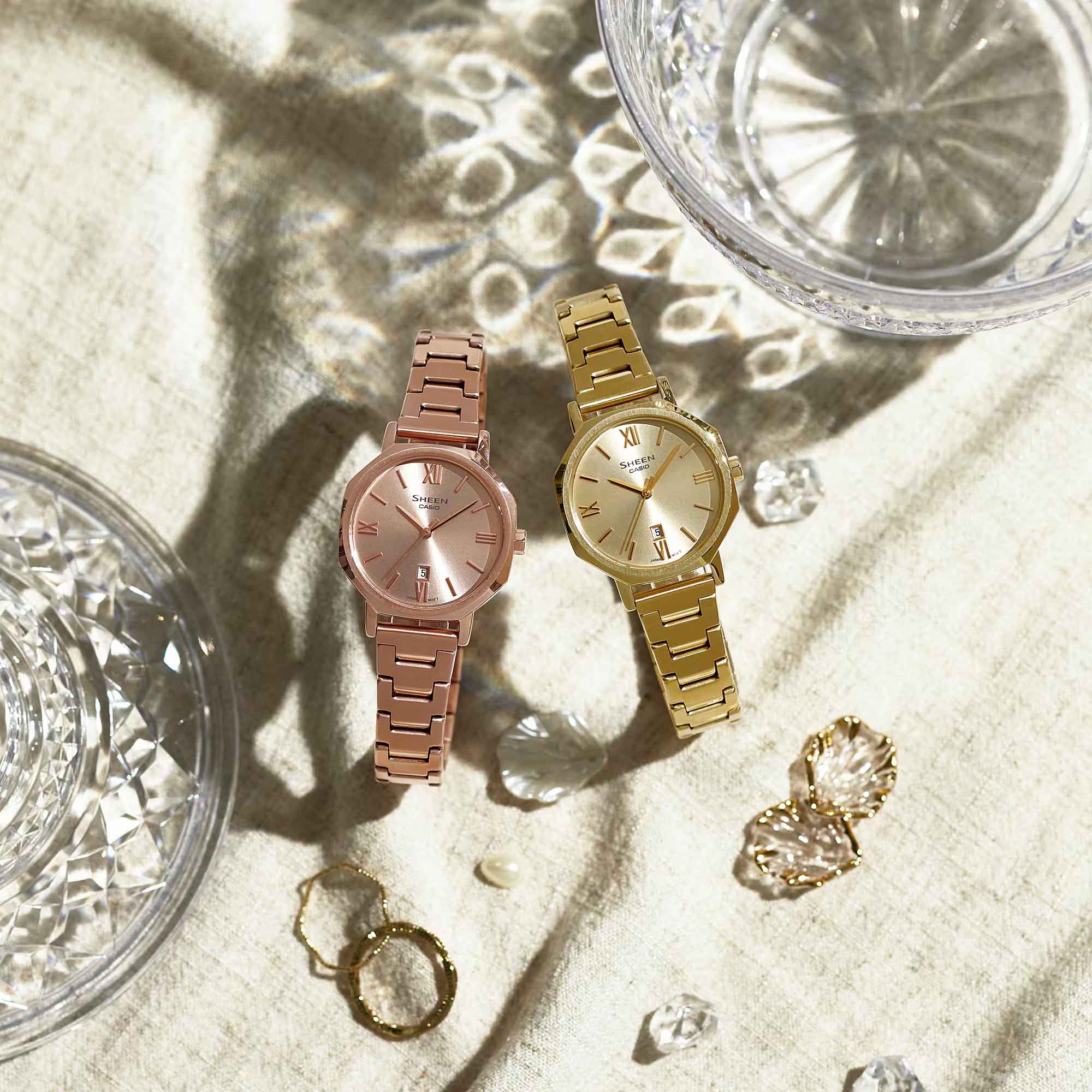 Женские японские часы Casio Sheen SHE-4554G-9A, кварцевый механизм с высокой точностью. Сапфировое стеклоСапфировое стеклоПрочный и надёжный материал из кристалла сапфира синтетического происхождения, характеризующийся особой твёрдостью и устойчивостью к царапинам и повреждениям., защищающее от царапин. Круглый стальной корпус изготовлен из нержавеющей стали c IP покрытиемIP-покрытиеМетод ионного напыления. Демонстрирует повышенную устойчивость к истиранию, окислению и химическим веществам. Под воздействием высокого давления и температуры около 1500°C молекулы металла надёжно соединяются с частицами корпуса часов.. Апертура даты расположена на отметке 6 часов. Стальной браслет c IP покрытиемIP-покрытиеМетод ионного напыления. Демонстрирует повышенную устойчивость к истиранию, окислению и химическим веществам. Под воздействием высокого давления и температуры около 1500°C молекулы металла надёжно соединяются с частицами корпуса часов. имеет раскладную застежкуРаскладная застёжкаТакой тип застёжки используется только на браслетах из металла. Она никогда не раскрывается полностью, происходит разделение на 2 и более частей. Раскладывающая застёжка снизит вероятность потери часов к минимуму.. Класс водозащиты: 50 метров, позволит защитить корпус от случайных брызг или капель дождя.