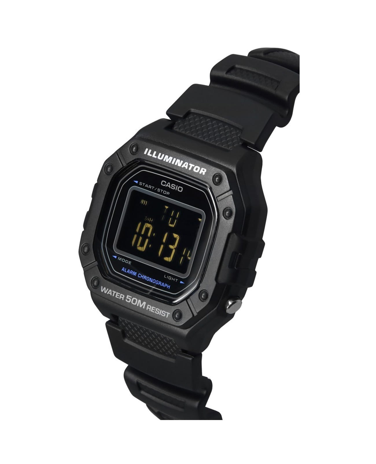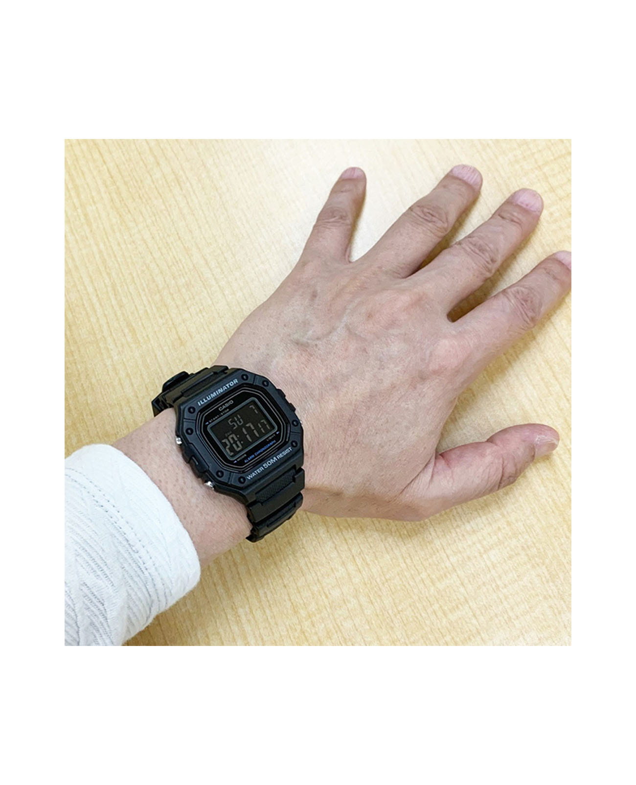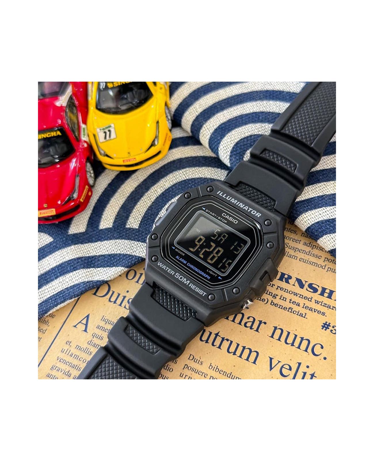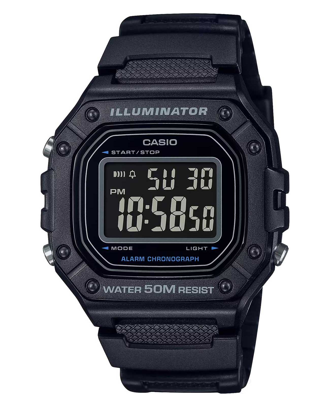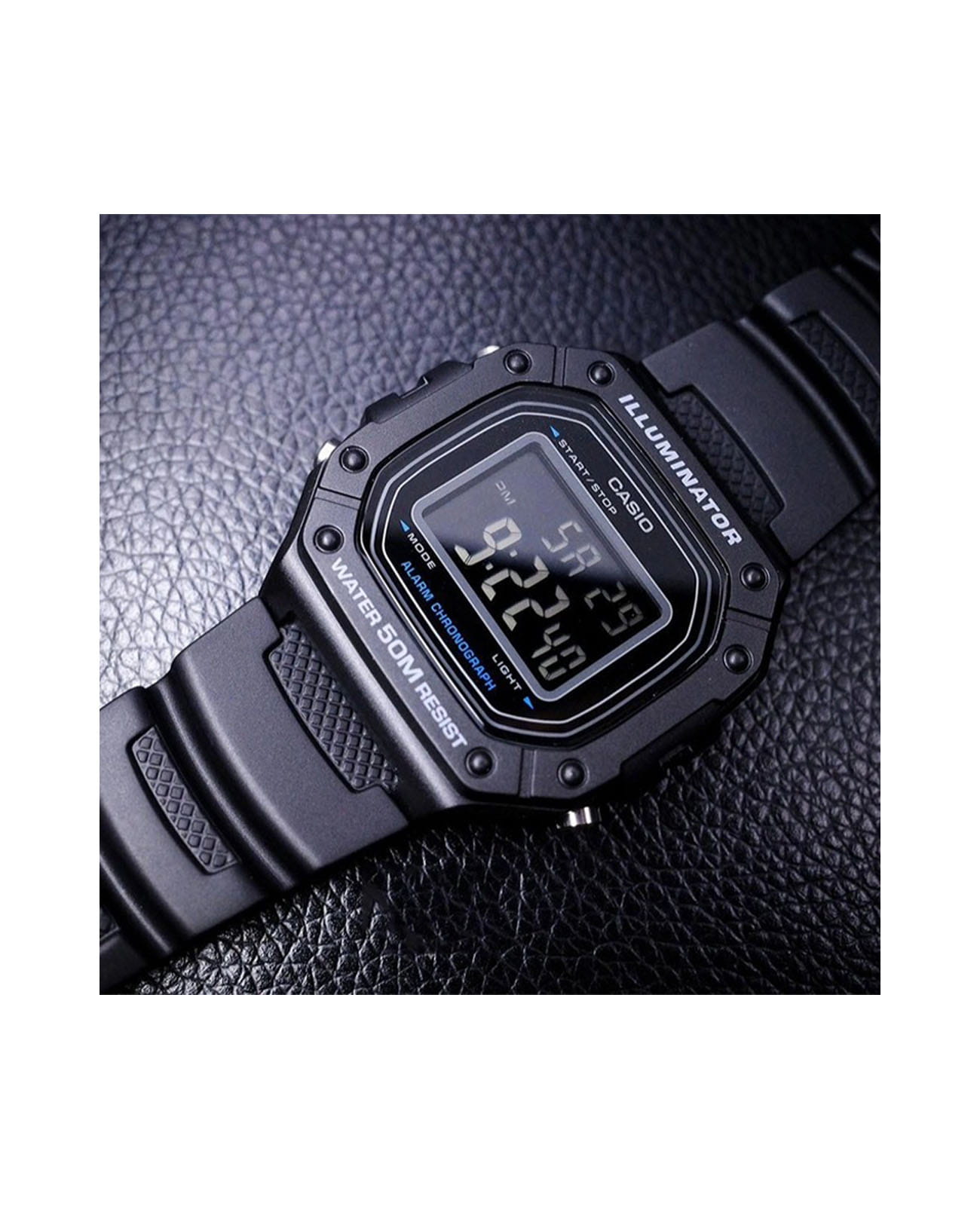 Спортивные японские мужские часы-хронографХронографФункция позволяет измерять отрезки времени с особой точностью: часы, минуты, секунды. Верным признаком хронографа является наличие на циферблате 3 дополнительных окошек-счётчиков. Casio Collection W-218H-1B, кварцевый механизм с высокой точностью, органическое стекло. Корпус часов изготовлен из пластика. Светодиодная подсветкаСветодиодная подсветкаСветодиодная или LED-подсветка обеспечивает появление яркого холодного свечения за счёт LED-элементов - маленьких лампочек. Они потребляют минимальное количество энергии, чаще всего можно встретить 1 светодиод, в нижней части циферблата. освещает весь циферблат. Цвет подсветки: оранжевый. 12-ти и 24-х часовой формат времени. СекундомерСекундомерСекундоме́р — прибор, способный измерять интервалы времени с точностью до долей секунды. с точностью показаний 1/100с и временем измерения 1ч. Сплит-хронографСплит-хронографИспользуется для измерения продолжительности нескольких временных отрезков, начинающихся одновременно, а заканчивающихся в разное время.. Батарейка рассчитана на 7 лет. БудильникБудильникБуди́льник — часы, в заданный момент времени подающие звуковой, световой и/или в редких случаях другой сигнал., ежечасный сигнал. Класс водозащиты: 50 метров, позволит защитить корпус от случайных брызг или капель дождя. Ремешок из полимерного материала на стандартной застежке.