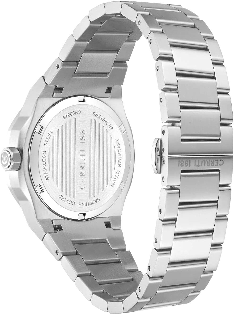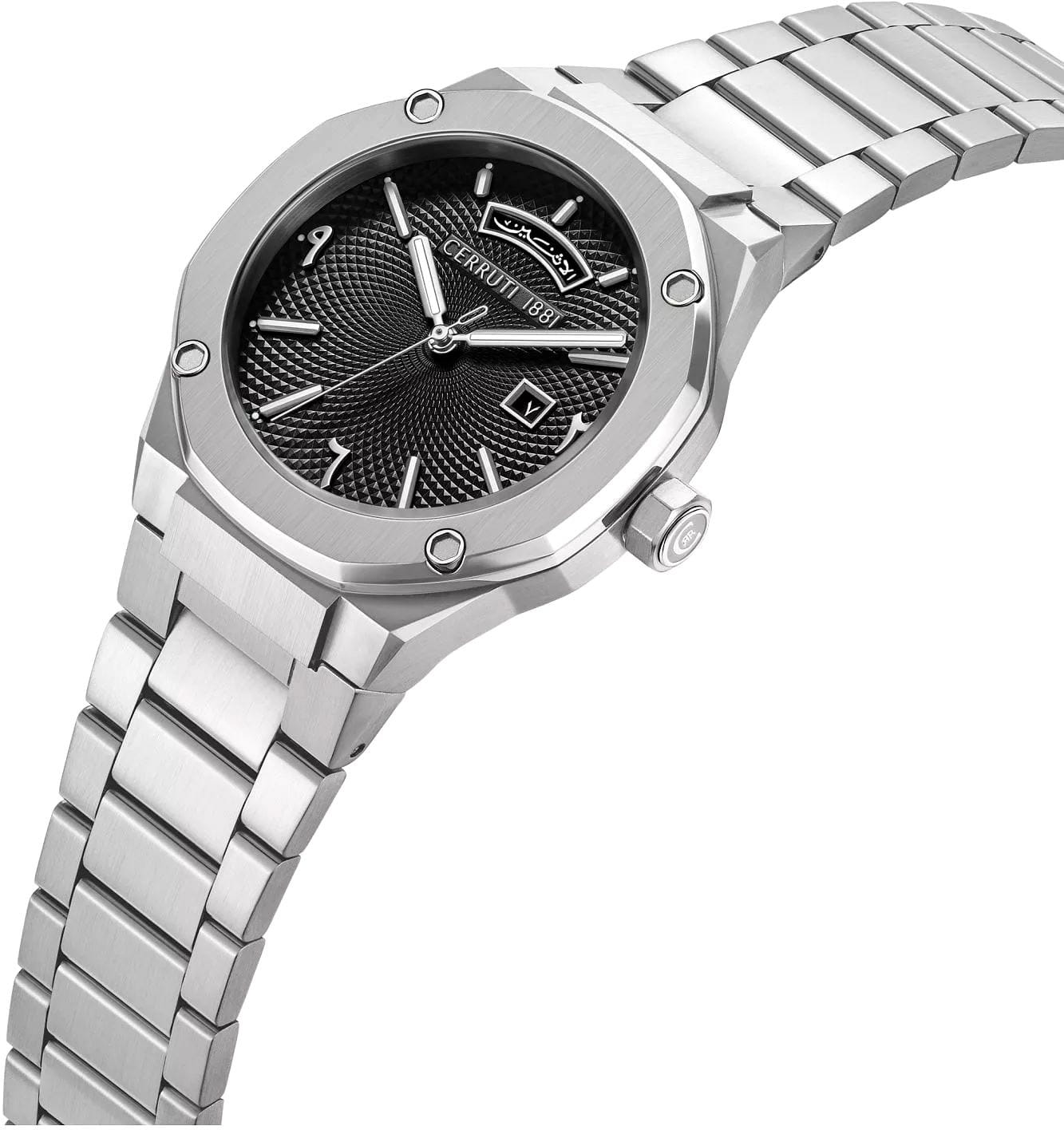 Cerruti 1881 CIWGH0084801 — утончённые мужские часы, в которых классика и современная геометрия нашли безупречный баланс. Стальной корпус с восьмигранным безелемБезельВнешний ободок, закрепляющий стекло. В спортивных часах так называется поворотное кольцо с делениями на циферблате, выполняет роль таймера – замеряет отрезки времени на шкале. Неподвижный безель – элемент декора. Однонаправленно вращающийся безель на дайверских часах позволяет фиксировать моменты погружения и выныривания на поверхность. подчёркивает архитектурную точность форм, а глубокий циферблат с гильошированным узором придаёт модели выразительную глубину. Индикаторы дня недели и даты оформлены в элегантных окнах на «12» и «3 часах», обеспечивая визуальную симметрию и удобство считывания. Прочные стрелки покрыты люминесцентным покрытиемЛюминесцентное покрытиеПозволяет считывать показания времени в темноте. Производители наносят на стрелки, часовые индексы, безель или поверхность циферблата светонакопительный состав, дающий холодное свечение., что гарантирует отличную читаемость даже в темноте. Циферблат защищён надёжным минеральным стекломМинеральное стеклоМинеральное стекло представляет собой искусственно выращенный минерал кварца. Такое стекло отличается особой устойчивостью к повреждениям и царапинам. Уступает по некоторым качествам сапфировому стеклу., устойчивым к царапинам, а стальной браслет фиксируется удобной застёжкой «бабочка»Застёжка "бабочка"Такой вид застёжки дополняется предохранителями, помогающими избежать случайного раскрытия браслета. Обладают изящным исполнением. , обеспечивающей комфорт и безопасность при носке. Строгая форма и продуманные детали делают эту модель идеальным выбором для мужчины, ценящего сдержанную роскошь и точность швейцарского стиля.