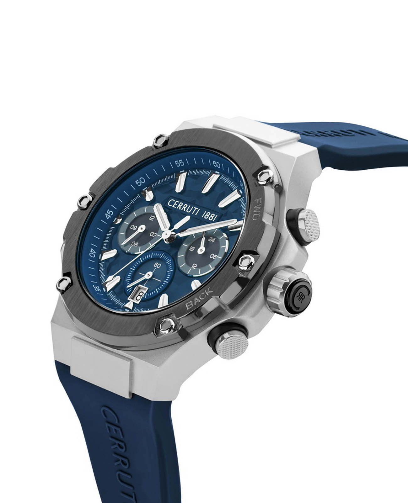 Французские мужские часы-хронографХронографФункция позволяет измерять отрезки времени с особой точностью: часы, минуты, секунды. Верным признаком хронографа является наличие на циферблате 3 дополнительных окошек-счётчиков. Cerruti 1881 Lucardo CIWGQ2224303, кварцевый механизм с высокой точностью. Минеральное стеклоМинеральное стеклоМинеральное стекло представляет собой искусственно выращенный минерал кварца. Такое стекло отличается особой устойчивостью к повреждениям и царапинам. Уступает по некоторым качествам сапфировому стеклу. устойчивое к мелким механическим повреждениям. Корпус часов изготовлен из стали. БезельБезельВнешний ободок, закрепляющий стекло. В спортивных часах так называется поворотное кольцо с делениями на циферблате, выполняет роль таймера – замеряет отрезки времени на шкале. Неподвижный безель – элемент декора. Однонаправленно вращающийся безель на дайверских часах позволяет фиксировать моменты погружения и выныривания на поверхность. с IP-покрытиемIP-покрытиеМетод ионного напыления. Демонстрирует повышенную устойчивость к истиранию, окислению и химическим веществам. Под воздействием высокого давления и температуры около 1500°C молекулы металла надёжно соединяются с частицами корпуса часов.. На циферблате расположены три дополнительных индикатора. Окошко даты находится в положении 6 часов. Стрелки и метки с люминесцентным покрытиемЛюминесцентное покрытиеПозволяет считывать показания времени в темноте. Производители наносят на стрелки, часовые индексы, безель или поверхность циферблата светонакопительный состав, дающий холодное свечение.. Класс водозащиты: 100 метров, позволит плавать, нырять и заниматься другими водными видами спорта. Силиконовый ремешок на стандартной застежке.