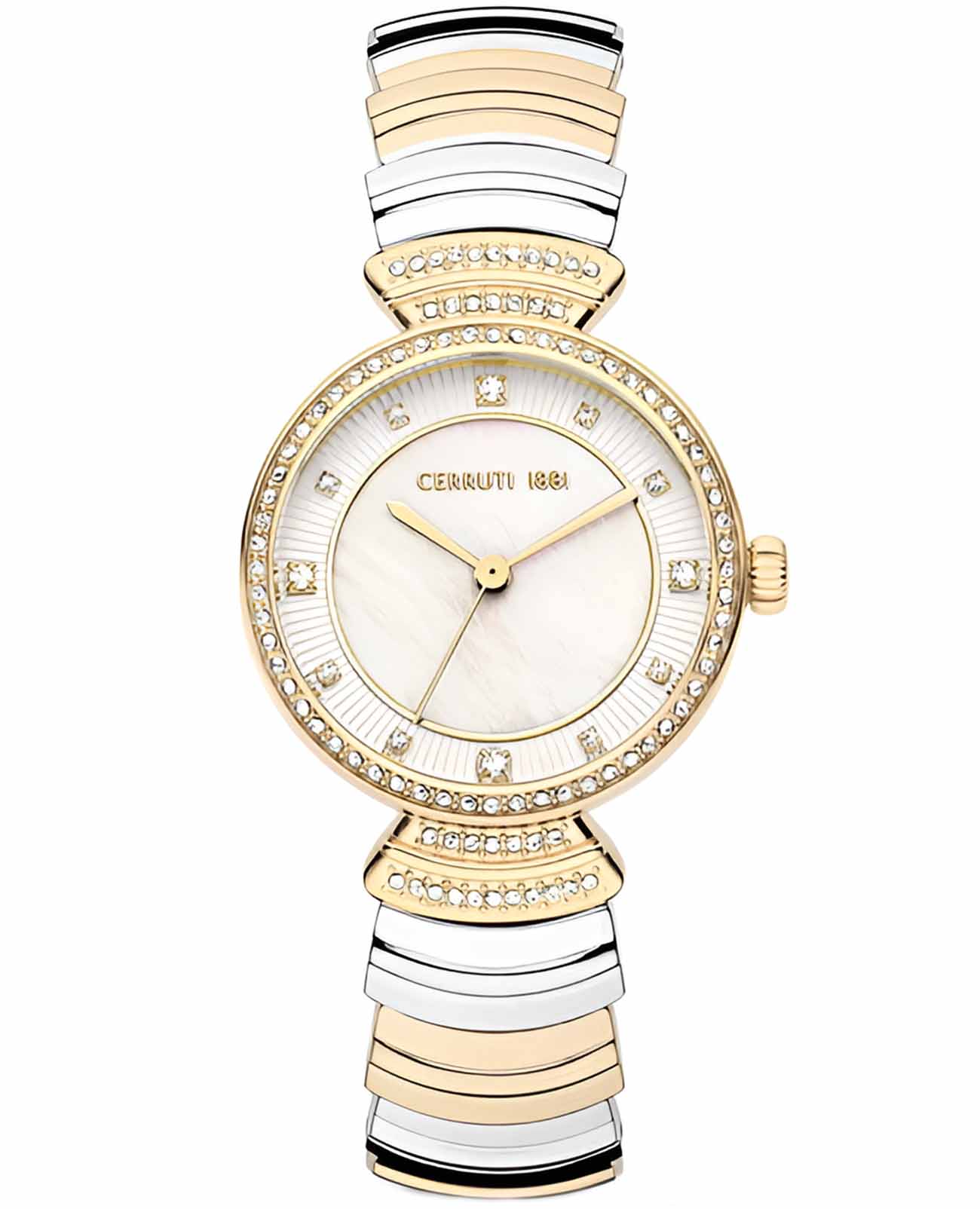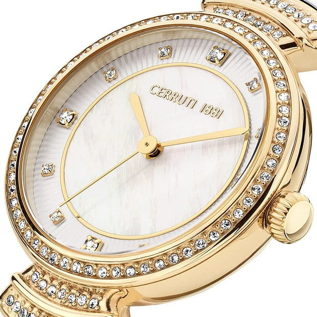 Итальянские женские часы с кристаллами Cerruti 1881 CERRISI CIWLG2225102, кварцевый механизм с высокой точностью. Минеральное стеклоМинеральное стеклоМинеральное стекло представляет собой искусственно выращенный минерал кварца. Такое стекло отличается особой устойчивостью к повреждениям и царапинам. Уступает по некоторым качествам сапфировому стеклу. устойчивое к мелким механическим повреждениям. Корпус часов изготовлен из нержавеющей стали с IP-покрытиемIP-покрытиеМетод ионного напыления. Демонстрирует повышенную устойчивость к истиранию, окислению и химическим веществам. Под воздействием высокого давления и температуры около 1500°C молекулы металла надёжно соединяются с частицами корпуса часов. золотистого цвета. БезельБезельВнешний ободок, закрепляющий стекло. В спортивных часах так называется поворотное кольцо с делениями на циферблате, выполняет роль таймера – замеряет отрезки времени на шкале. Неподвижный безель – элемент декора. Однонаправленно вращающийся безель на дайверских часах позволяет фиксировать моменты погружения и выныривания на поверхность. с IP-покрытиемIP-покрытиеМетод ионного напыления. Демонстрирует повышенную устойчивость к истиранию, окислению и химическим веществам. Под воздействием высокого давления и температуры около 1500°C молекулы металла надёжно соединяются с частицами корпуса часов. украшен кристаллами. Циферблат украшен также кристаллами в виде меток. Класс водозащиты: 50 метров, позволит защитить корпус от случайных брызг или капель дождя. Стальной браслет на застёжке-бабочке с кнопкамиЗастёжка "бабочка"Такой вид застёжки дополняется предохранителями, помогающими избежать случайного раскрытия браслета. Обладают изящным исполнением. и IP-покрытиемIP-покрытиеМетод ионного напыления. Демонстрирует повышенную устойчивость к истиранию, окислению и химическим веществам. Под воздействием высокого давления и температуры около 1500°C молекулы металла надёжно соединяются с частицами корпуса часов. обеспечивает комфортное и надёжное крепление на запястье.