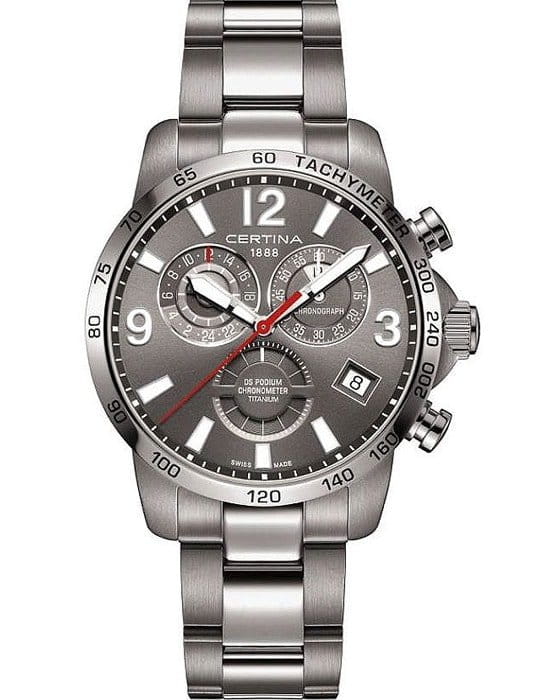 Наручные часы-хронометр сочетают в себе классический и спортивный стиль. Серебристые титановые браслет и ударопрочный корпусУдаропрочный корпусМеханизм заключён в корпус, выполненный из современных материалов, устойчивых к ударам, механическим повреждениям и падению с высоты: инновационный пластик, карбон, нержавеющая сталь, титан. привлекательно гармонируют с элегантным циферблатом. Высокая точность хода швейцарского кварцевого механизма ETA G10.962 Precidrive™Precidrive™Инновационный кварцевый механизм Certina. Часы, оснащённые этим швейцарским калибром, приравниваются к точности к сертифицированным хронометрам, точность хода составляет +/-10 секунд в год. (минимальная погрешность +/-10 секунд в год) подтверждается документом – сертификатом COSCСертификат COSCОфициальный сертификат, подтверждающий то, что часы ходят с особо высокой точностью. Для получения документа часы подвергаются тестовым испытаниям, разработанным швейцарским институтом тестирования хронометров COSC. Допустимая норма для механических часов -4/+6 секунд в день, для кварцевых моделей +/- 0,07 секунд в день.. Надпись DS ConceptDS ConceptDouble Security Concept, обозначает двойную надёжность и безупречную точность часов Certina. Двойная система защиты подразумевает обеспечение максимальной устойчивости к ударам и высоких показателей водонепроницаемости. свидетельствует о противоударности модели и повышенной водонепроницаемости 200 метров. Стекло из сапфира. Стрелки и метки с люминесцентным покрытиемЛюминесцентное покрытиеПозволяет считывать показания времени в темноте. Производители наносят на стрелки, часовые индексы, безель или поверхность циферблата светонакопительный состав, дающий холодное свечение.. Водостойкость 100 метров. Заводная головка с защитой. Секундомер, GMTGMTОтображение времени второго часового пояса.Такая функция особенно актуальна для путешественников и бизнесменов,которые общаются с людьми из разных стран,теперь вы всегда будете знать,какой час у вашего партнёра или близкого человека., отображение числа, индикатор EOLEOLПредставляет собой систему, уведомляющую владельца часов о необходимости замены элемента питания. За 2 недели до полного разряда батарейки секундная стрелка перестаёт ходить чётко и начинает перепрыгивать на 3-4 деления., высокоточный хронографХронографФункция позволяет измерять отрезки времени с особой точностью: часы, минуты, секунды. Верным признаком хронографа является наличие на циферблате 3 дополнительных окошек-счётчиков.. Диаметр корпуса: 42 мм.