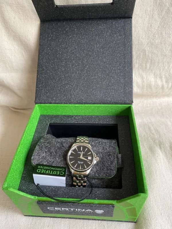 Брендовая модель с серебристым блеском является идеальным решением для торжественного мероприятия или вечеринки. Минималистичный чёрный циферблат декорирован 3 бриллиантами оттенка Top Wesselton, стиля добавляет узор по окружности. Наручные часы за безупречную точность хода швейцарского кварцевого калибра ETA F06.411 отмечены сертификатом хронометра COSCСертификат COSCОфициальный сертификат, подтверждающий то, что часы ходят с особо высокой точностью. Для получения документа часы подвергаются тестовым испытаниям, разработанным швейцарским институтом тестирования хронометров COSC. Допустимая норма для механических часов -4/+6 секунд в день, для кварцевых моделей +/- 0,07 секунд в день.. Закручивающаяся заводная головка и задняя крышка. Концепция DS ConceptDS ConceptDouble Security Concept, обозначает двойную надёжность и безупречную точность часов Certina. Двойная система защиты подразумевает обеспечение максимальной устойчивости к ударам и высоких показателей водонепроницаемости.. Сапфировое стекло с односторонним антибликовым покрытием. Водостойкость 200 метров. . Стальной ударопрочный корпусУдаропрочный корпусМеханизм заключён в корпус, выполненный из современных материалов, устойчивых к ударам, механическим повреждениям и падению с высоты: инновационный пластик, карбон, нержавеющая сталь, титан. и браслет. Окошко даты, индикатор EOLEOLПредставляет собой систему, уведомляющую владельца часов о необходимости замены элемента питания. За 2 недели до полного разряда батарейки секундная стрелка перестаёт ходить чётко и начинает перепрыгивать на 3-4 деления.. Диаметр корпуса: 33,8 мм.