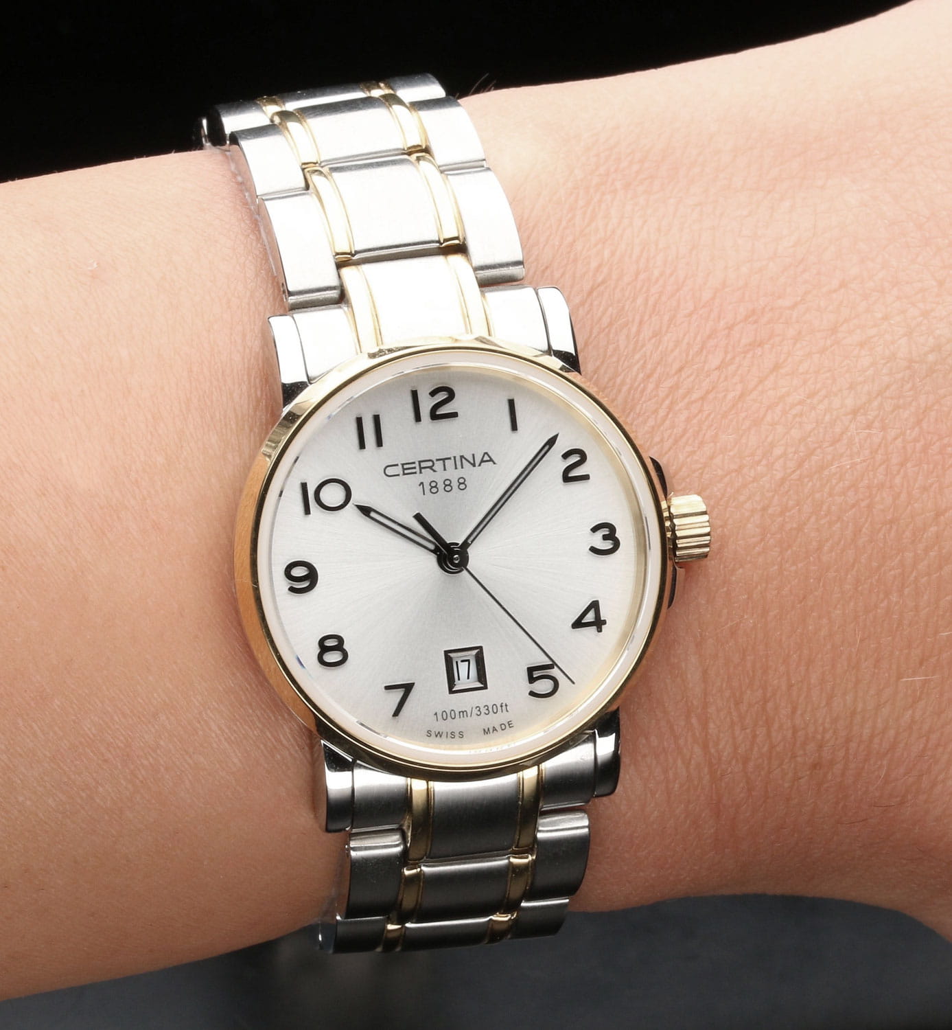 Женские швейцарские часы с сапфировым стеклом Certina DS Caimano C017.210.22.032.00, кварцевый механизм с высокой точностью. Сапфировое стеклоСапфировое стеклоПрочный и надёжный материал из кристалла сапфира синтетического происхождения, характеризующийся особой твёрдостью и устойчивостью к царапинам и повреждениям. устойчивое к появлению царапин, обладающее высокой прозрачностью. Циферблат выполнен по технологии Sunray (солнечные лучи). Узкие заостренные прямоугольные стрелки в стиле Baton с люминесцентным покрытием, которое светится в темноте после непродолжительной зарядки на свету. Метки в виде арабских цифр. Окошко даты находится в положении 6 часов. Класс водозащиты: 100 метров, позволит плавать, нырять и заниматься другими водными видами спорта. Корпус часов изготовлен из стали с PVDPVDУльтратонкое покрытие наносится в технике вакуумного напыления, сочетает в себе нитрид титана особой прочности со слоем золота или оксида хрома. Несёт в себе декоративную или защитную функцию. покрытием