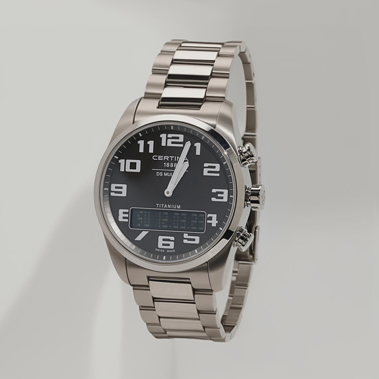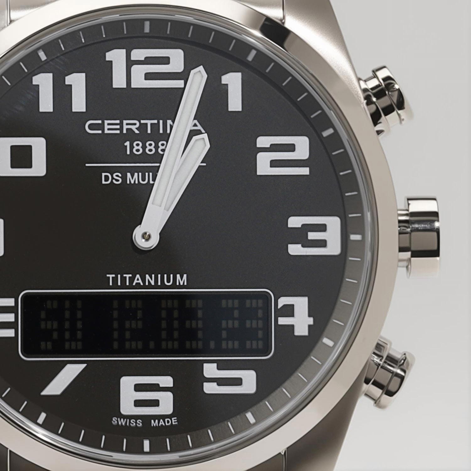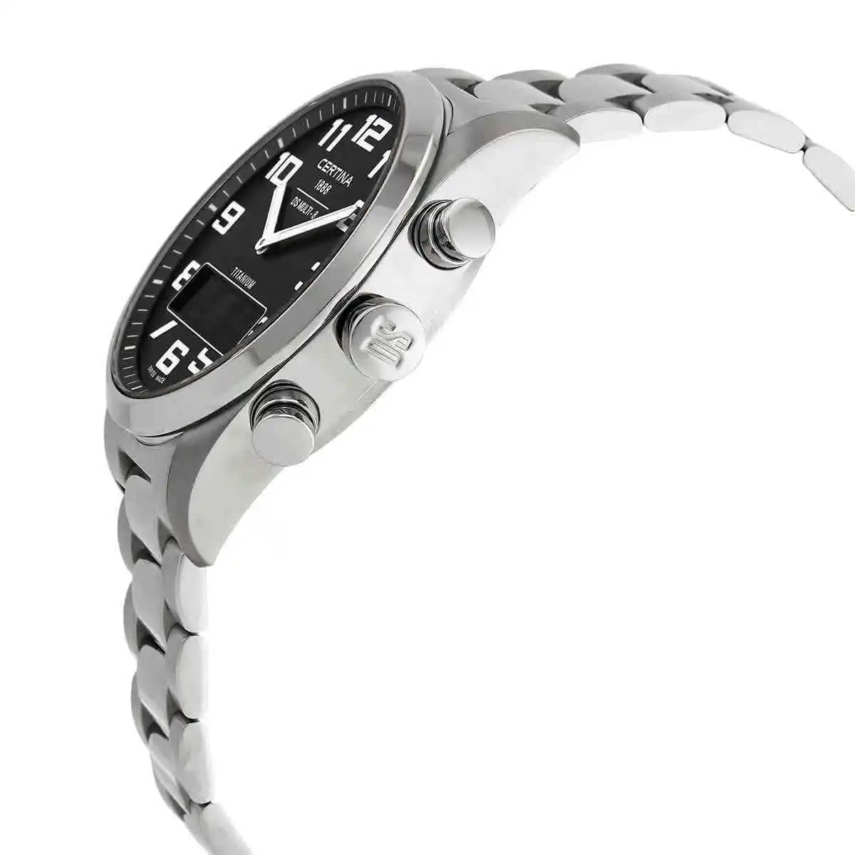 Мужские швейцарские кварцевые водонепроницаемые часы с будильникомБудильникБуди́льник — часы, в заданный момент времени подающие звуковой, световой и/или в редких случаях другой сигнал. Certina DS Multi C020.419.44.082.01, кварцевый механизм с высокой точностью. Сапфировое стеклоСапфировое стеклоПрочный и надёжный материал из кристалла сапфира синтетического происхождения, характеризующийся особой твёрдостью и устойчивостью к царапинам и повреждениям. устойчивое к появлению царапин, обладающее высокой прозрачностью. Класс водозащиты: 100 метров, позволит плавать, нырять и заниматься другими водными видами спорта. Корпус часов изготовлен из титана. Титановый браслет на раскладной застёжкеРаскладная застёжкаТакой тип застёжки используется только на браслетах из металла. Она никогда не раскрывается полностью, происходит разделение на 2 и более частей. Раскладывающая застёжка снизит вероятность потери часов к минимуму.. Круглый титановый корпус c сатинированной поверхностью. Стильный инверсионный матричный дисплей расширяет функционал часов. Второй часовой поясВторой часовой поясФункция, позволяющая отображать время двух часовых поясов одновременно. отображается на цифровом дисплее. Заостренные прямоугольные стрелки в стиле Baton с люминесцентным покрытиемЛюминесцентное покрытиеПозволяет считывать показания времени в темноте. Производители наносят на стрелки, часовые индексы, безель или поверхность циферблата светонакопительный состав, дающий холодное свечение., которое светится в темноте после непродолжительной зарядки на свету. Метки в виде арабских цифр. Задняя крышка крепится на винтах.