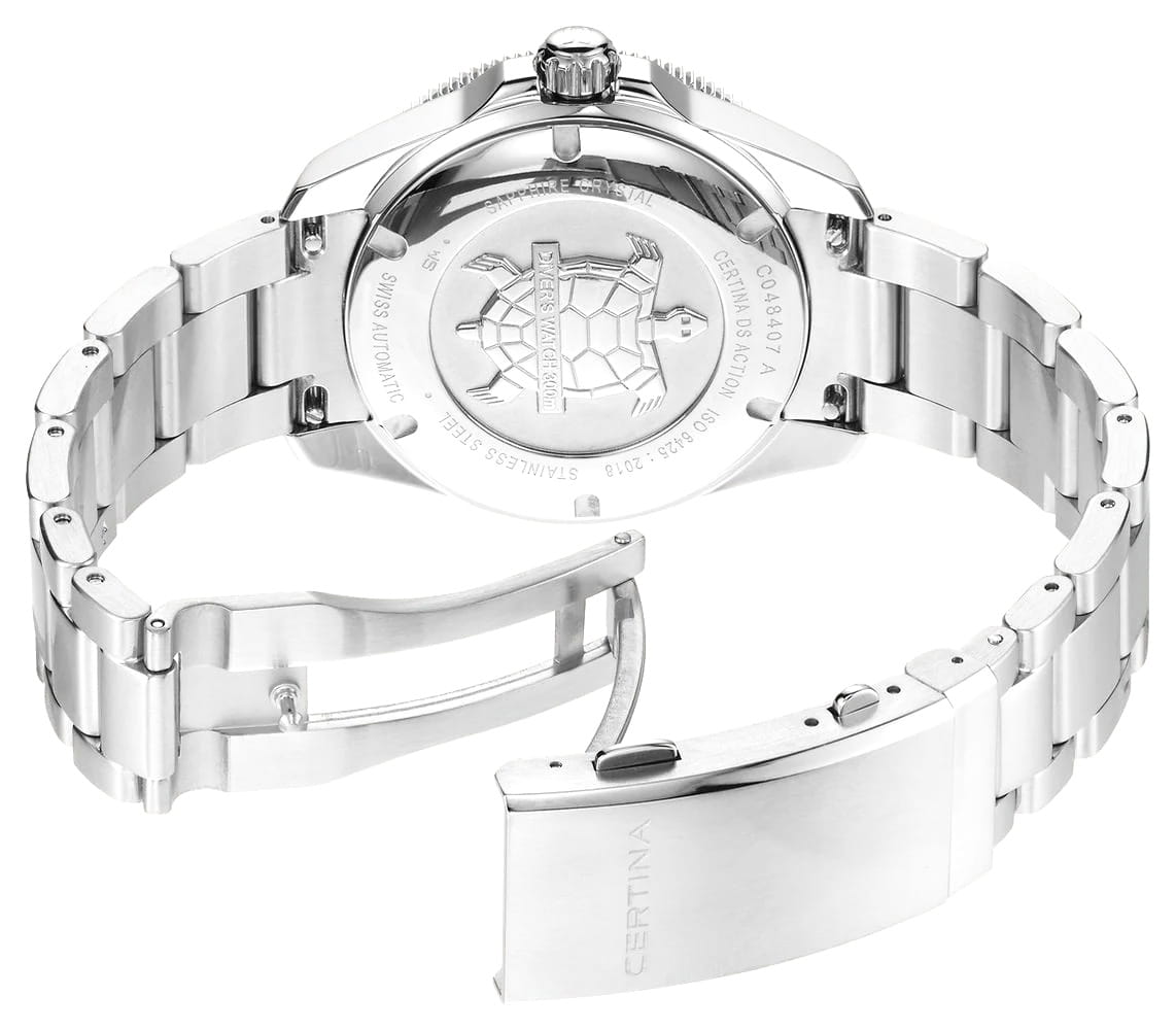 Мужские механические часы Certina DS Action C048.407.11.011.00 с автоматическим механизмом — это надёжный аксессуар, сочетающий в себе швейцарское качество и функциональность. Модель оснащена калибром POWERMATIC 80.611, обеспечивающим запас хода до 80 часов, что делает её удобной для повседневного использования. Корпус выполнен из нержавеющей стали диаметром 40,5 мм и толщиной 14,1 мм, а его поверхность защищена сапфировым стекломСапфировое стеклоПрочный и надёжный материал из кристалла сапфира синтетического происхождения, характеризующийся особой твёрдостью и устойчивостью к царапинам и повреждениям., устойчивым к царапинам и механическим повреждениям. Заводная головка с винтовым замком обеспечивает надёжную фиксацию на запястье. Браслет из стали серебристого цвета шириной 20 мм оснащён Раскладная застёжкаРаскладная застёжкаТакой тип застёжки используется только на браслетах из металла. Она никогда не раскрывается полностью, происходит разделение на 2 и более частей. Раскладывающая застёжка снизит вероятность потери часов к минимуму., обеспечивающей комфорт и надёжную фиксацию. Циферблат белого цвета дополнен точечными и батонными метками, а стрелки и индексы имеют Люминесцентное покрытиеЛюминесцентное покрытиеПозволяет считывать показания времени в темноте. Производители наносят на стрелки, часовые индексы, безель или поверхность циферблата светонакопительный состав, дающий холодное свечение., обеспечивающее отличную читаемость даже в условиях слабого освещения. Вращающийся безельБезельВнешний ободок, закрепляющий стекло. В спортивных часах так называется поворотное кольцо с делениями на циферблате, выполняет роль таймера – замеряет отрезки времени на шкале. Неподвижный безель – элемент декора. Однонаправленно вращающийся безель на дайверских часах позволяет фиксировать моменты погружения и выныривания на поверхность. с керамической вставкой добавляет модели спортивный характер. Часы водонепроницаемы более чем на 200 метров (, что позволяет использовать их при плавании и других водных активностях без глубокого погружения. Эти часы станут универсальным аксессуаром для тех, кто ценит сочетание стиля, функциональности и надёжности — идеальный выбор для повседневной носки и активного образа жизни.