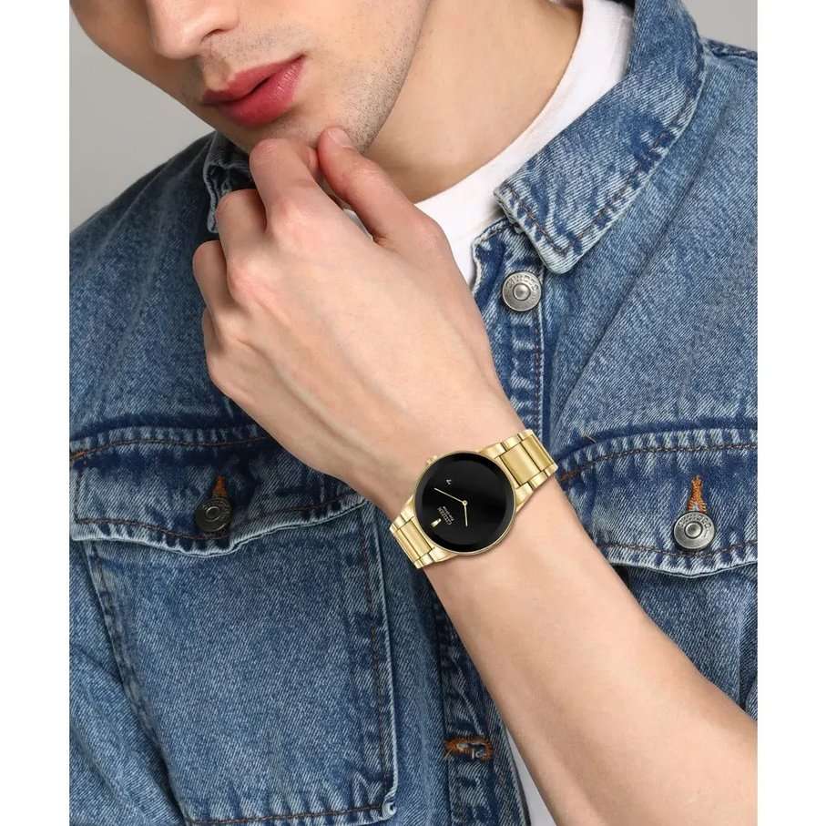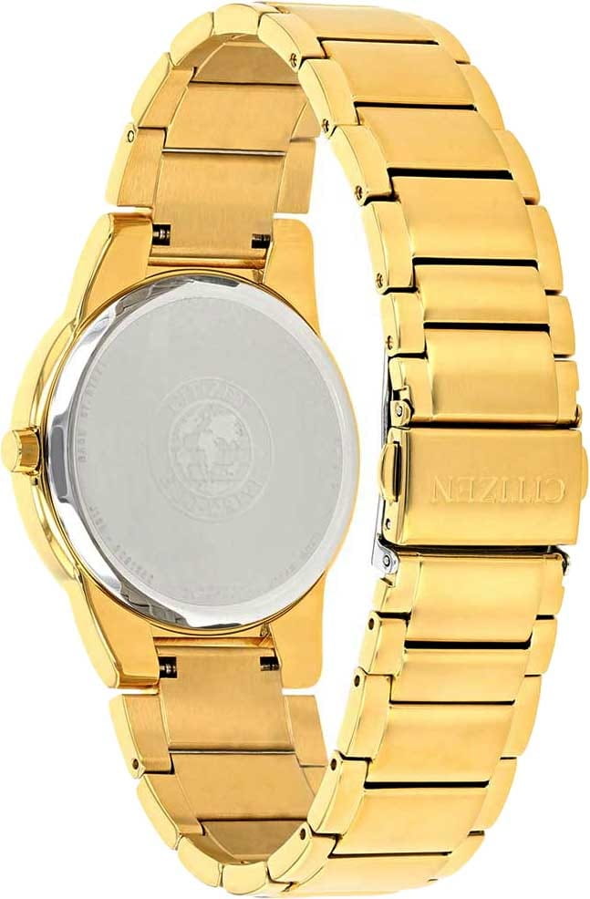 Часы Citizen AU1062-56E представлены в строгом и элегантном дизайне, идеально подходящем для делового стиля. Корпус и браслет выполнены из высококачественной нержавеющей стали с износостойким золотистым IP-покрытиемIP-покрытиеМетод ионного напыления. Демонстрирует повышенную устойчивость к истиранию, окислению и химическим веществам. Под воздействием высокого давления и температуры около 1500°C молекулы металла надёжно соединяются с частицами корпуса часов., что обеспечивает долговечность и презентабельный внешний вид. Черный циферблат с минималистичным оформлением подчеркивает сдержанность модели, а окошко даты удобно расположено в положении 3 часа. Надежный кварцевый механизм Citizen J165 работает на инновационной системе Eco-Drive, которая питается от солнечной энергии и не требует замены батарейки, обеспечивая запас хода до 270 дней. Часы оснащены функцией индикации заряда EOLEOLПредставляет собой систему, уведомляющую владельца часов о необходимости замены элемента питания. За 2 недели до полного разряда батарейки секундная стрелка перестаёт ходить чётко и начинает перепрыгивать на 3-4 деления. и защитой от перезаряда. Минеральное стеклоМинеральное стеклоМинеральное стекло представляет собой искусственно выращенный минерал кварца. Такое стекло отличается особой устойчивостью к повреждениям и царапинам. Уступает по некоторым качествам сапфировому стеклу. надежно защищает циферблат от случайных повреждений, а водозащита уровня WR30 позволяет не снимать часы при случайном контакте с водой. Диаметр корпуса составляет 40 мм, что делает модель универсальным аксессуаром для любого случая. Раскладная застёжкаРаскладная застёжкаТакой тип застёжки используется только на браслетах из металла. Она никогда не раскрывается полностью, происходит разделение на 2 и более частей. Раскладывающая застёжка снизит вероятность потери часов к минимуму. на браслете обеспечивает дополнительный комфорт при носке.