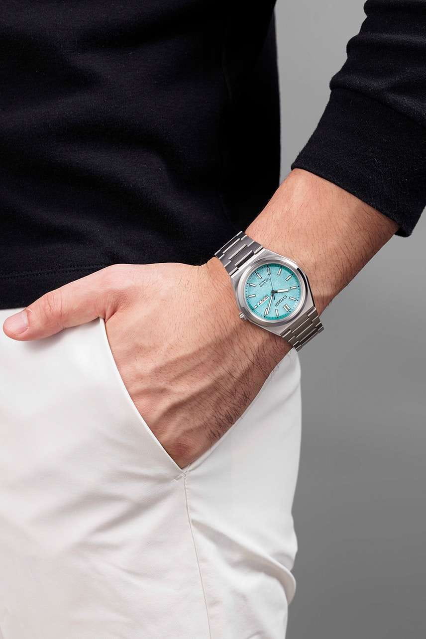 Часы Citizen AW0130-85M сочетают в себе японское качество, современный стиль и передовые технологии. Корпус и браслет модели выполнены из суперлегкого титана, что обеспечивает легкость и комфорт в носке, а также высокую прочность и устойчивость к коррозии. Диаметр корпуса составляет 39,5 мм, толщина — 9,8 мм, вес часов — всего около 91 грамма. Бирюзовый текстурный циферблат украшен центральными часовой, минутной и секундной стрелками, а также апертурой даты и дня недели в положении 3 часа. Надежный кварцевый механизм Citizen J800 работает на инновационной системе Eco-Drive, питается от солнечной энергии и не требует замены батарейки, обеспечивая запас хода до 240 дней. Часы оснащены функцией индикации уровня заряда EOLEOLПредставляет собой систему, уведомляющую владельца часов о необходимости замены элемента питания. За 2 недели до полного разряда батарейки секундная стрелка перестаёт ходить чётко и начинает перепрыгивать на 3-4 деления., что позволяет всегда быть уверенным в их работе. Сапфировое стеклоСапфировое стеклоПрочный и надёжный материал из кристалла сапфира синтетического происхождения, характеризующийся особой твёрдостью и устойчивостью к царапинам и повреждениям. надежно защищает циферблат от царапин, а водозащита 100 метров позволяет использовать часы во время плавания без погружения. Стрелки и часовые метки с люминесцентным покрытиемЛюминесцентное покрытиеПозволяет считывать показания времени в темноте. Производители наносят на стрелки, часовые индексы, безель или поверхность циферблата светонакопительный состав, дающий холодное свечение. обеспечивают отличную читаемость даже в темноте. Раскладная застёжкаРаскладная застёжкаТакой тип застёжки используется только на браслетах из металла. Она никогда не раскрывается полностью, происходит разделение на 2 и более частей. Раскладывающая застёжка снизит вероятность потери часов к минимуму. на титановом браслете обеспечивает дополнительное удобство.
