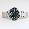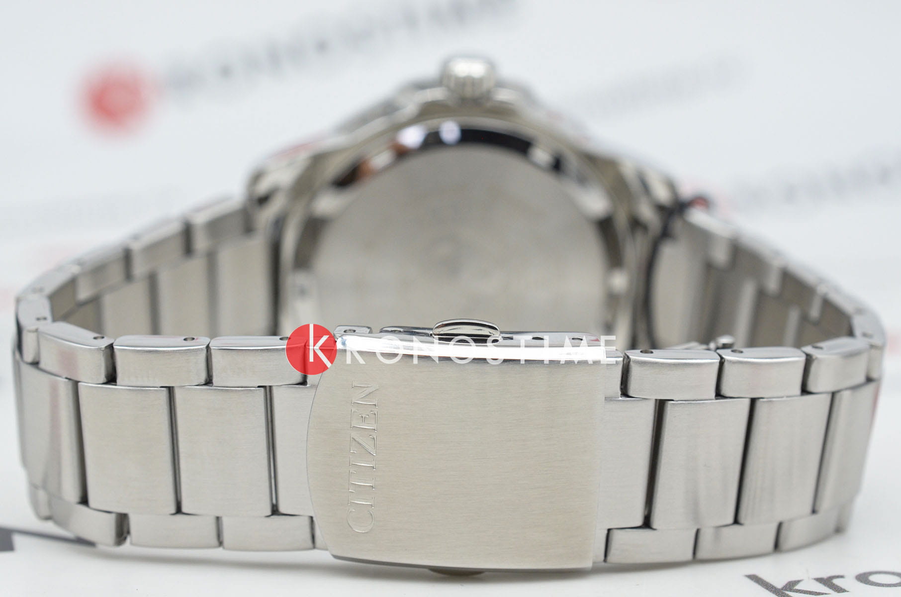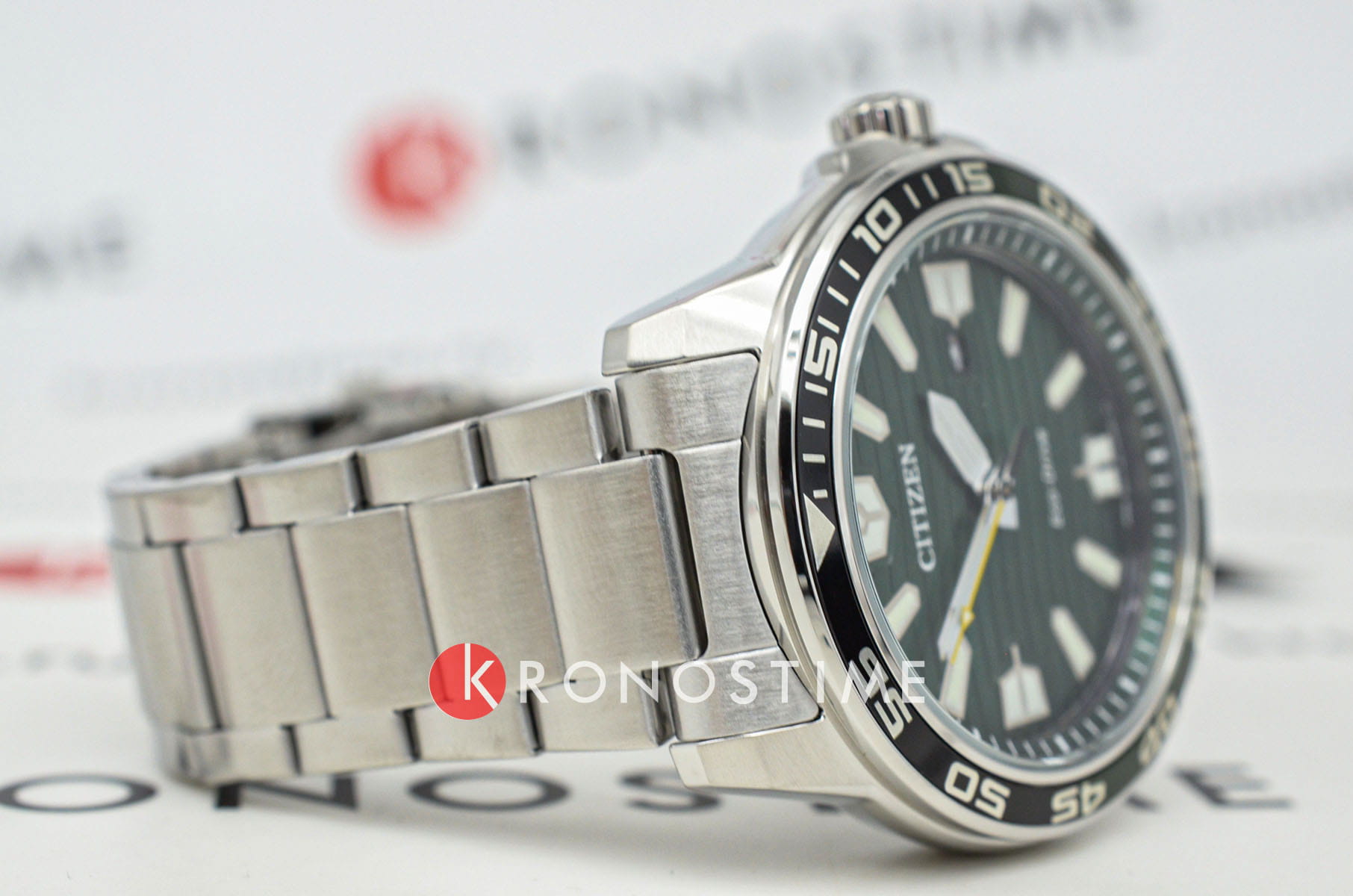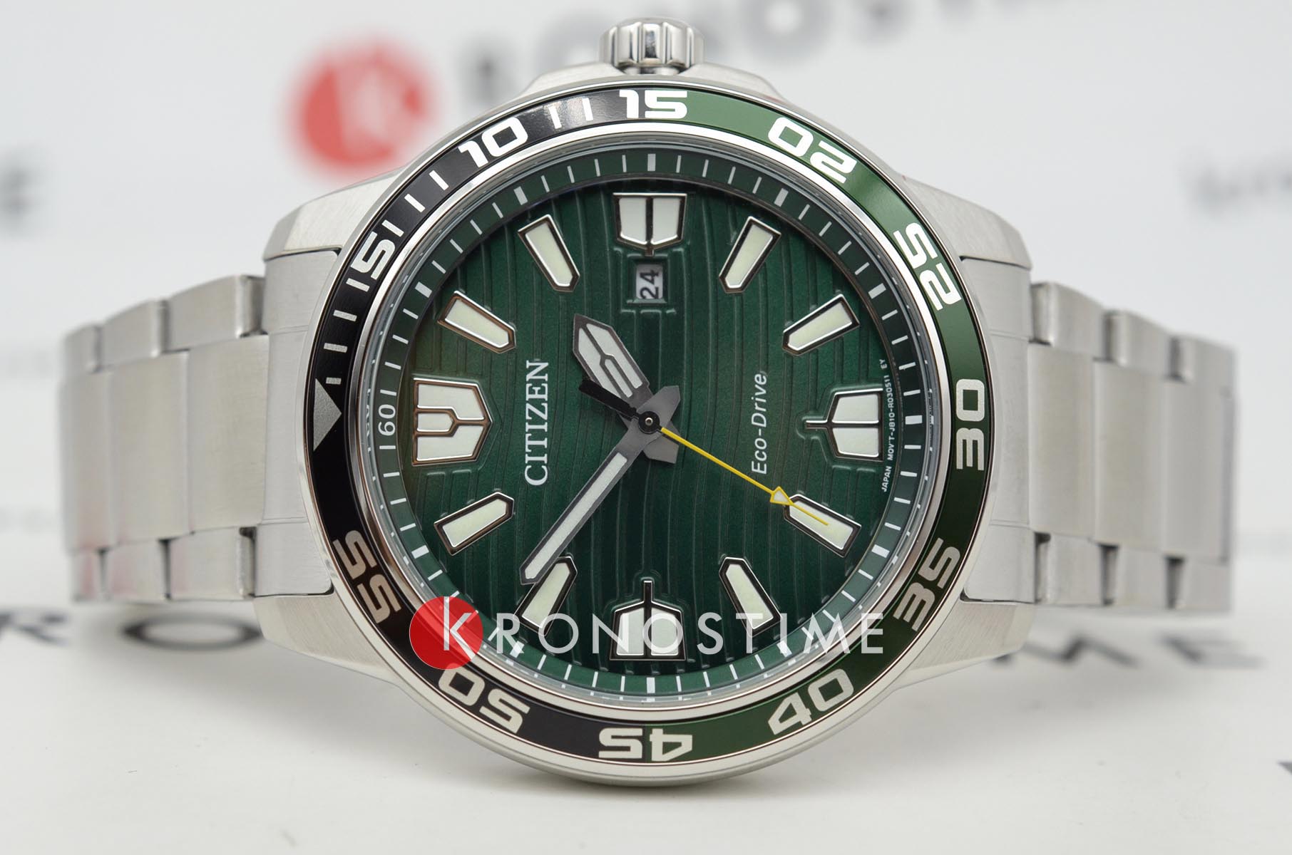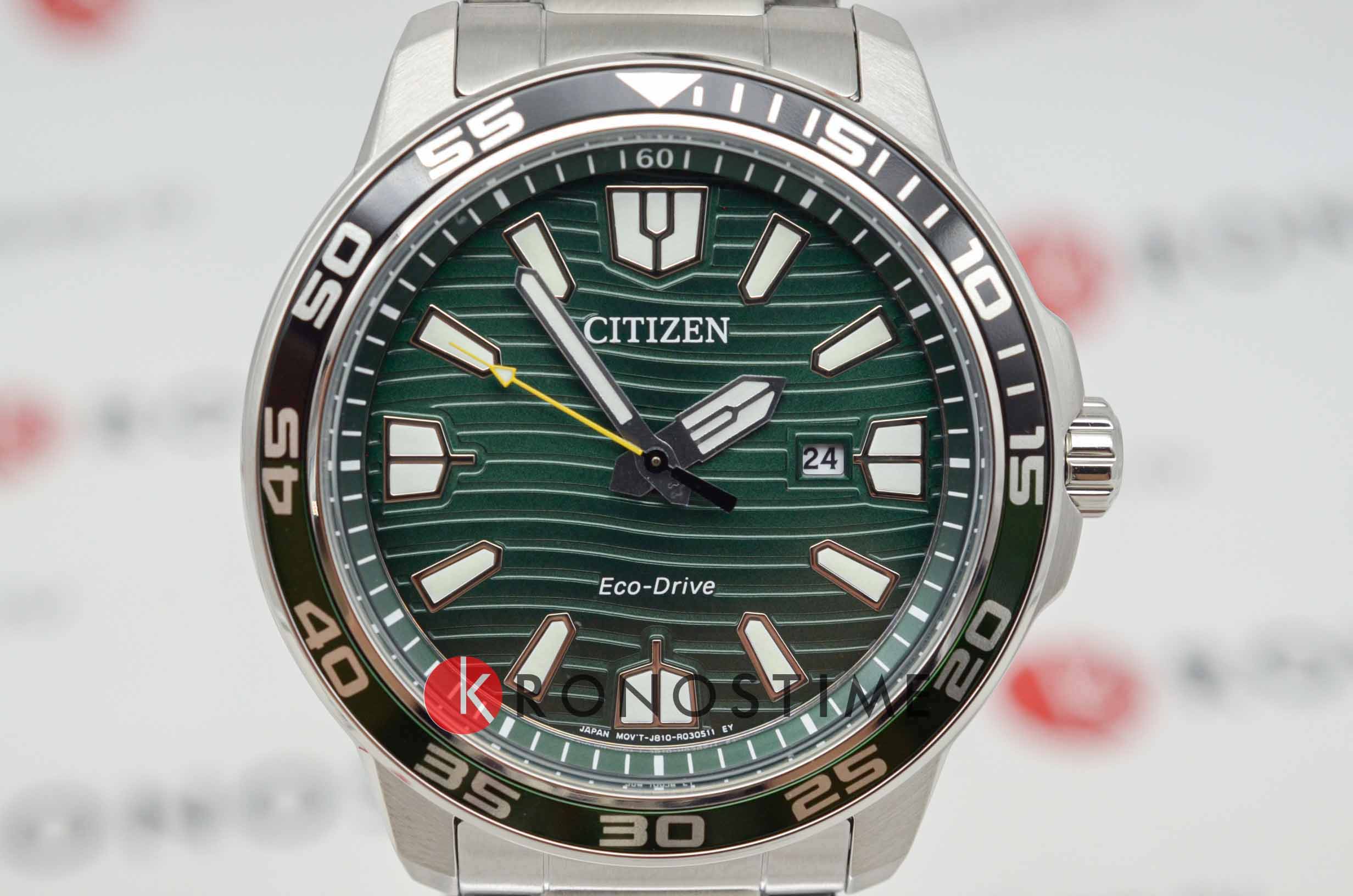 Часы Citizen AW1526-89X – это стильная и надежная модель японского производства, идеально подходящая для активного образа жизни. Корпус выполнен из высококачественной нержавеющей стали, в то время как на безельБезельВнешний ободок, закрепляющий стекло. В спортивных часах так называется поворотное кольцо с делениями на циферблате, выполняет роль таймера – замеряет отрезки времени на шкале. Неподвижный безель – элемент декора. Однонаправленно вращающийся безель на дайверских часах позволяет фиксировать моменты погружения и выныривания на поверхность. нанесено черное и зеленое PVD-покрытиеPVDУльтратонкое покрытие наносится в технике вакуумного напыления, сочетает в себе нитрид титана особой прочности со слоем золота или оксида хрома. Несёт в себе декоративную или защитную функцию., браслет также стальной. Зеленый циферблат украшен метками в виде штрихов и оснащен календарем с окошком даты. Защиту от повреждений обеспечивает прочное минеральное стеклоМинеральное стеклоМинеральное стекло представляет собой искусственно выращенный минерал кварца. Такое стекло отличается особой устойчивостью к повреждениям и царапинам. Уступает по некоторым качествам сапфировому стеклу., а водонепроницаемость до 100 метров позволяет не снимать часы во время плавания и занятий спортом. Внутри установлен надежный кварцевый механизм Citizen J810 с инновационной системой Eco-Drive, которая питается от солнечной энергии и не требует замены батарейки, обеспечивая запас хода до 240 дней. Стрелки и часовые метки с люминесцентным покрытиемЛюминесцентное покрытиеПозволяет считывать показания времени в темноте. Производители наносят на стрелки, часовые индексы, безель или поверхность циферблата светонакопительный состав, дающий холодное свечение. обеспечивают отличную читаемость даже в темноте. Функция индикации заряда EOLEOLПредставляет собой систему, уведомляющую владельца часов о необходимости замены элемента питания. За 2 недели до полного разряда батарейки секундная стрелка перестаёт ходить чётко и начинает перепрыгивать на 3-4 деления. подскажет, когда потребуется подзарядка. Корпус диаметром 44.8 мм, толщина 10,8 мм, ширина браслета 22 мм, вес модели составляет 162 грамма. Завинчивающаяся задняя крышка украшена фирменной гравировкой Eco-Drive, а заводная головка оснащена защитой. Надежная раскладная застёжкаРаскладная застёжкаТакой тип застёжки используется только на браслетах из металла. Она никогда не раскрывается полностью, происходит разделение на 2 и более частей. Раскладывающая застёжка снизит вероятность потери часов к минимуму. браслета с системой блокировки гарантирует комфортное и безопасное ношение.
