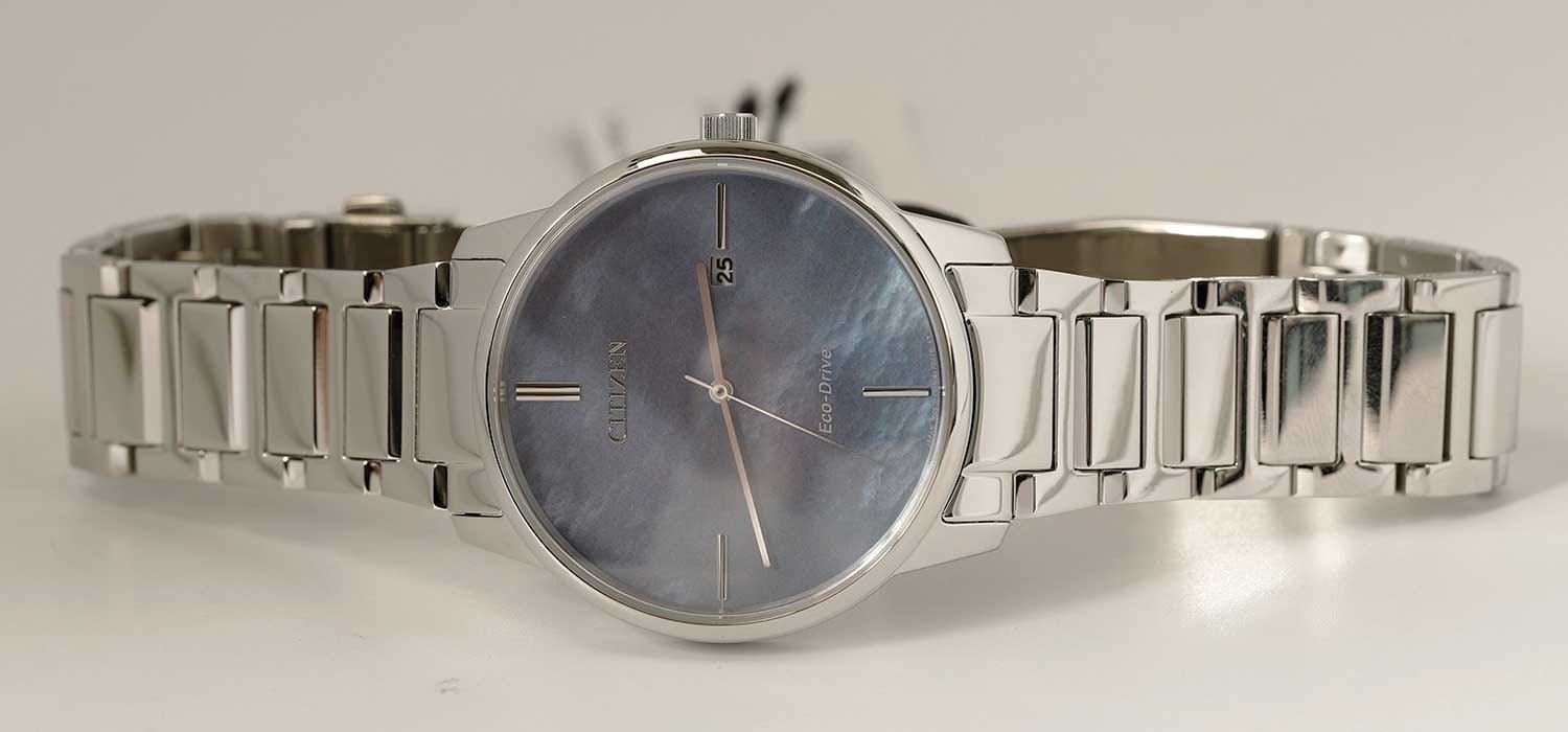 Citizen BM7520-88N — изысканные японские часы, впечатляющие гармоничным сочетанием современного стиля и элегантности. Корпус и браслет выполнены из прочной нержавеющей стали, что обеспечивает надежность и долговечность модели. Особое внимание привлекает перламутровый голубой циферблат с аккуратными метками в виде штрихов, который придает часам утонченный и оригинальный вид. Часы оснащены кварцевым механизмом Citizen E111 с передовой системой Eco-Drive, работающей на солнечной энергии и не требующей замены батарейки, а запас хода составляет до 180 дней. Продуманная функция индикации окончания заряда EOLEOLПредставляет собой систему, уведомляющую владельца часов о необходимости замены элемента питания. За 2 недели до полного разряда батарейки секундная стрелка перестаёт ходить чётко и начинает перепрыгивать на 3-4 деления. и предотвращения перезарядки гарантирует стабильную работу. Сапфировое стеклоСапфировое стеклоПрочный и надёжный материал из кристалла сапфира синтетического происхождения, характеризующийся особой твёрдостью и устойчивостью к царапинам и повреждениям. надежно защищает циферблат от царапин, а водозащита 50WR позволяет не беспокоиться о попадании влаги при повседневном использовании. Окошко с датой удобно расположено на отметке 3 часа. Браслет снабжен раскладной застёжкойРаскладная застёжкаТакой тип застёжки используется только на браслетах из металла. Она никогда не раскрывается полностью, происходит разделение на 2 и более частей. Раскладывающая застёжка снизит вероятность потери часов к минимуму., обеспечивающей комфортную посадку на запястье. Диаметр корпуса составляет 39,2 мм, толщина — 9,5 мм, вес — 137 г. Эта модель отлично подойдет тем, кто ценит стиль, надежность и современные технологии.