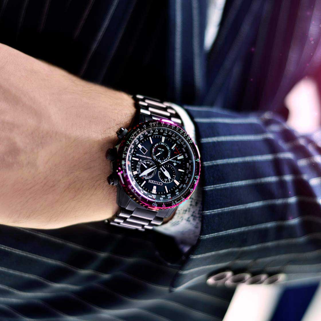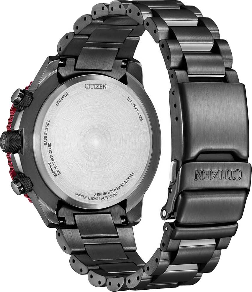 Citizen Promaster CB5009-55E часы-хронографХронографФункция позволяет измерять отрезки времени с особой точностью: часы, минуты, секунды. Верным признаком хронографа является наличие на циферблате 3 дополнительных окошек-счётчиков. с секундомеромСекундомерСекундоме́р — прибор, способный измерять интервалы времени с точностью до долей секунды. спортивного дизайна с высоким уровнем водозащиты. Корпус из нержавеющей стали с IP-покрытиемIP-покрытиеМетод ионного напыления. Демонстрирует повышенную устойчивость к истиранию, окислению и химическим веществам. Под воздействием высокого давления и температуры около 1500°C молекулы металла надёжно соединяются с частицами корпуса часов. диаметром 45,9 мм идеально сбалансирован. Сапфировое стеклоСапфировое стеклоПрочный и надёжный материал из кристалла сапфира синтетического происхождения, характеризующийся особой твёрдостью и устойчивостью к царапинам и повреждениям. обеспечивает отличную защиту циферблата от царапин. Часы работают на основе кварцевого механизма, питание от солнечной энергии. Стальной браслет на раскладной застёжкеРаскладная застёжкаТакой тип застёжки используется только на браслетах из металла. Она никогда не раскрывается полностью, происходит разделение на 2 и более частей. Раскладывающая застёжка снизит вероятность потери часов к минимуму. идеально дополняют дизайн часов, обеспечивая комфортное ношение. Стрелки и метки на циферблате имеют люминесцентное покрытиеЛюминесцентное покрытиеПозволяет считывать показания времени в темноте. Производители наносят на стрелки, часовые индексы, безель или поверхность циферблата светонакопительный состав, дающий холодное свечение. позволяющее легко определять время даже в темноте. Вращающийся безельБезельВнешний ободок, закрепляющий стекло. В спортивных часах так называется поворотное кольцо с делениями на циферблате, выполняет роль таймера – замеряет отрезки времени на шкале. Неподвижный безель – элемент декора. Однонаправленно вращающийся безель на дайверских часах позволяет фиксировать моменты погружения и выныривания на поверхность. с логарифмической линейкой. Функция индикации заряда (EOL) и предотвращения перезарядки. Автоматический прием сигналов от радиовышек, расположенных в различных точках земного шара, которые передают временные сигналы от определенных атомных часов. Коррекция текущего времени радиосигналом на территории почти всей Европы, США, Японии и Китая. Мировое времяМировое время Полезное часовое усложнение, отображающее время в основных городах и известных областях по всему миру, оно связано с часовыми поясами, удобно для путешественников и бизнесменов. - 24 города, переход на зимнее и летнее время. Отображение мирового времени для Северного полушария вынесено на отдельный циферблат, который вращается против часовой стрелки и находится в положении 6 часов. Окошко даты находится в положении 4 часа. Секундомер с точностью 1сек и временем измерения 1ч. 12-ти и 24-х часовой формат. Часы обладают впечатляющей водонепроницаемостью до 200WR, что делает их идеальными для плавания, ныряния и погружений с аквалангом.