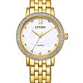 Часы Citizen EL3102-50D представляют собой элегантную модель, выполненную в Японии, сочетающую в себе современные технологии и утончённый дизайн. Корпус и браслет изготовлены из прочной нержавеющей стали с золотистым IP-покрытиемIP-покрытиеМетод ионного напыления. Демонстрирует повышенную устойчивость к истиранию, окислению и химическим веществам. Под воздействием высокого давления и температуры около 1500°C молекулы металла надёжно соединяются с частицами корпуса часов., что обеспечивает долговечность и привлекательный внешний вид. Диаметр корпуса составляет 31 мм, а толщина — всего 7 мм, что делает часы изящными и аккуратными на запястье. Особое внимание привлекает безельБезельВнешний ободок, закрепляющий стекло. В спортивных часах так называется поворотное кольцо с делениями на циферблате, выполняет роль таймера – замеряет отрезки времени на шкале. Неподвижный безель – элемент декора. Однонаправленно вращающийся безель на дайверских часах позволяет фиксировать моменты погружения и выныривания на поверхность., украшенный мерцающими кристаллами, которые придают часам особый шарм и изысканность. Надёжный кварцевый механизм гарантирует точность хода, а водозащита уровня WR 50 позволяет не снимать часы при мытье рук или во время дождя. Перламутровый циферблат украшен часовыми индексами в виде точек и цифр, а также оснащён центральными стрелками часов, минут и секунд для удобного считывания времени и кристаллами. Минеральное стеклоМинеральное стеклоМинеральное стекло представляет собой искусственно выращенный минерал кварца. Такое стекло отличается особой устойчивостью к повреждениям и царапинам. Уступает по некоторым качествам сапфировому стеклу. устойчиво к появлению мелких царапин, сохраняя прозрачность и презентабельный вид.  Стальной браслет с золотистым  IP-покрытиемIP-покрытиеМетод ионного напыления. Демонстрирует повышенную устойчивость к истиранию, окислению и химическим веществам. Под воздействием высокого давления и температуры около 1500°C молекулы металла надёжно соединяются с частицами корпуса часов. и раскладной застёжкойРаскладная застёжкаТакой тип застёжки используется только на браслетах из металла. Она никогда не раскрывается полностью, происходит разделение на 2 и более частей. Раскладывающая застёжка снизит вероятность потери часов к минимуму. надежно фиксирует часы на запястье, обеспечивая комфорт при ежедневном ношении.