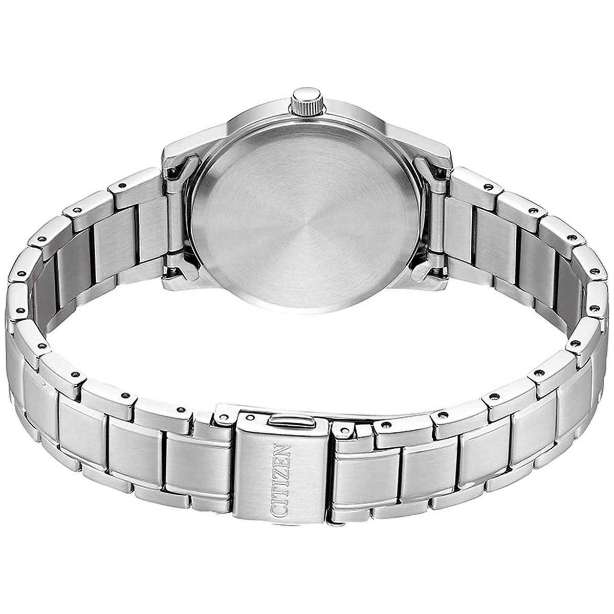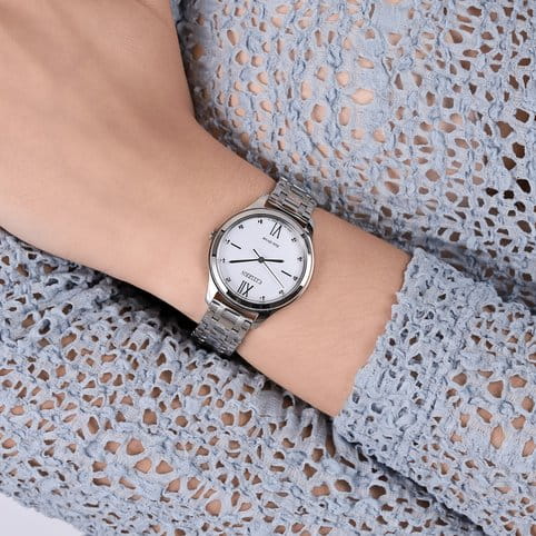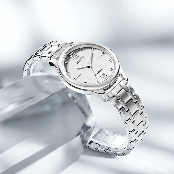 Часы Citizen EM0500-73A — это стильная модель, сочетающая в себе утонченную классику и современные технологии. Корпус и браслет изготовлены из прочной нержавеющей стали, что обеспечивает не только износостойкость, но и элегантный внешний вид. Белый циферблат отличается кристаллами и лаконичным оформлением и защищён надёжным минеральным стекломМинеральное стеклоМинеральное стекло представляет собой искусственно выращенный минерал кварца. Такое стекло отличается особой устойчивостью к повреждениям и царапинам. Уступает по некоторым качествам сапфировому стеклу., устойчивым к царапинам. Часы оснащены инновационной системой Eco-Drive, которая позволяет заряжаться от любого источника света и не требует замены батарейки, а запас энергии составляет до 180 дней. Механизм Citizen E031 гарантирует точность хода, а функция индикации заряда EOLEOLПредставляет собой систему, уведомляющую владельца часов о необходимости замены элемента питания. За 2 недели до полного разряда батарейки секундная стрелка перестаёт ходить чётко и начинает перепрыгивать на 3-4 деления. своевременно подскажет о необходимости подзарядки. Водозащита до 50 метров обеспечивает дополнительную практичность и защищает механизм от влаги при повседневном использовании. Браслет шириной 14 мм и длиной 143 мм удобно фиксируется на запястье с помощью раскладной застёжкиРаскладная застёжкаТакой тип застёжки используется только на браслетах из металла. Она никогда не раскрывается полностью, происходит разделение на 2 и более частей. Раскладывающая застёжка снизит вероятность потери часов к минимуму. с системой блокировки, что обеспечивает надёжность и комфорт в течение всего дня. Диаметр корпуса составляет 32 мм, а толщина — 7,6 мм, благодаря чему часы выглядят изящно и подходят для любого случая.