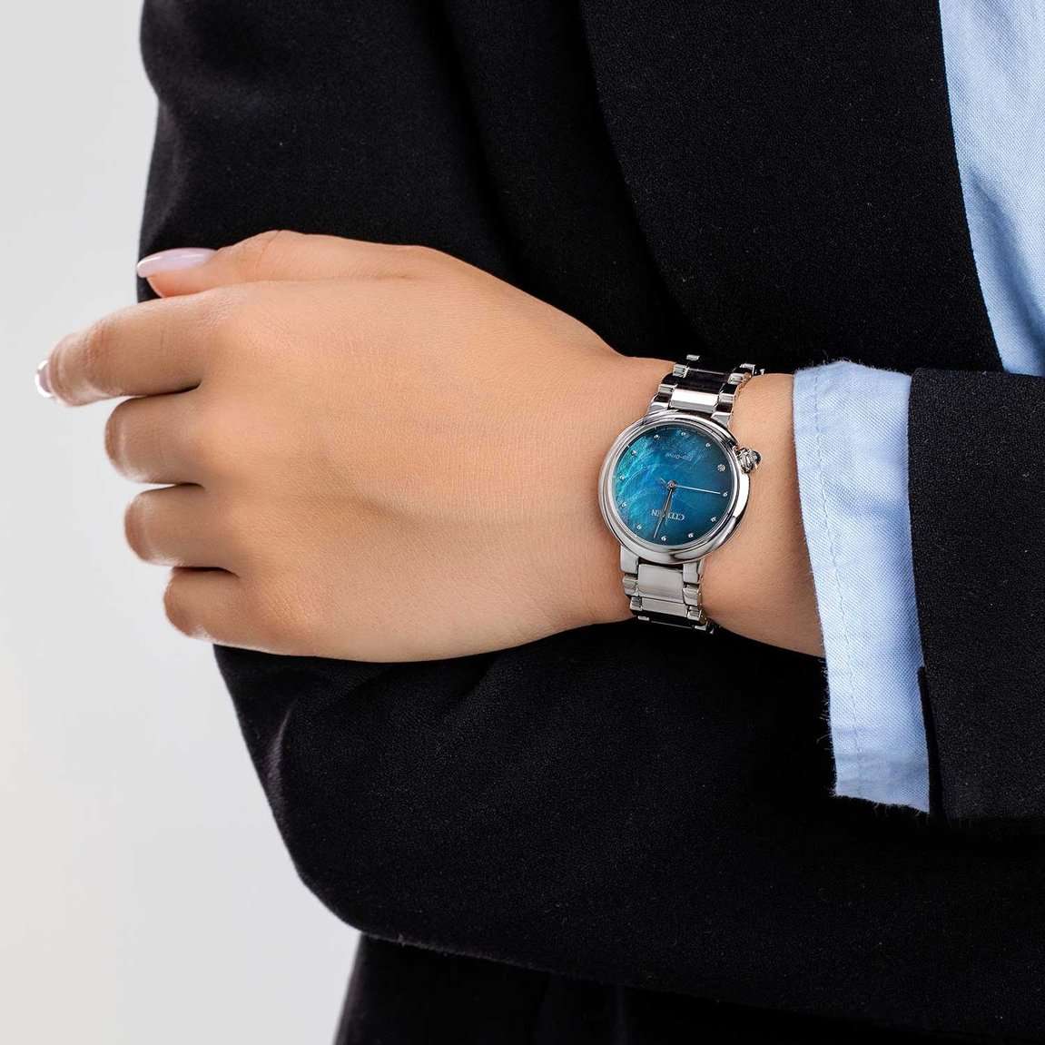 Часы Citizen EM0910-80N — воплощение изысканности и современных технологий, выполненное в Японии. Корпус и литой браслет изготовлены из прочной нержавеющей стали, что гарантирует долговечность и элегантный внешний вид. Перламутровый синий циферблат с завораживающими переливами украшен бриллиантом, а часовые метки выполнены в виде точек, что придаёт образу особую утонченность. Заводная головка с защитой находится в положении 8 часов и также украшена камнем. Защиту от царапин обеспечивает сапфировое стеклоСапфировое стеклоПрочный и надёжный материал из кристалла сапфира синтетического происхождения, характеризующийся особой твёрдостью и устойчивостью к царапинам и повреждениям., сохраняющее безупречный вид часов на длительное время. Модель оснащена инновационной системой Eco-Drive, работающей на солнечной энергии и не требующей замены батарейки, с запасом хода до 180 дней. Предусмотрена функция индикации уровня заряда (EOLEOLПредставляет собой систему, уведомляющую владельца часов о необходимости замены элемента питания. За 2 недели до полного разряда батарейки секундная стрелка перестаёт ходить чётко и начинает перепрыгивать на 3-4 деления.) и предотвращения перезарядки. Диаметр корпуса составляет 30 мм, толщина — 8,5 мм, вес — 74 г, что обеспечивает комфортное ношение в течение всего дня. Водозащита уровня 50WR позволяет не снимать часы при мытье рук или в дождливую погоду. Браслет с застежкой «бабочка»Застёжка "бабочка"Такой вид застёжки дополняется предохранителями, помогающими избежать случайного раскрытия браслета. Обладают изящным исполнением. обеспечивает дополнительный комфорт и безопасность при носке. Эта модель станет не только стильным аксессуаром, но и символом безупречного вкуса и внимания к деталям.