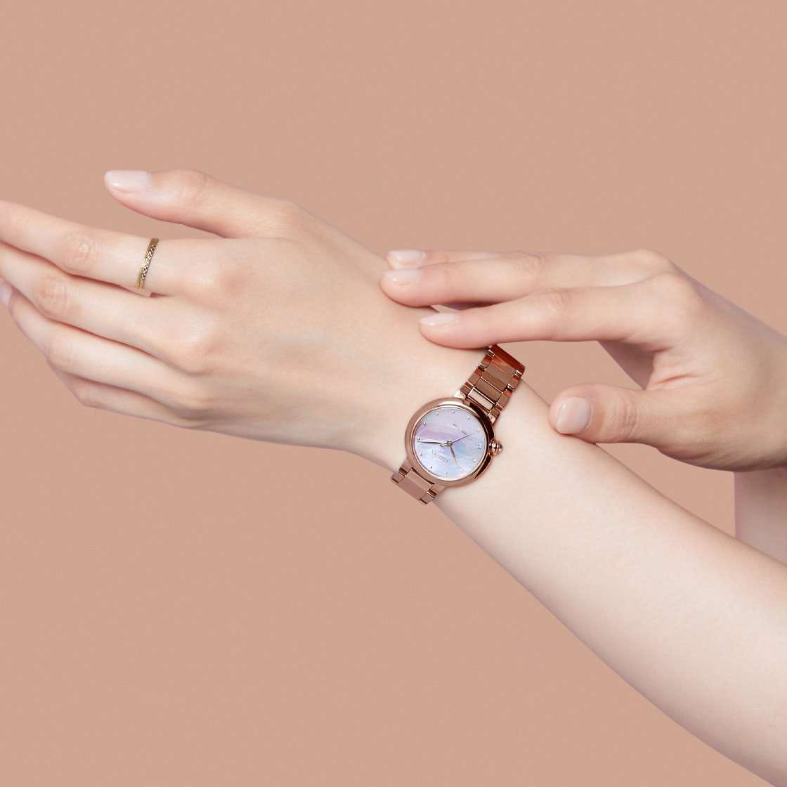 Часы Citizen EM0912-84Y — воплощение изысканности и современных технологий, выполненное в Японии. Корпус и литой браслет изготовлены из прочной нержавеющей стали с золотистым IP-покрытиемIP-покрытиеМетод ионного напыления. Демонстрирует повышенную устойчивость к истиранию, окислению и химическим веществам. Под воздействием высокого давления и температуры около 1500°C молекулы металла надёжно соединяются с частицами корпуса часов., что гарантирует долговечность и элегантный внешний вид. Перламутровый розовый циферблат с завораживающими переливами украшен бриллиантом, а часовые метки выполнены в виде точек, что придаёт образу особую утонченность. Заводная головка с защитой находится в положении 8 часов и также украшена камнем. Защиту от царапин обеспечивает сапфировое стеклоСапфировое стеклоПрочный и надёжный материал из кристалла сапфира синтетического происхождения, характеризующийся особой твёрдостью и устойчивостью к царапинам и повреждениям., сохраняющее безупречный вид часов на длительное время. Модель оснащена инновационной системой Eco-Drive, работающей на солнечной энергии и не требующей замены батарейки, с запасом хода до 180 дней. Предусмотрена функция индикации уровня заряда (EOLEOLПредставляет собой систему, уведомляющую владельца часов о необходимости замены элемента питания. За 2 недели до полного разряда батарейки секундная стрелка перестаёт ходить чётко и начинает перепрыгивать на 3-4 деления.) и предотвращения перезарядки. Диаметр корпуса составляет 30 мм, толщина — 8,5 мм, вес — 74 г, что обеспечивает комфортное ношение в течение всего дня. Водозащита уровня 50WR позволяет не снимать часы при мытье рук или в дождливую погоду. Браслет с застежкой «бабочка»Застёжка "бабочка"Такой вид застёжки дополняется предохранителями, помогающими избежать случайного раскрытия браслета. Обладают изящным исполнением. обеспечивает дополнительный комфорт и безопасность при носке. Эта модель станет не только стильным аксессуаром, но и символом безупречного вкуса и внимания к деталям.