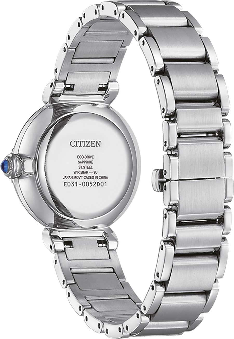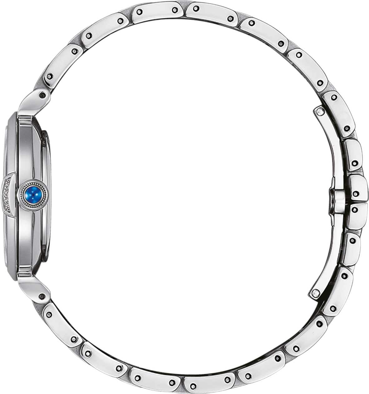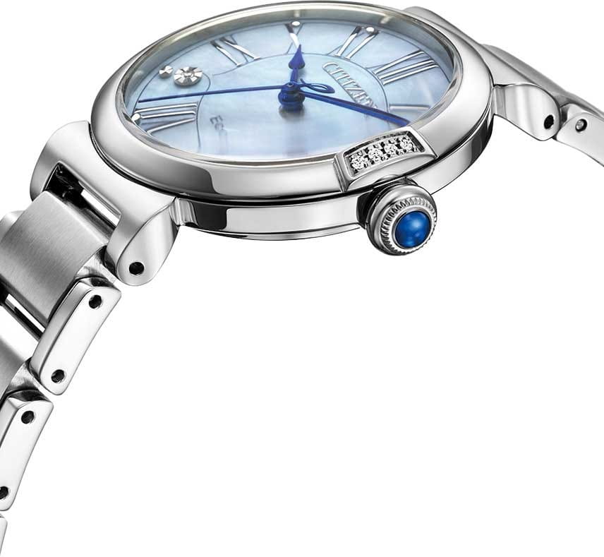 Часы Citizen EM1060-87N созданы в Японии и оснащены надежным кварцевым механизмом калибра Citizen E031 с современной технологией Eco-Drive, которая позволяет работать от солнечной энергии без необходимости замены батареек, обеспечивая запас хода до 180 дней. Корпус и браслет выполнены из прочной нержавеющей стали, что гарантирует долговечность и утонченность внешнего вида, а браслет с застежкой «бабочка»Застёжка "бабочка"Такой вид застёжки дополняется предохранителями, помогающими избежать случайного раскрытия браслета. Обладают изящным исполнением. обеспечивает удобную посадку на запястье. Перламутровый циферблат украшен изящными кристаллами и римскими цифрами, а также защищен сапфировым стекломСапфировое стеклоПрочный и надёжный материал из кристалла сапфира синтетического происхождения, характеризующийся особой твёрдостью и устойчивостью к царапинам и повреждениям., устойчивым к царапинам. Корпус часов также инкрустирован кристаллами, что добавляет аксессуару особое сияние и шарм. Заводная головка украшена камнем в форме кабошона, подчеркивая изысканный дизайн модели. Водозащита 50WR позволяет использовать часы в повседневной жизни без опасений за их сохранность при контакте с водой. Компактные размеры корпуса (диаметр 29,5 мм, толщина 8,3 мм), ширина браслета 10 мм и вес 72 г обеспечивают комфортное ношение в течение всего дня. Эта модель станет ярким акцентом вашего образа и подчеркнет вашу индивидуальность как на деловой встрече, так и на торжественном мероприятии.