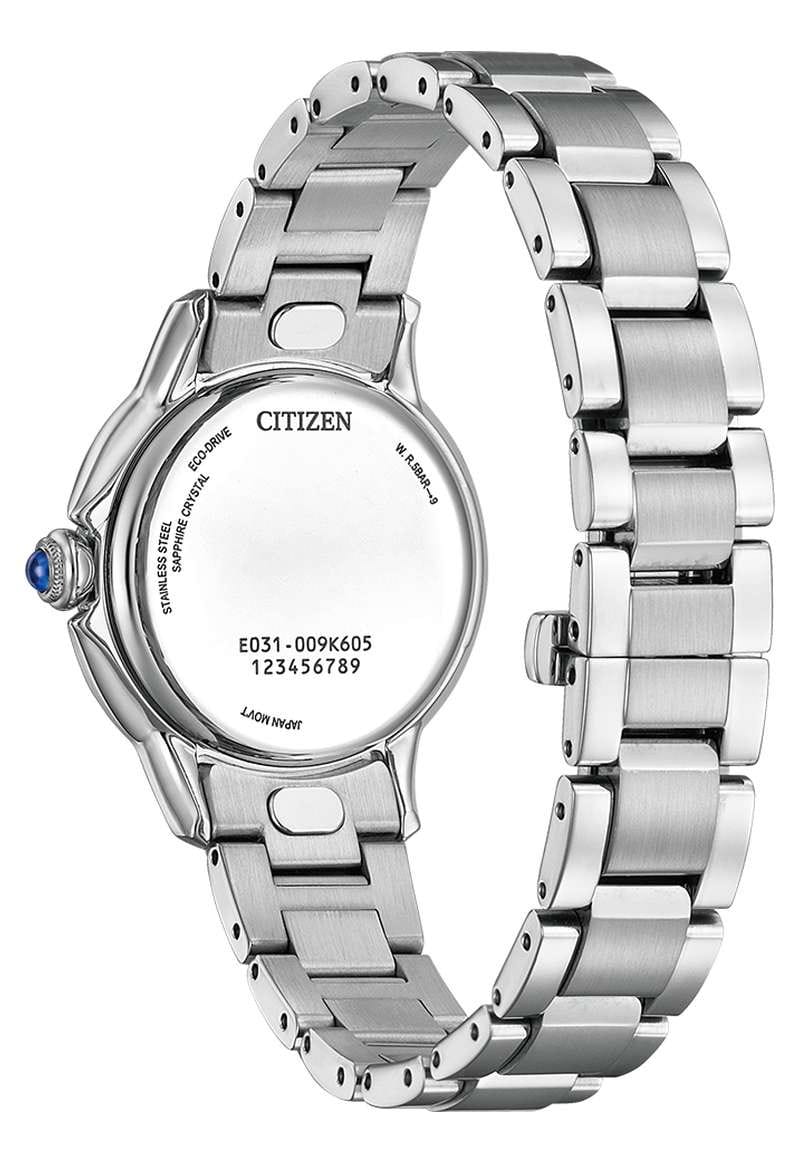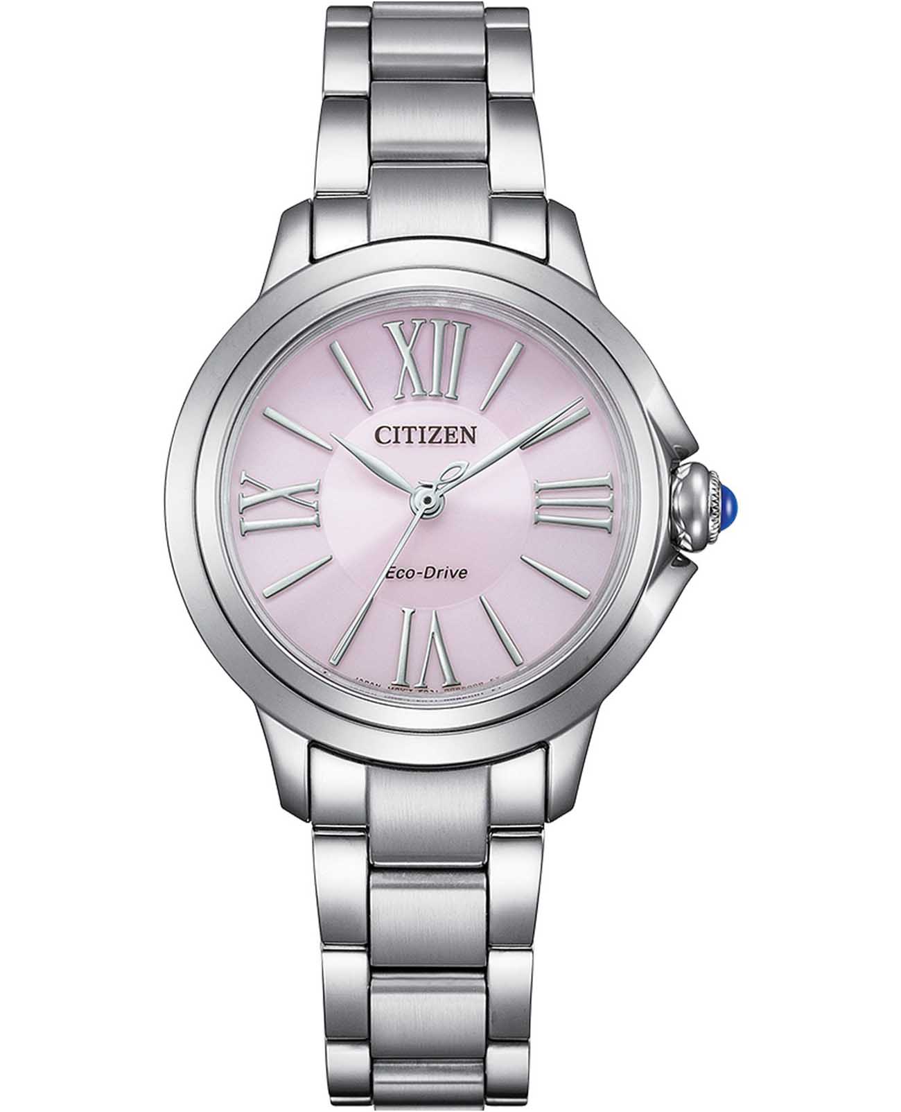 Часы Citizen EM1160-58X — это стильная модель, созданная для современных женщин, которые ценят элегантность и надёжность. Корпус диаметром 31,5 мм и толщиной 8,7 мм выполнен из прочной нержавеющей стали, что обеспечивает долговечность и изысканный внешний вид. Серебристый браслет из нержавеющей стали удобно фиксируется на запястье благодаря застежке «бабочка»Застёжка "бабочка"Такой вид застёжки дополняется предохранителями, помогающими избежать случайного раскрытия браслета. Обладают изящным исполнением. . Розовый циферблат украшен римскими цифрами и аккуратными штрихами, а центральные часовая, минутная и секундная стрелки обеспечивают точное отображение времени. Защиту от случайных царапин гарантирует сапфировое стеклоСапфировое стеклоПрочный и надёжный материал из кристалла сапфира синтетического происхождения, характеризующийся особой твёрдостью и устойчивостью к царапинам и повреждениям., обладающее высокой прочностью. Благодаря инновационному механизму Eco-Drive Caliber E031 часы работают на солнечной энергии и не требуют замены батарейки. Водонепроницаемость уровня WR 50 позволяет не беспокоиться о контакте с водой во время мытья рук или под дождём. Японское качество исполнения и дизайн делают эти часы отличным выбором для повседневного ношения и особых случаев.