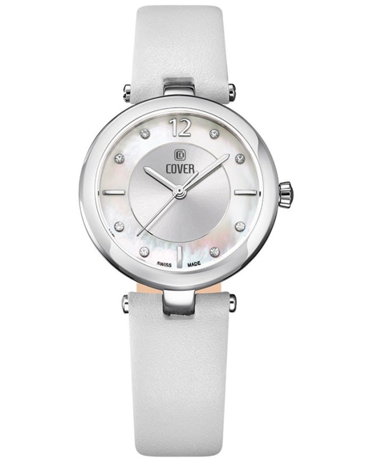 Женственные коктейльные часы COVER CO193.07 из коллекции Amelia работают на кварцевом калибре ETA. Циферблат имеет центральную область серебристого цвета с узором Sunray и белую перламутровую периферийную часть, которые защищены минеральным стекломМинеральное стеклоМинеральное стекло представляет собой искусственно выращенный минерал кварца. Такое стекло отличается особой устойчивостью к повреждениям и царапинам. Уступает по некоторым качествам сапфировому стеклу. с сапфировым напылением. В качестве часовых меток используются 8 кристаллов Swarovski, а также 3 накладных индекса и арабская цифра «12». Корпус из нержавеющей стали диаметром 32 мм с широким полированным безелемБезельВнешний ободок, закрепляющий стекло. В спортивных часах так называется поворотное кольцо с делениями на циферблате, выполняет роль таймера – замеряет отрезки времени на шкале. Неподвижный безель – элемент декора. Однонаправленно вращающийся безель на дайверских часах позволяет фиксировать моменты погружения и выныривания на поверхность.. Часы комплектуются белым кожаным ремешком на стандартной застёжке и имеют маркировку «Swiss Made».