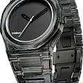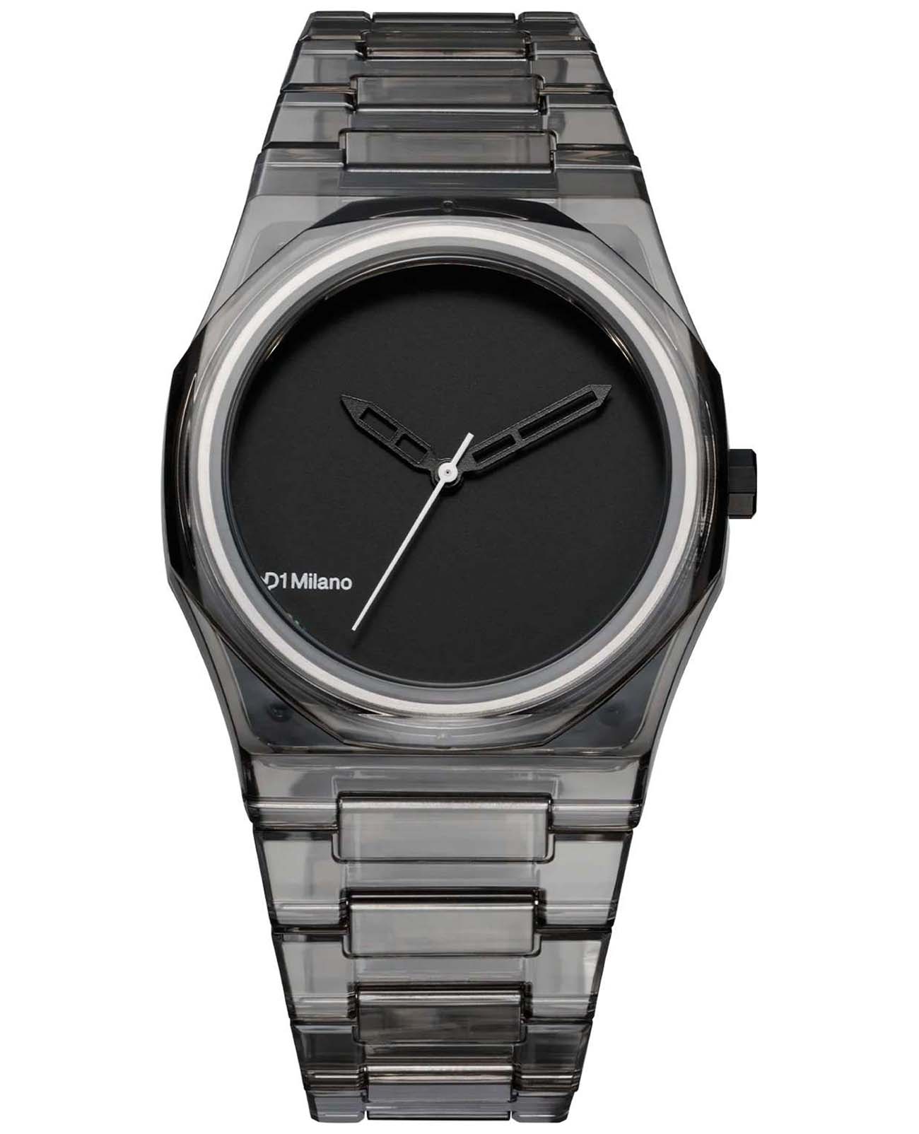 Часы D1 Milano Nylon EXP_Black NYBJ02 – модный и стильный аксессуар-унисекс лаконичного дизайна. Корпус выполнен из прозрачного серого нейлона. Черный матовый циферблат без индексов. Стрелки-скелетон из латуни. Задняя крышка из стали с черным PVD-покрытиемPVDУльтратонкое покрытие наносится в технике вакуумного напыления, сочетает в себе нитрид титана особой прочности со слоем золота или оксида хрома. Несёт в себе декоративную или защитную функцию. закреплена на 4 винтах. Ремешок из прозрачного нейлона имеет застёжку «бабочка» с кнопкамиЗастёжка "бабочка"Такой вид застёжки дополняется предохранителями, помогающими избежать случайного раскрытия браслета. Обладают изящным исполнением. .