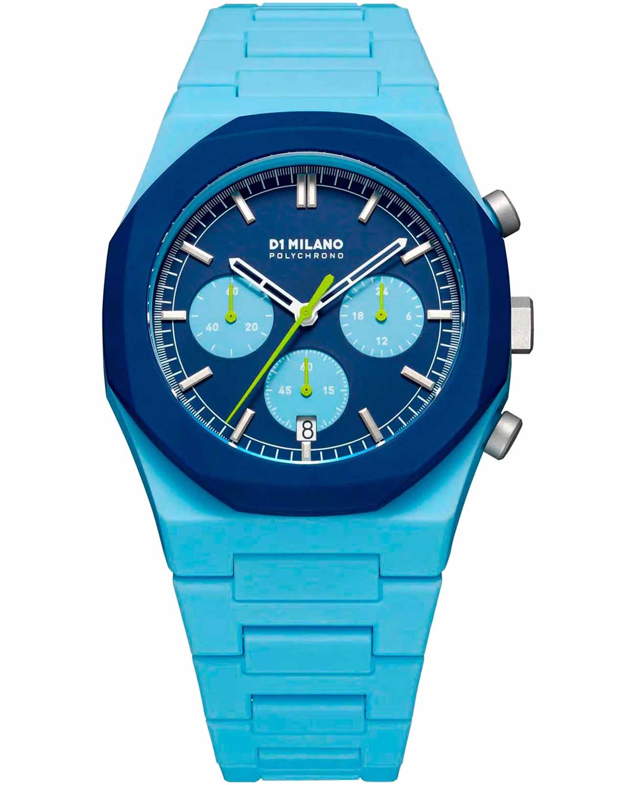 Часы D1 Milano PHBJ03 — это элегантные кварцевые часы, которые впечатляют своим функциональным дизайном, подходят как для мужчин, так и для женщин. Их высокая надежность превращает эти часы в незаменимый аксессуар на каждый день. ХронографХронографФункция позволяет измерять отрезки времени с особой точностью: часы, минуты, секунды. Верным признаком хронографа является наличие на циферблате 3 дополнительных окошек-счётчиков. оснащен секундомеромСекундомерСекундоме́р — прибор, способный измерять интервалы времени с точностью до долей секунды. и синим циферблатом, защищенным минеральным стекломМинеральное стеклоМинеральное стекло представляет собой искусственно выращенный минерал кварца. Такое стекло отличается особой устойчивостью к повреждениям и царапинам. Уступает по некоторым качествам сапфировому стеклу.. На циферблате расположены накладные метки в виде штрихов и три дополнительных циферблата с зелеными стрелками, а также окошко календаря в районе отметки 6 часов. Пластиковый синий безельБезельВнешний ободок, закрепляющий стекло. В спортивных часах так называется поворотное кольцо с делениями на циферблате, выполняет роль таймера – замеряет отрезки времени на шкале. Неподвижный безель – элемент декора. Однонаправленно вращающийся безель на дайверских часах позволяет фиксировать моменты погружения и выныривания на поверхность. отлично сочетается с голубым пластиковым браслетом, застежкой «бабочка»Застёжка "бабочка"Такой вид застёжки дополняется предохранителями, помогающими избежать случайного раскрытия браслета. Обладают изящным исполнением. . Стальная задняя крышка этих часов крепится на 4-х винтах. Водонепроницаемость до 50 метров делает эти часы идеальным выбором для повседневного использования.