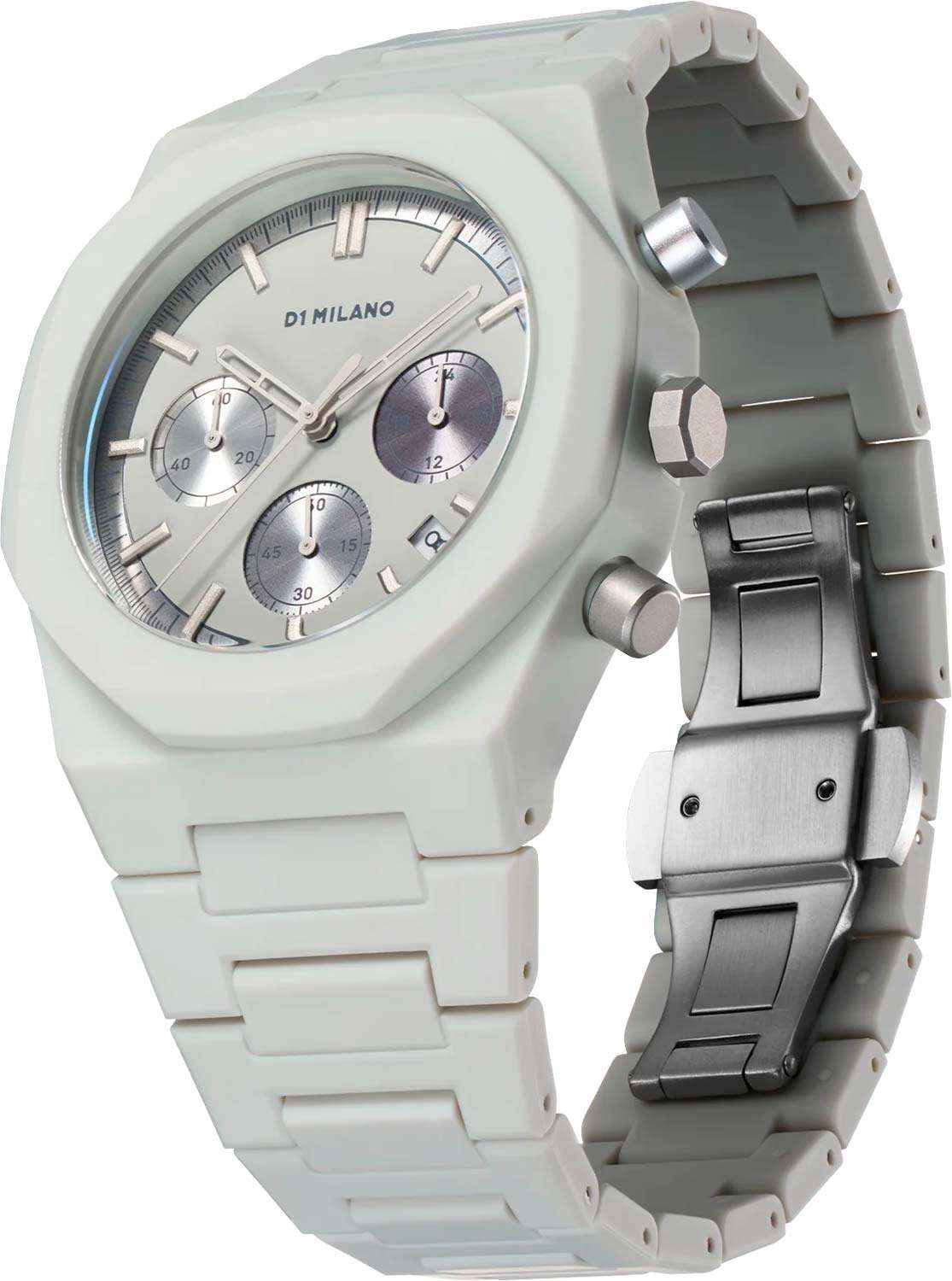 Часы D1 Milano PHBJ08 — это элегантные кварцевые часы, которые впечатляют своим функциональным дизайном, подходят как для мужчин, так и для женщин. Их высокая надежность превращает эти часы в незаменимый аксессуар на каждый день. ХронографХронографФункция позволяет измерять отрезки времени с особой точностью: часы, минуты, секунды. Верным признаком хронографа является наличие на циферблате 3 дополнительных окошек-счётчиков. оснащен секундомеромСекундомерСекундоме́р — прибор, способный измерять интервалы времени с точностью до долей секунды. и серым циферблатом, защищенным минеральным стекломМинеральное стеклоМинеральное стекло представляет собой искусственно выращенный минерал кварца. Такое стекло отличается особой устойчивостью к повреждениям и царапинам. Уступает по некоторым качествам сапфировому стеклу.. На циферблате расположены накладные метки в виде штрихов и три дополнительных циферблата с серыми стрелками, а также окошко календаря в районе отметки «4:30». Пластиковый серый безельБезельВнешний ободок, закрепляющий стекло. В спортивных часах так называется поворотное кольцо с делениями на циферблате, выполняет роль таймера – замеряет отрезки времени на шкале. Неподвижный безель – элемент декора. Однонаправленно вращающийся безель на дайверских часах позволяет фиксировать моменты погружения и выныривания на поверхность. отлично сочетается с таким же пластиковым браслетом, застежкой «бабочка»Застёжка "бабочка"Такой вид застёжки дополняется предохранителями, помогающими избежать случайного раскрытия браслета. Обладают изящным исполнением. . Стальная задняя крышка этих часов крепится на 4-х винтах. Водонепроницаемость до 50 метров делает эти часы идеальным выбором для повседневного использования.