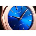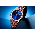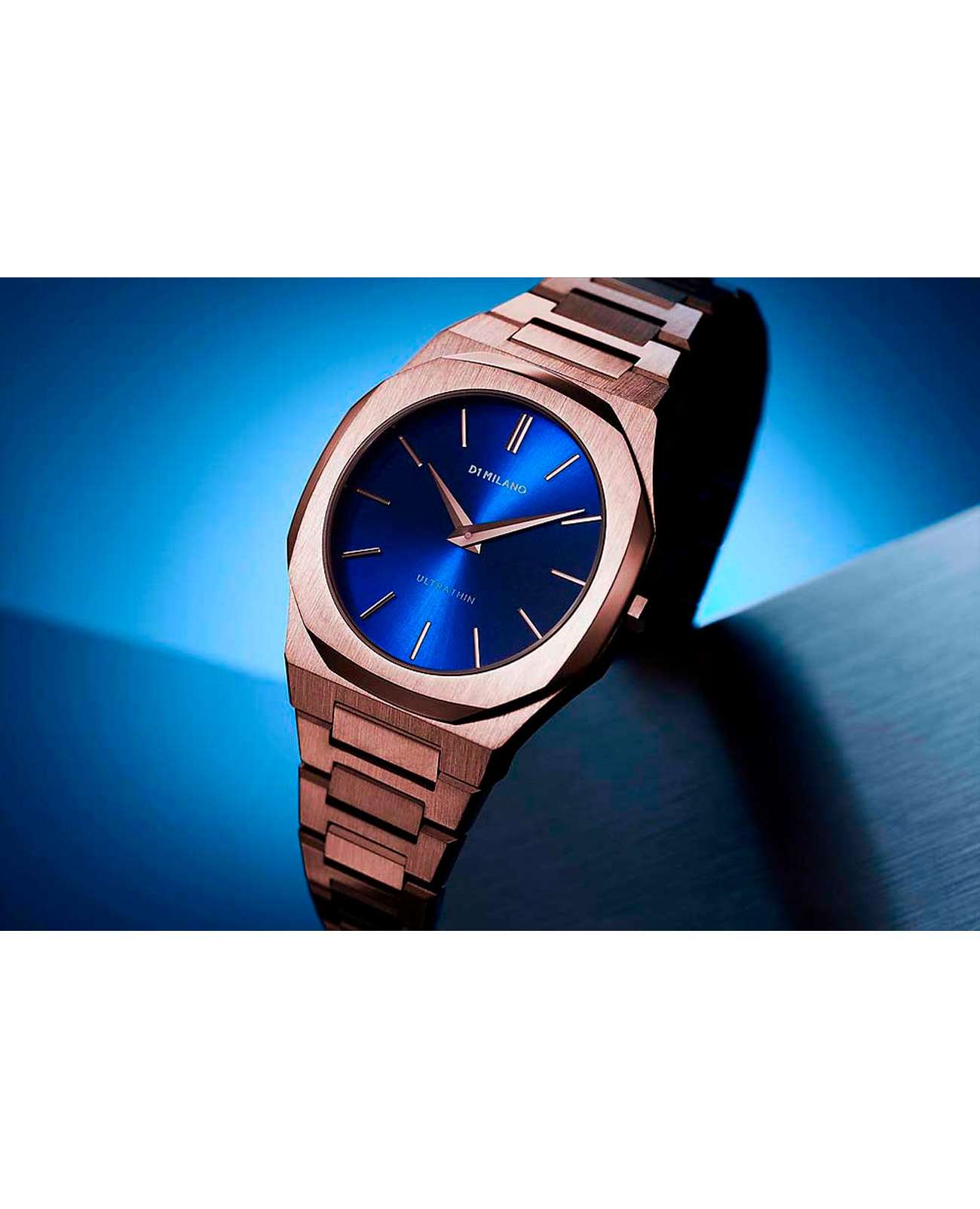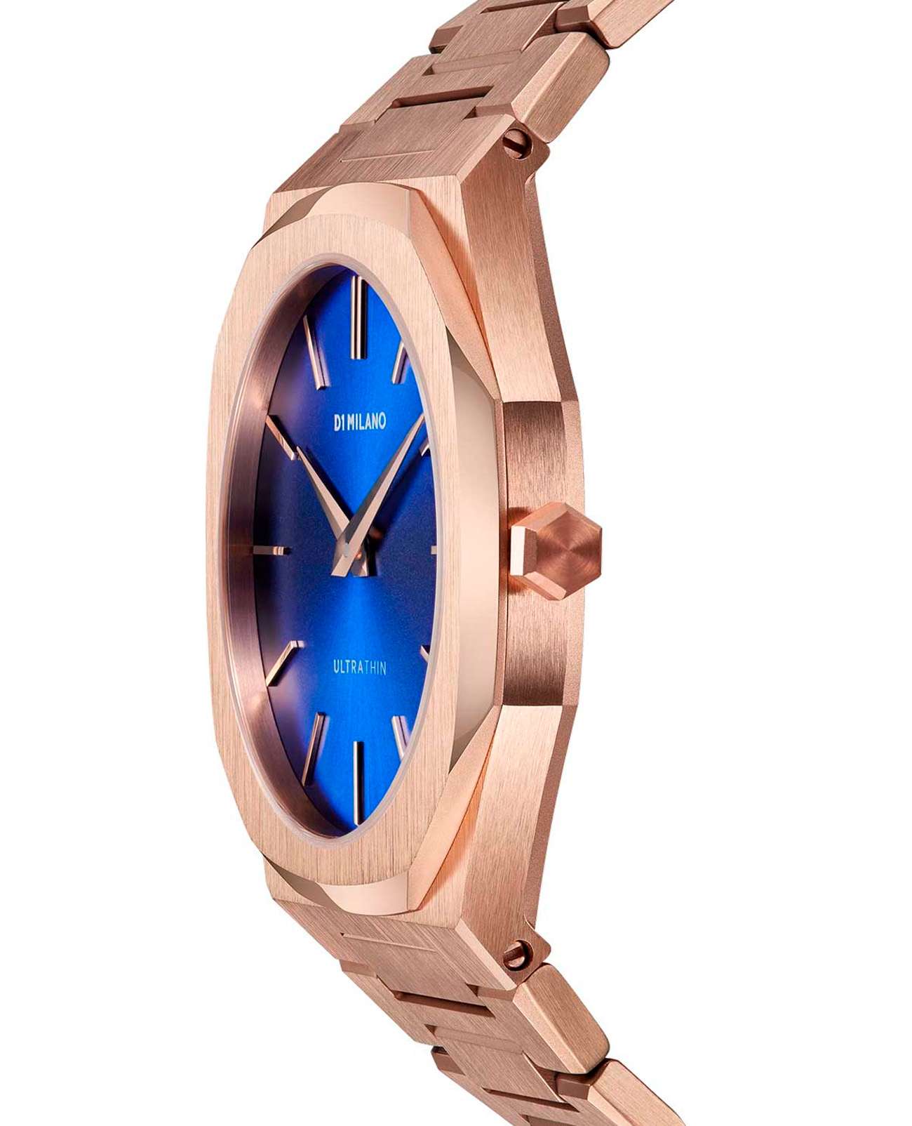 Женские наручные часы D1 Milano UTBL12 из коллекции Ultra Thin сочетают в себе элегантный дизайн и современные технологии. Модель обладает круглым корпусом диаметром 34 мм, изготовленным из высококачественной нержавеющей стали 316L с PVD-покрытиемPVDУльтратонкое покрытие наносится в технике вакуумного напыления, сочетает в себе нитрид титана особой прочности со слоем золота или оксида хрома. Несёт в себе декоративную или защитную функцию.. Толщина ультратонкого корпуса составляет всего 6 мм, делая аксессуар легким и удобным для повседневного использования. Браслет также выполнен из нержавеющей стали с PVD-покрытиемPVDУльтратонкое покрытие наносится в технике вакуумного напыления, сочетает в себе нитрид титана особой прочности со слоем золота или оксида хрома. Несёт в себе декоративную или защитную функцию. и с раскладной застежкойРаскладной замокДанный вариант застежки используется только на часах с металлическим браслетом. Отличительная особенность такого крепления в том, что длина браслета становится универсальной и вы можете самостоятельно отрегулировать нужный вам размер – застежка просто двигается по браслету часов., гарантирующей комфортное ношение и безопасность. Синий циферблат с эффектом Sunray украшен метками в виде штрихов и оснащен стрелочным механизмом, который подчеркивает элегантность модели. Для защиты используется сапфировое стеклоСапфировое стеклоПрочный и надёжный материал из кристалла сапфира синтетического происхождения, характеризующийся особой твёрдостью и устойчивостью к царапинам и повреждениям. с антибликовым покрытиемАнтибликовое покрытиеСлой оксида металла в 0,13-0,3 микрон, благодаря которому стекло часов не бликует и не отражает свет. Антибликовое покрытие уменьшает отражение света в 10 раз, обеспечивая отличную читаемость показателей циферблата., обеспечивающее прочную защиту от царапин и бликов. Часы работают на кварцевом механизме Miyota, гарантирующем точность хода без необходимости регулярного подзавода. Водонепроницаемость часов достигает 5 атмосфер (50 метров), что позволяет использовать их во время мытья рук или плавания, однако не рекомендуется для глубоководного дайвинга.