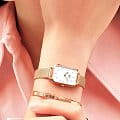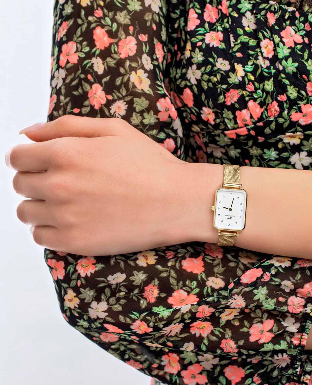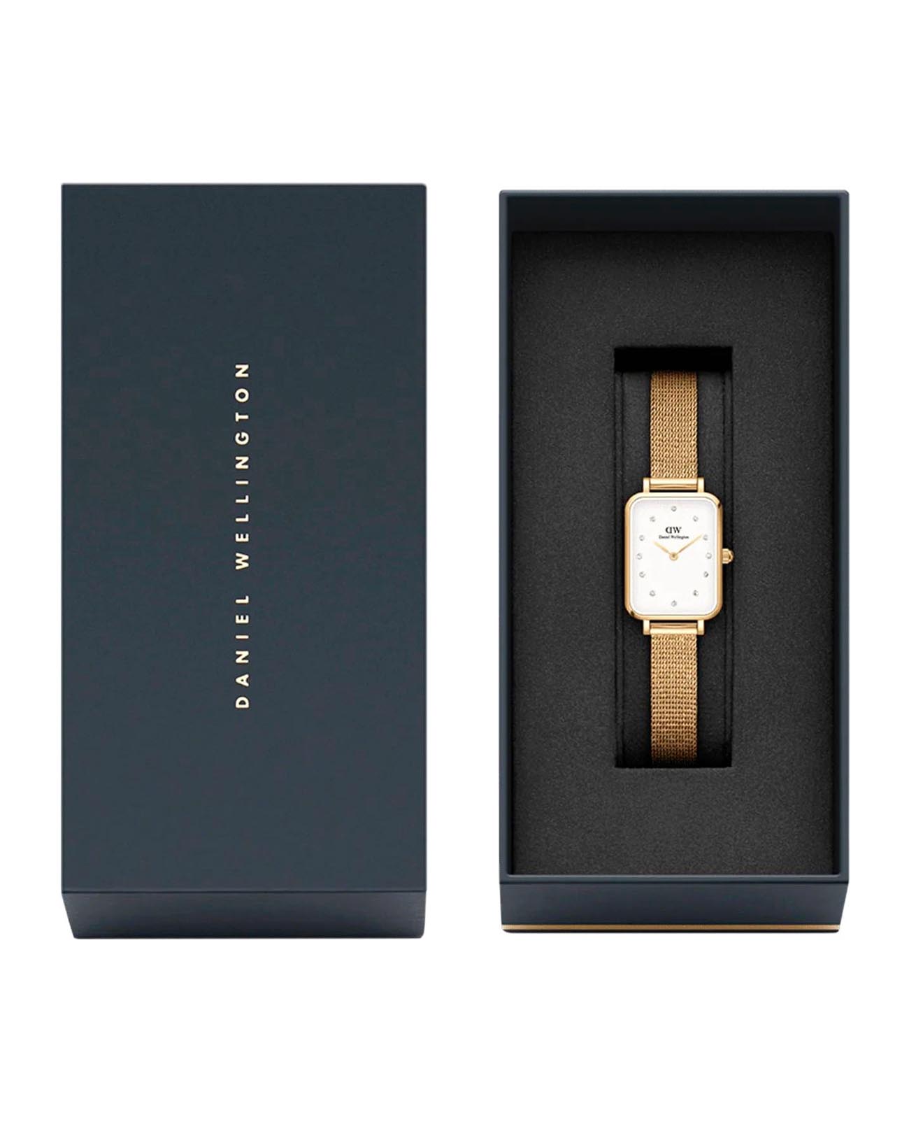 Женские наручные часы с минеральным стекломМинеральное стеклоМинеральное стекло представляет собой искусственно выращенный минерал кварца. Такое стекло отличается особой устойчивостью к повреждениям и царапинам. Уступает по некоторым качествам сапфировому стеклу. Daniel Wellington Quadro DW00100599, кварцевый механизм с высокой точностью. Корпус часов изготовлен из стали с PVD-покрытиемPVDУльтратонкое покрытие наносится в технике вакуумного напыления, сочетает в себе нитрид титана особой прочности со слоем золота или оксида хрома. Несёт в себе декоративную или защитную функцию.. Циферблат украшен фирменным логотипом Daniel Wellington и 12 кристаллами Swarovski. Накладные метки в виде штрихов. Рифленая заводная головка. Класс водозащиты: 30 метров, позволит защитить корпус от случайных брызг или капель дождя. Стальной браслет миланского плетения с PVD-покрытиемPVDУльтратонкое покрытие наносится в технике вакуумного напыления, сочетает в себе нитрид титана особой прочности со слоем золота или оксида хрома. Несёт в себе декоративную или защитную функцию. на раскладном замкеРаскладной замокДанный вариант застежки используется только на часах с металлическим браслетом. Отличительная особенность такого крепления в том, что длина браслета становится универсальной и вы можете самостоятельно отрегулировать нужный вам размер – застежка просто двигается по браслету часов..