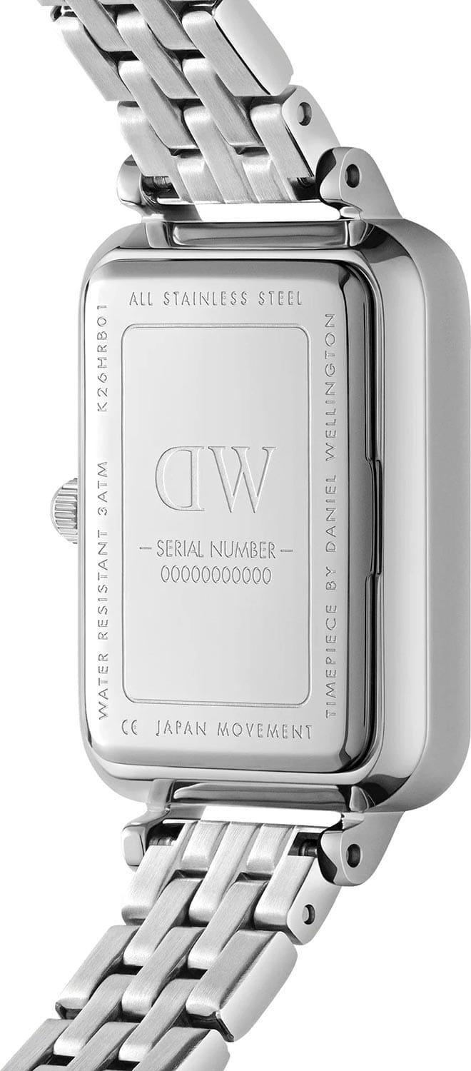 Женские наручные часы с минеральным стекломМинеральное стеклоМинеральное стекло представляет собой искусственно выращенный минерал кварца. Такое стекло отличается особой устойчивостью к повреждениям и царапинам. Уступает по некоторым качествам сапфировому стеклу. Daniel Wellington Quadro Roman Numerals 5-Link Silver DW00100691, кварцевый механизм с высокой точностью. Корпус часов изготовлен из нержавеющей стали 316L серебряного цвета. Циферблат с аккуратными римскими индексами. Японский кварцевый механизм. Рифленая заводная головка. Класс водозащиты: 30 метров, позволит защитить корпус от случайных брызг или капель дождя. Стальной браслет на застежке бабочкеЗастёжка "бабочка"Такой вид застёжки дополняется предохранителями, помогающими избежать случайного раскрытия браслета. Обладают изящным исполнением. обеспечивает комфорт в использовании.