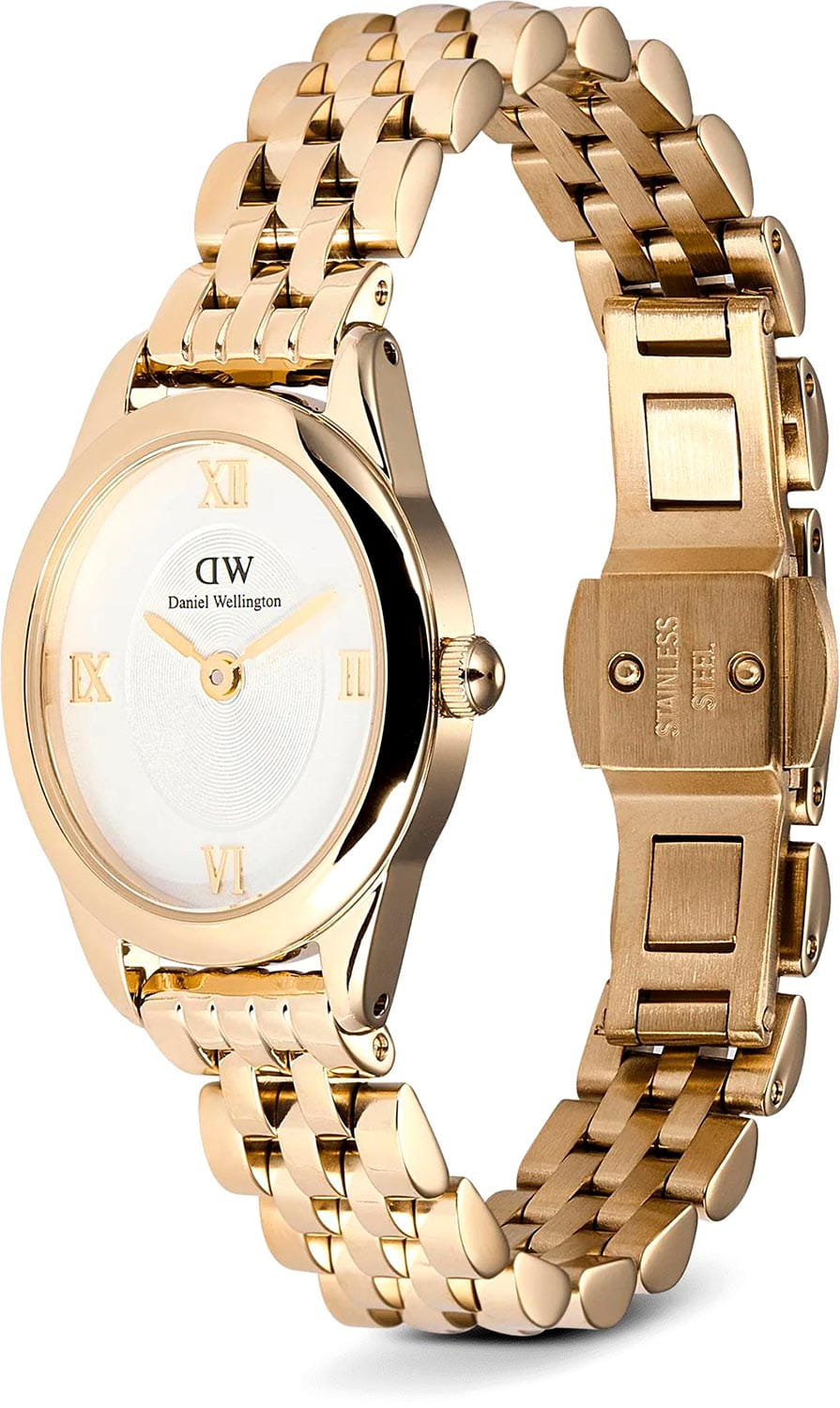 Daniel Wellington Ophelia — женственные часы с овальным корпусом 22 мм из нержавеющей стали с изящным PVDPVDУльтратонкое покрытие наносится в технике вакуумного напыления, сочетает в себе нитрид титана особой прочности со слоем золота или оксида хрома. Несёт в себе декоративную или защитную функцию.-покрытием в цвете золота. Глубокий циферблат с радиальным переливом украшен римскими индексами, что придаёт образу классическую элегантность.